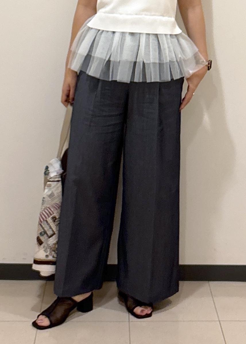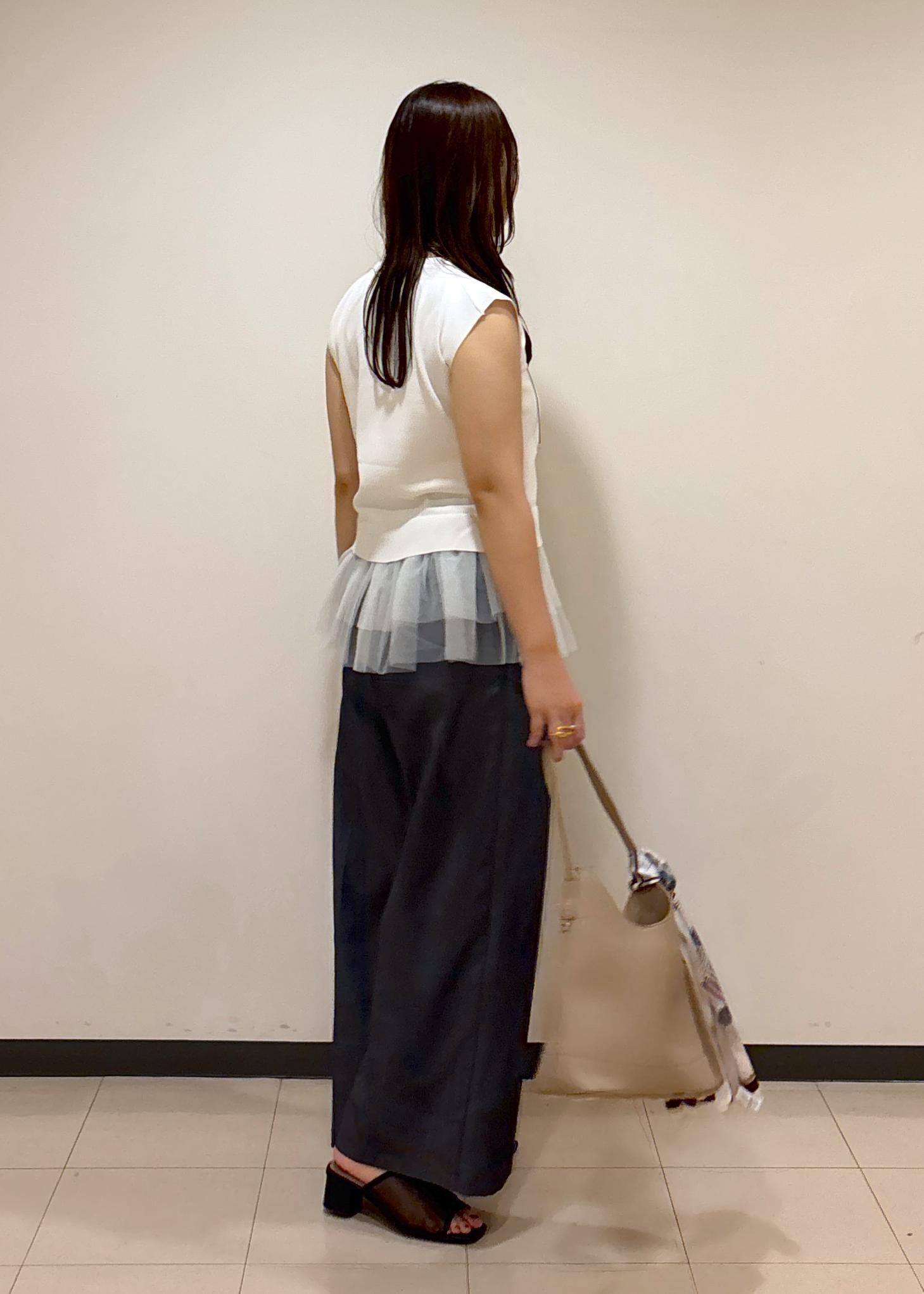 骨格ウェーブで下重心になりがちですが、トップスにデザインがあり、上に目線がいくのでスタイルアップしやすいコーデ。