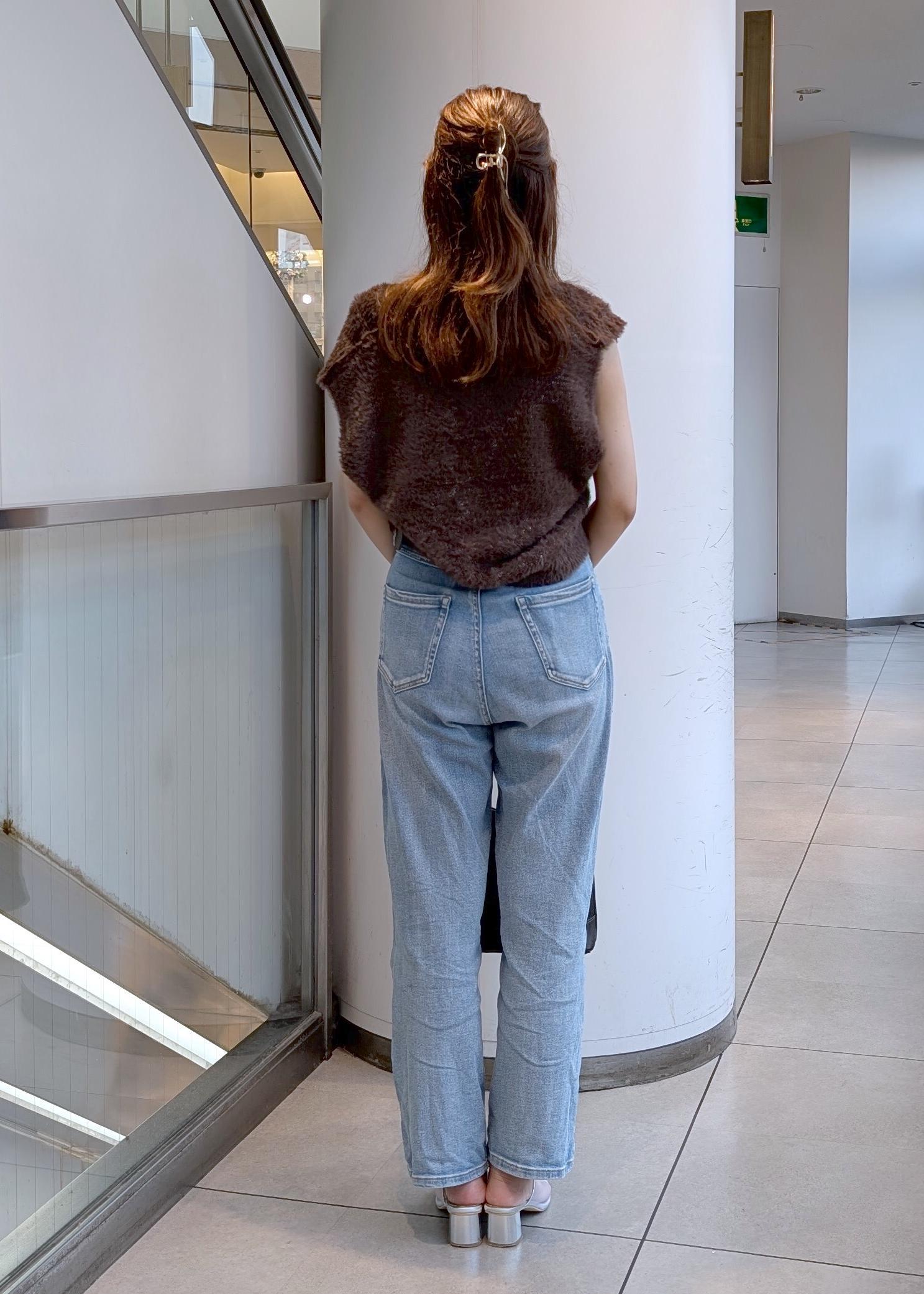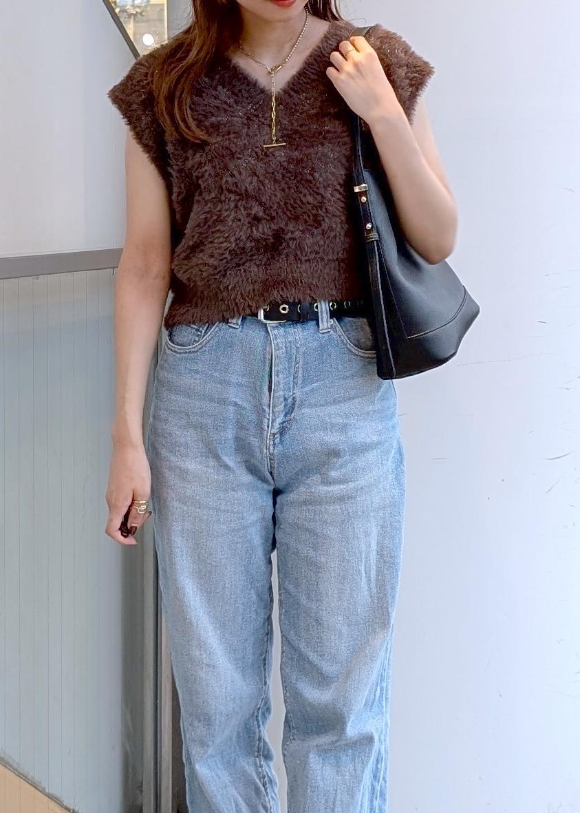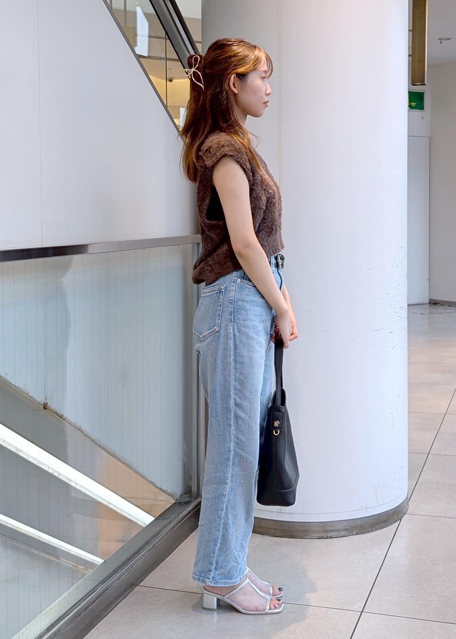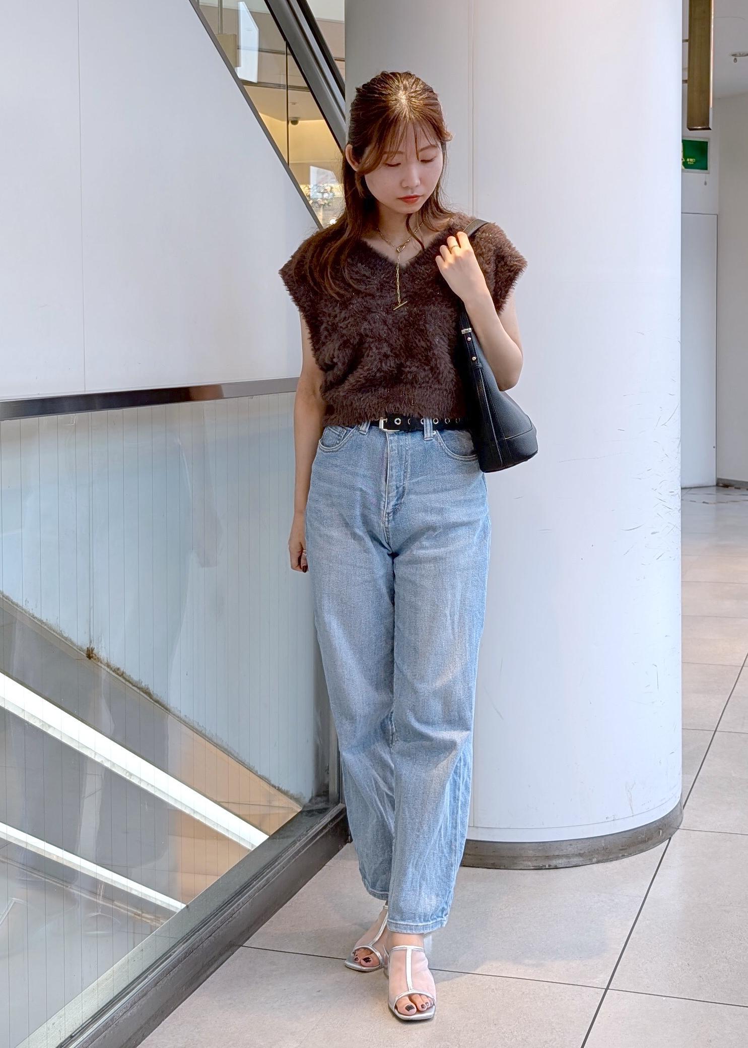 ショート丈のフェザーベストがトレンド感を出してくれます。暑い日にはノースリーブ、秋頃にはTシャツやカットソーなどインナーを変えるだけで色々なスタイルが楽しめます!