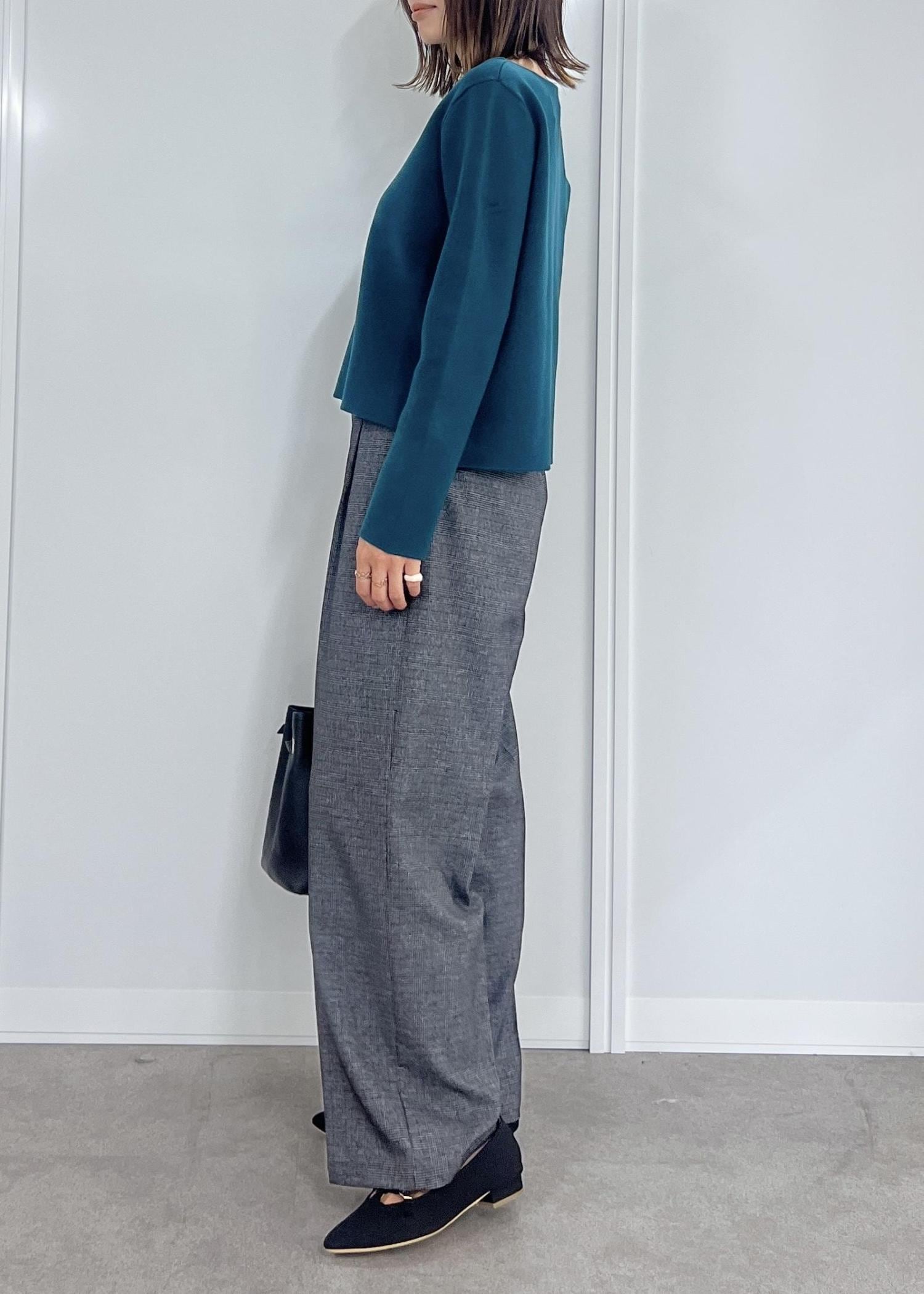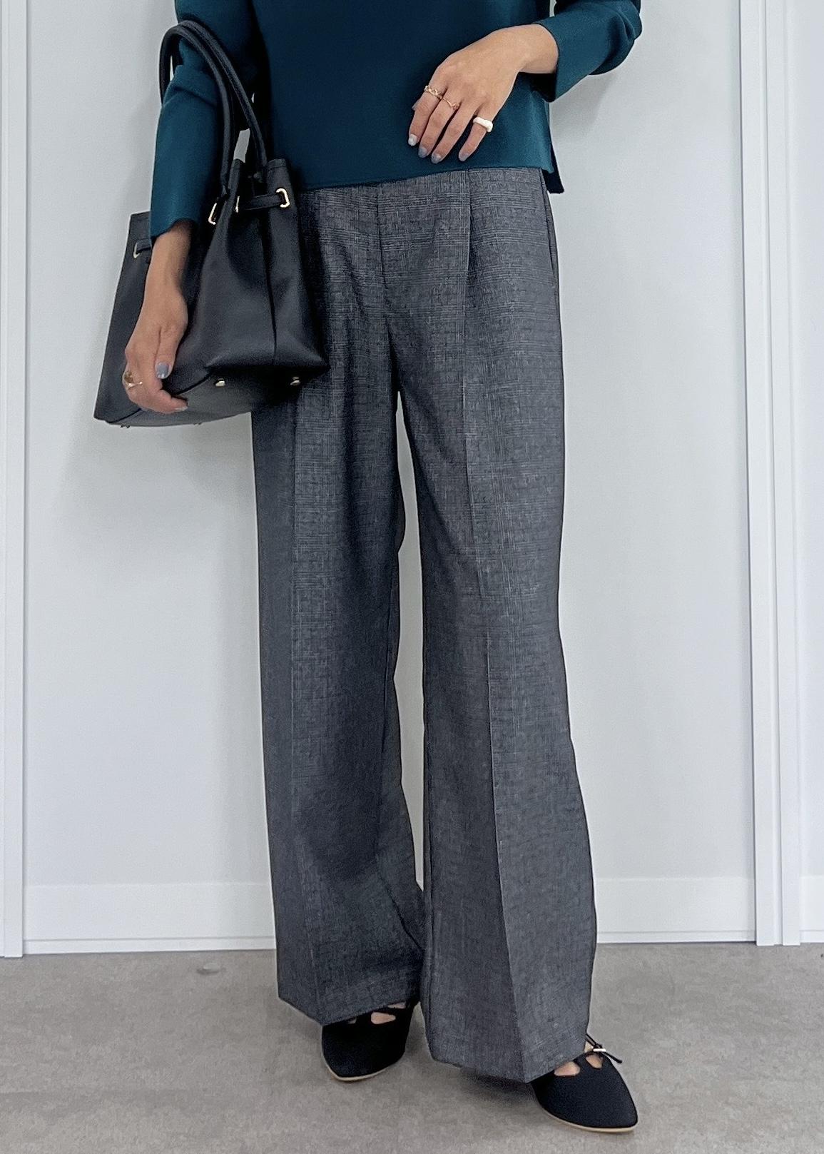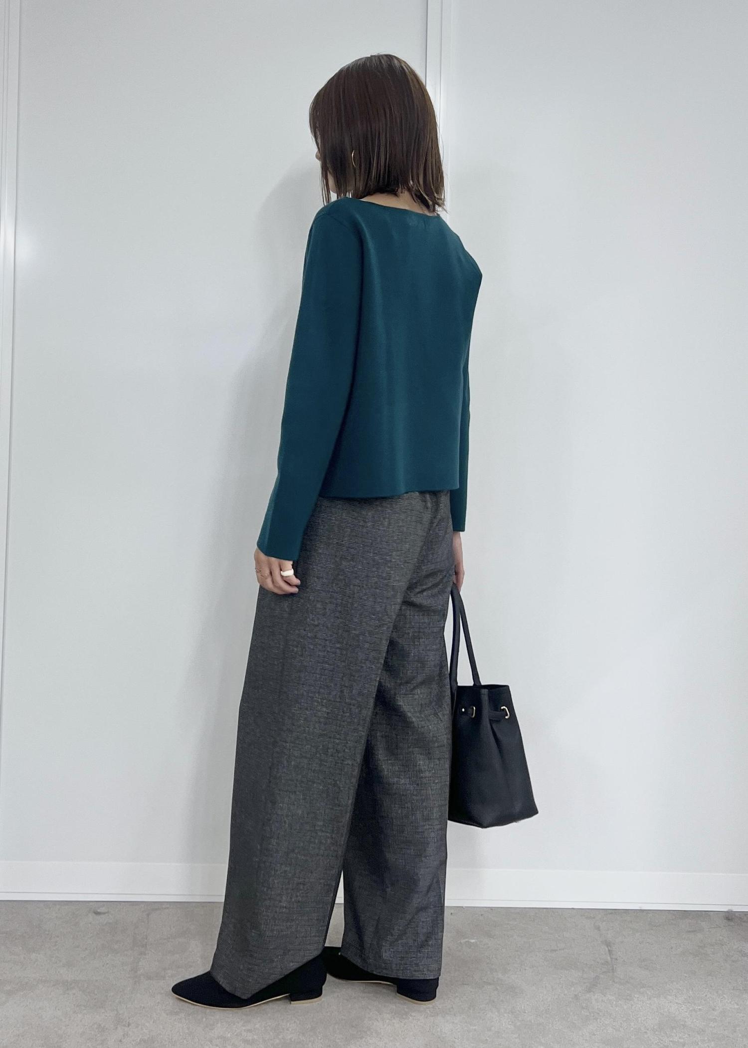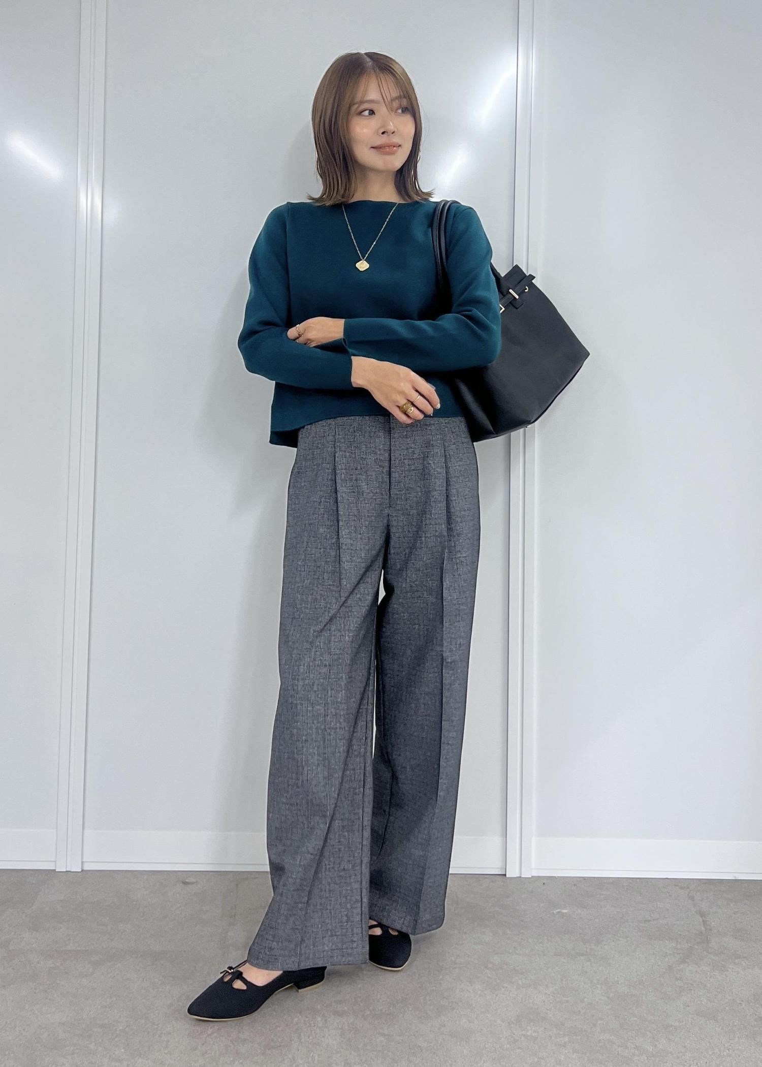 深みのあるグリーンには、チェック柄のウールライクパンツを合わせて秋冬コーデに。