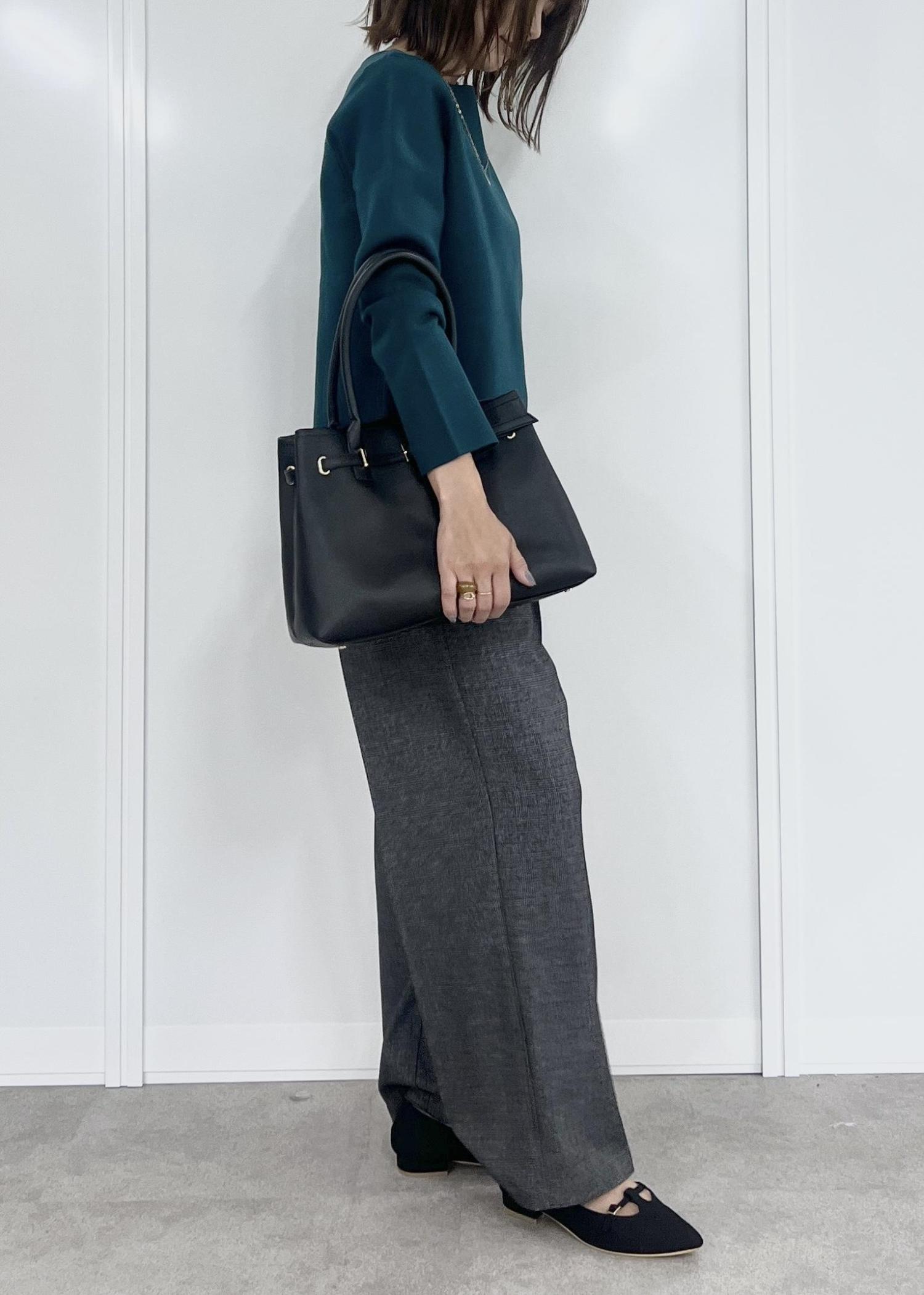 お仕事や学校行事にも着られるきれいめバッグとパンプスを合わせて、大人スタイルにしました。