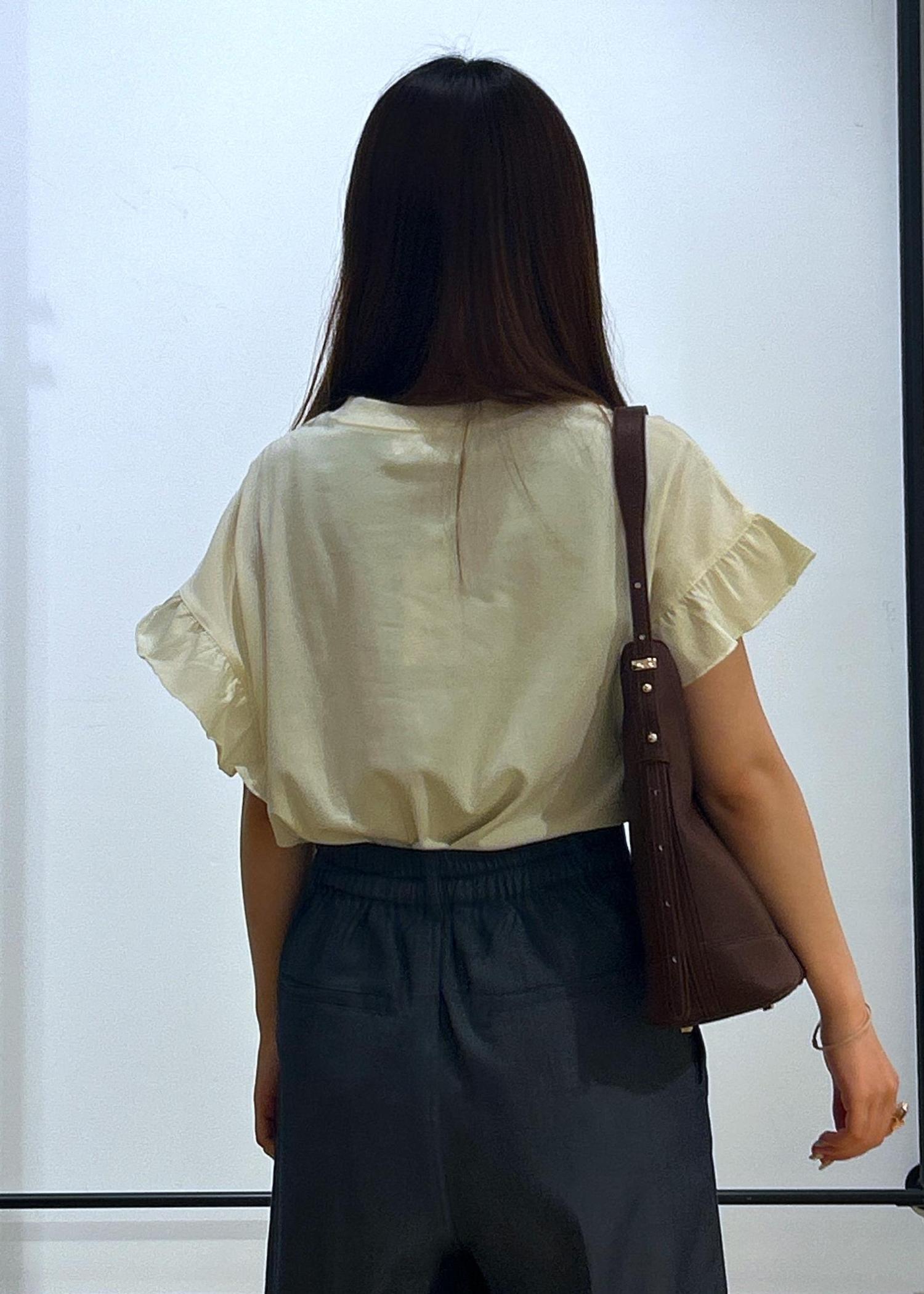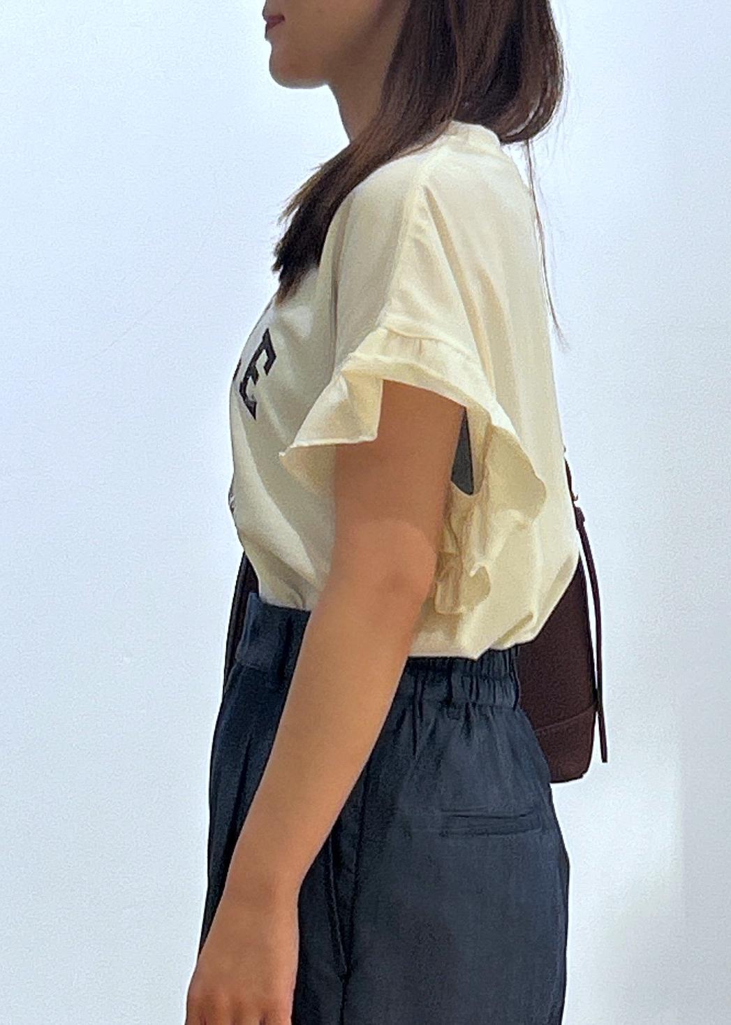 袖フリルデザインTシャツを使って、少し甘めなカジュアルコーデにしました。