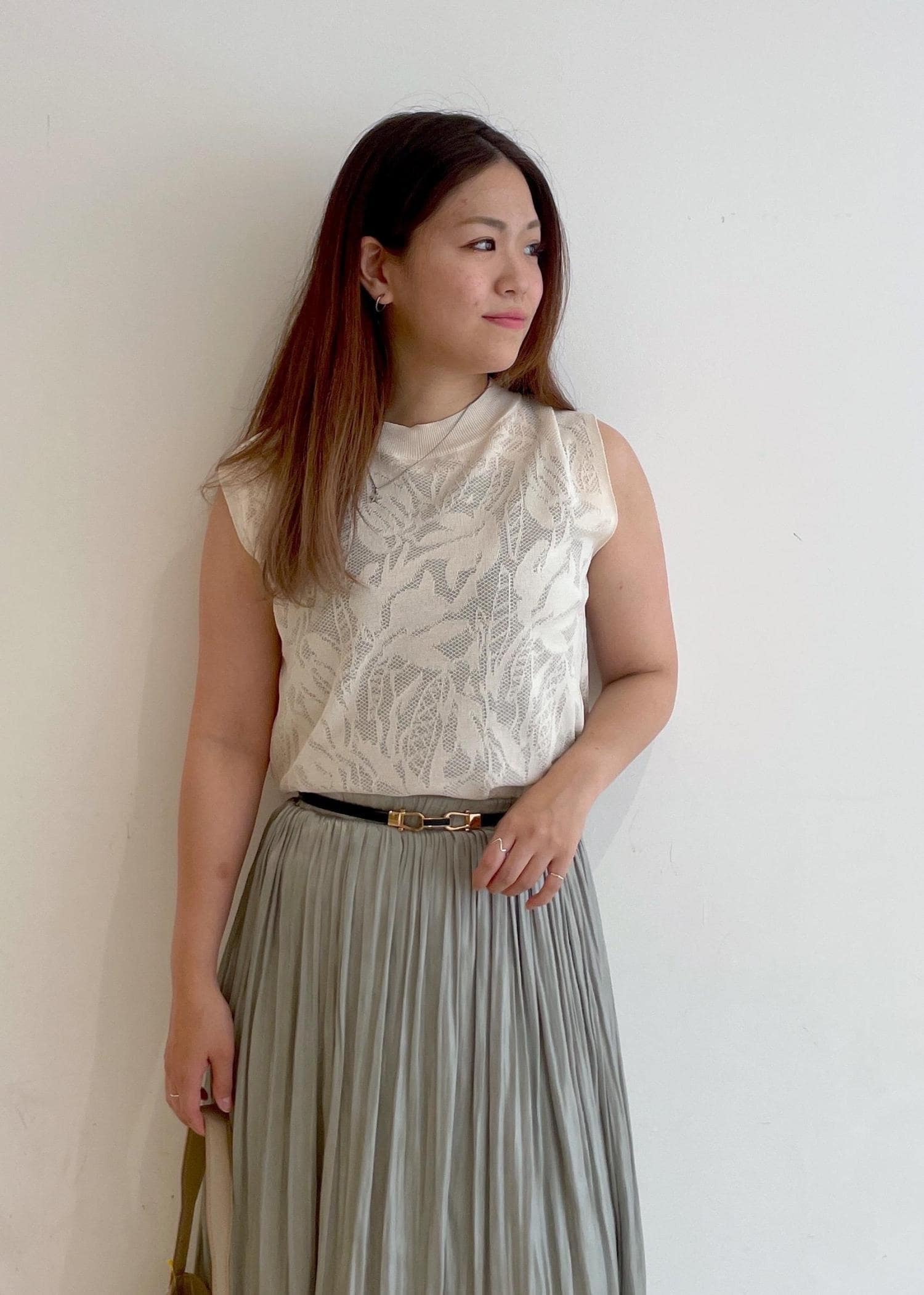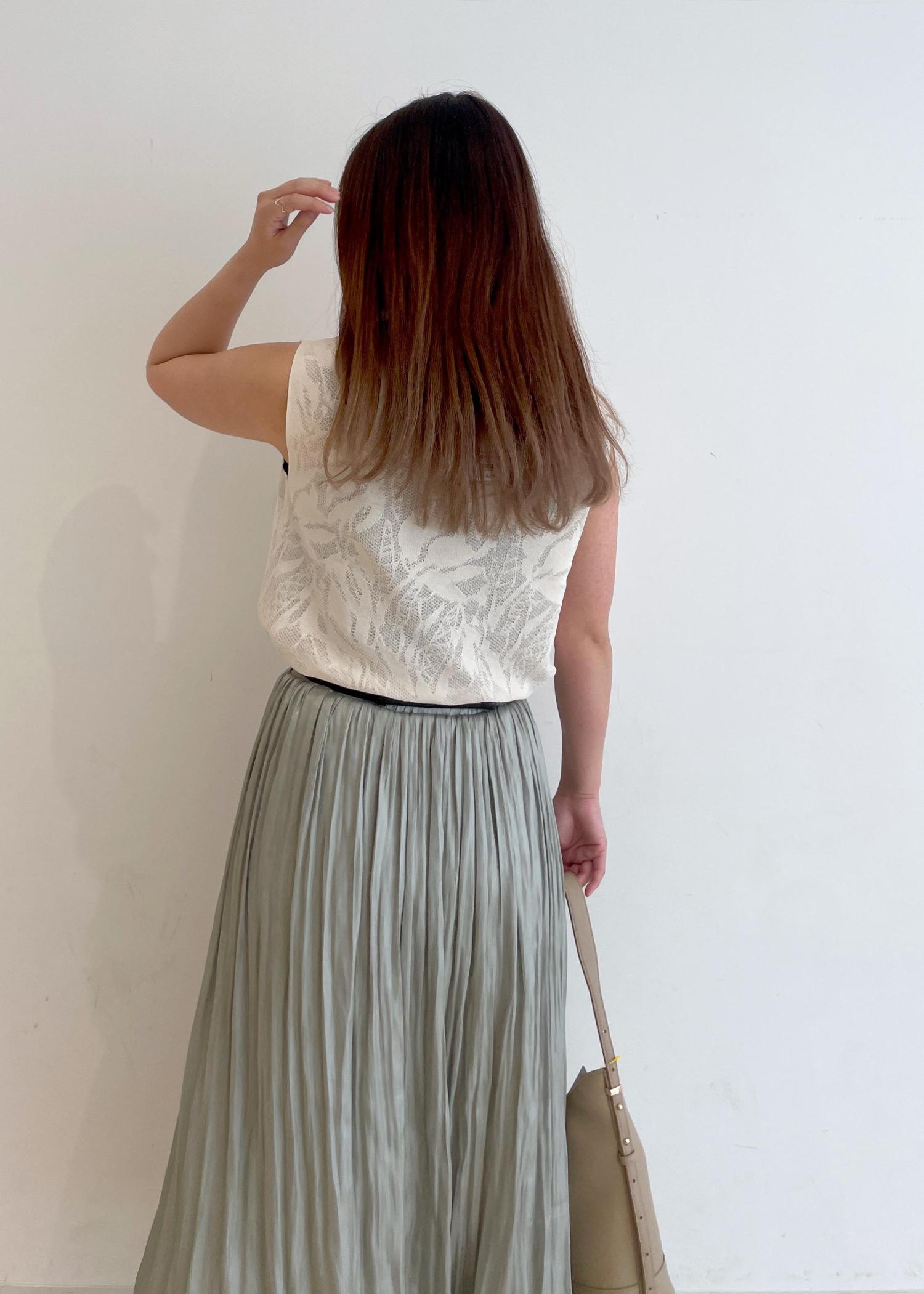 上品なレーストップスに光沢感のあるプリーツスカートを合わせました!