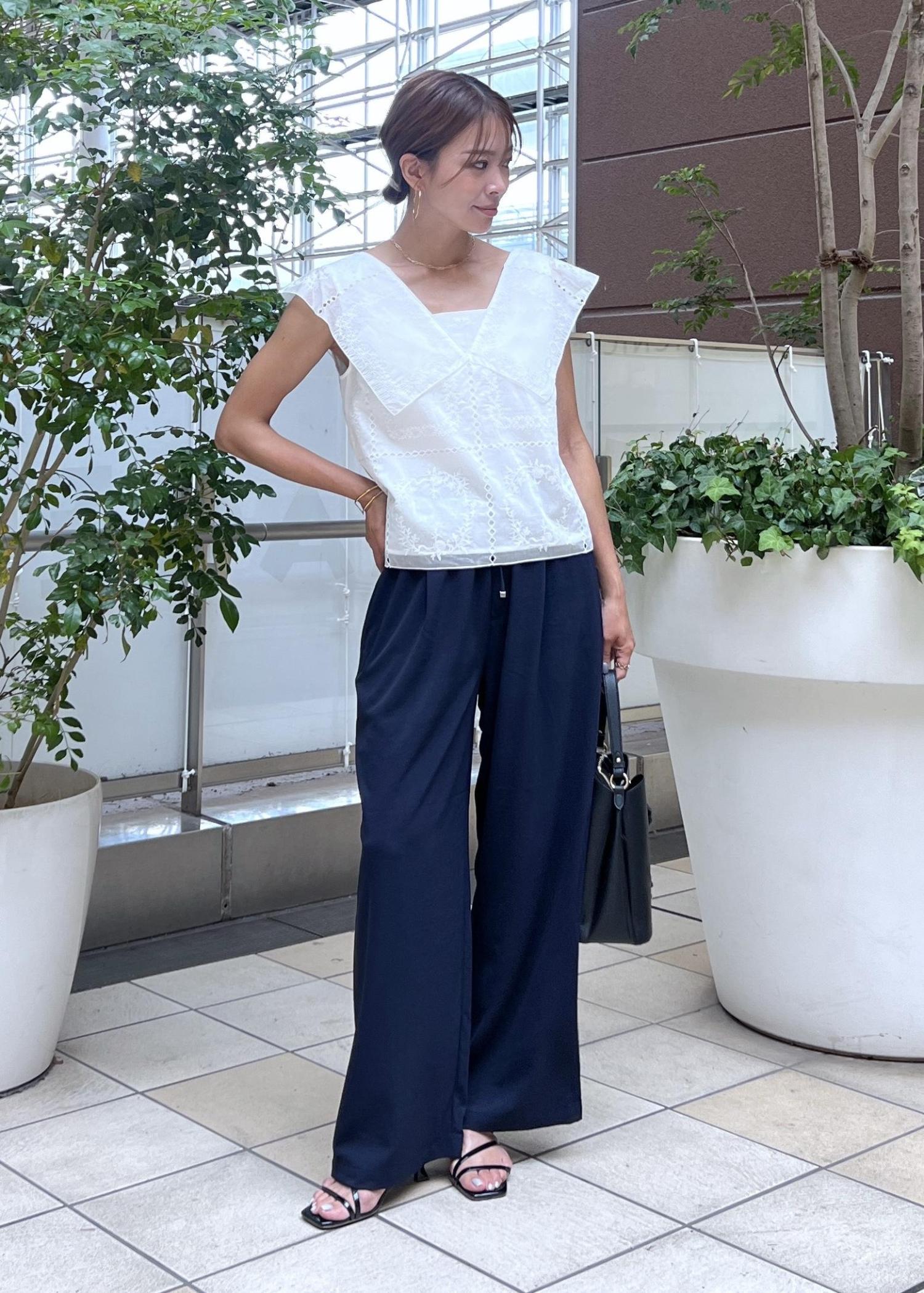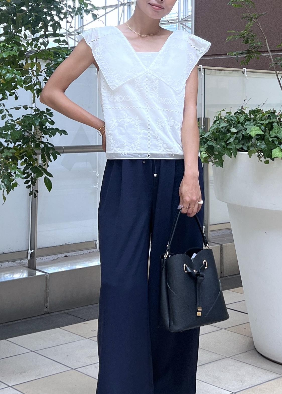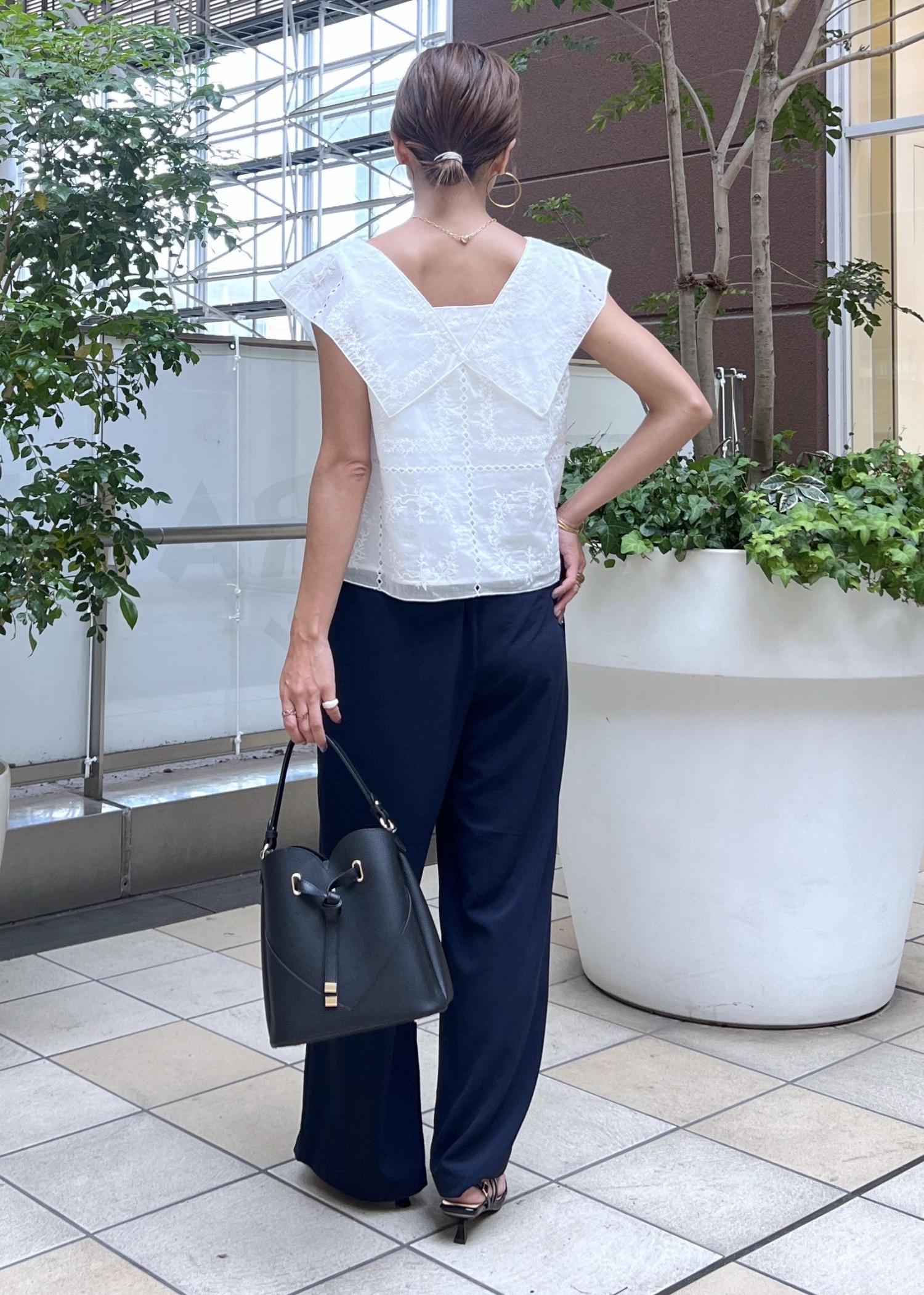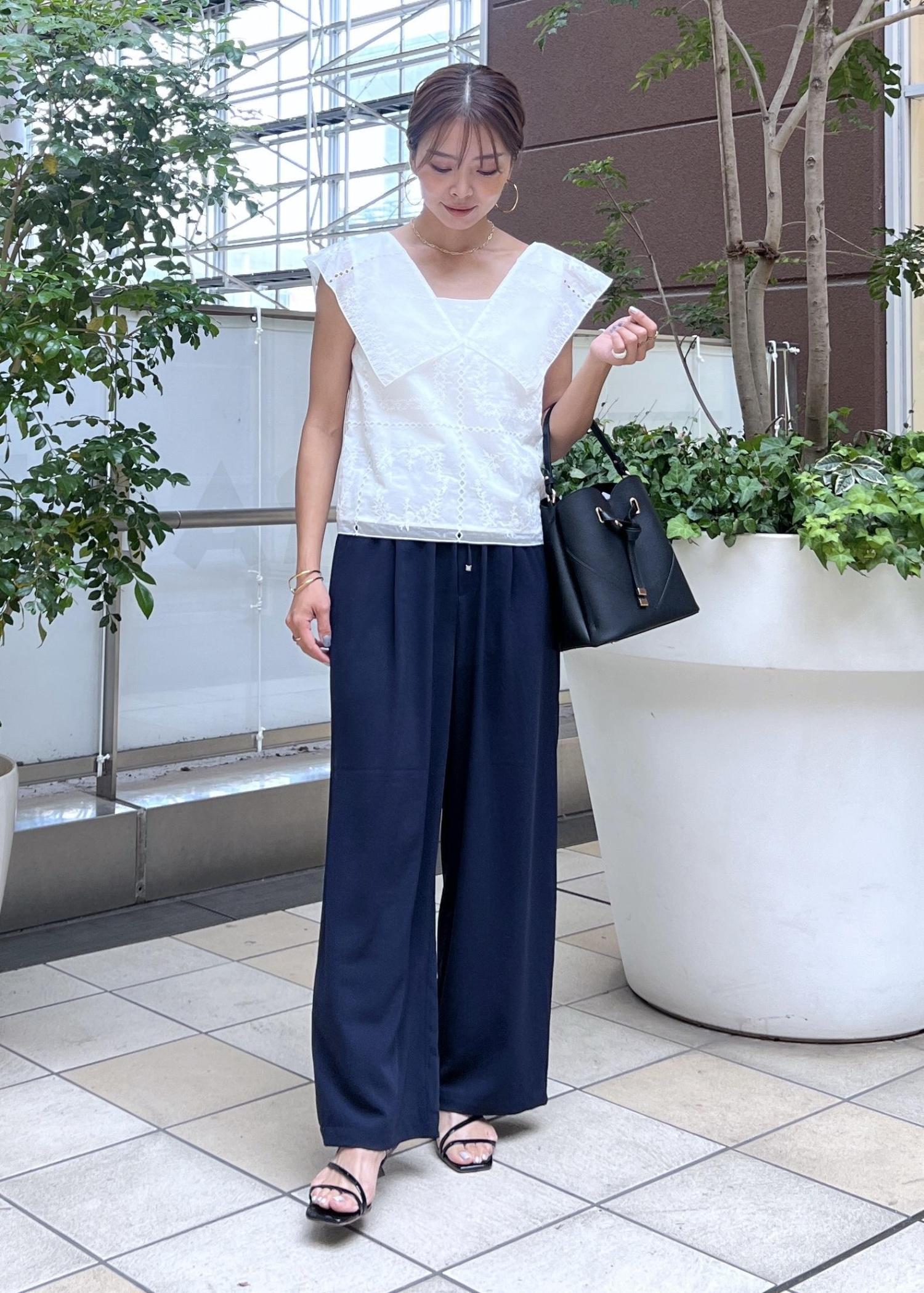 ビックカラーがポイントのブラウスは、モノトーンでまとめてきれいめカジュアルな着こなしも◎。