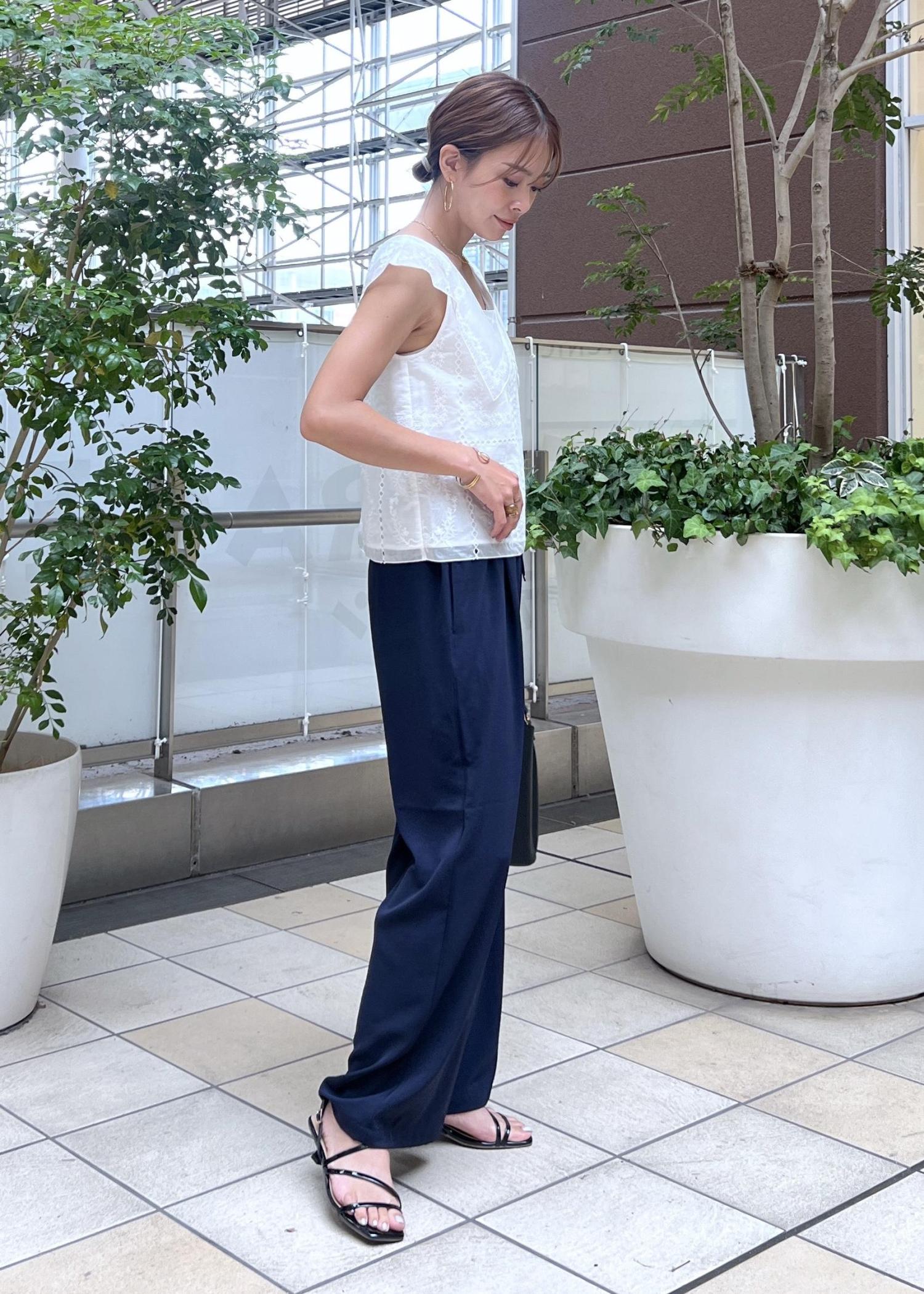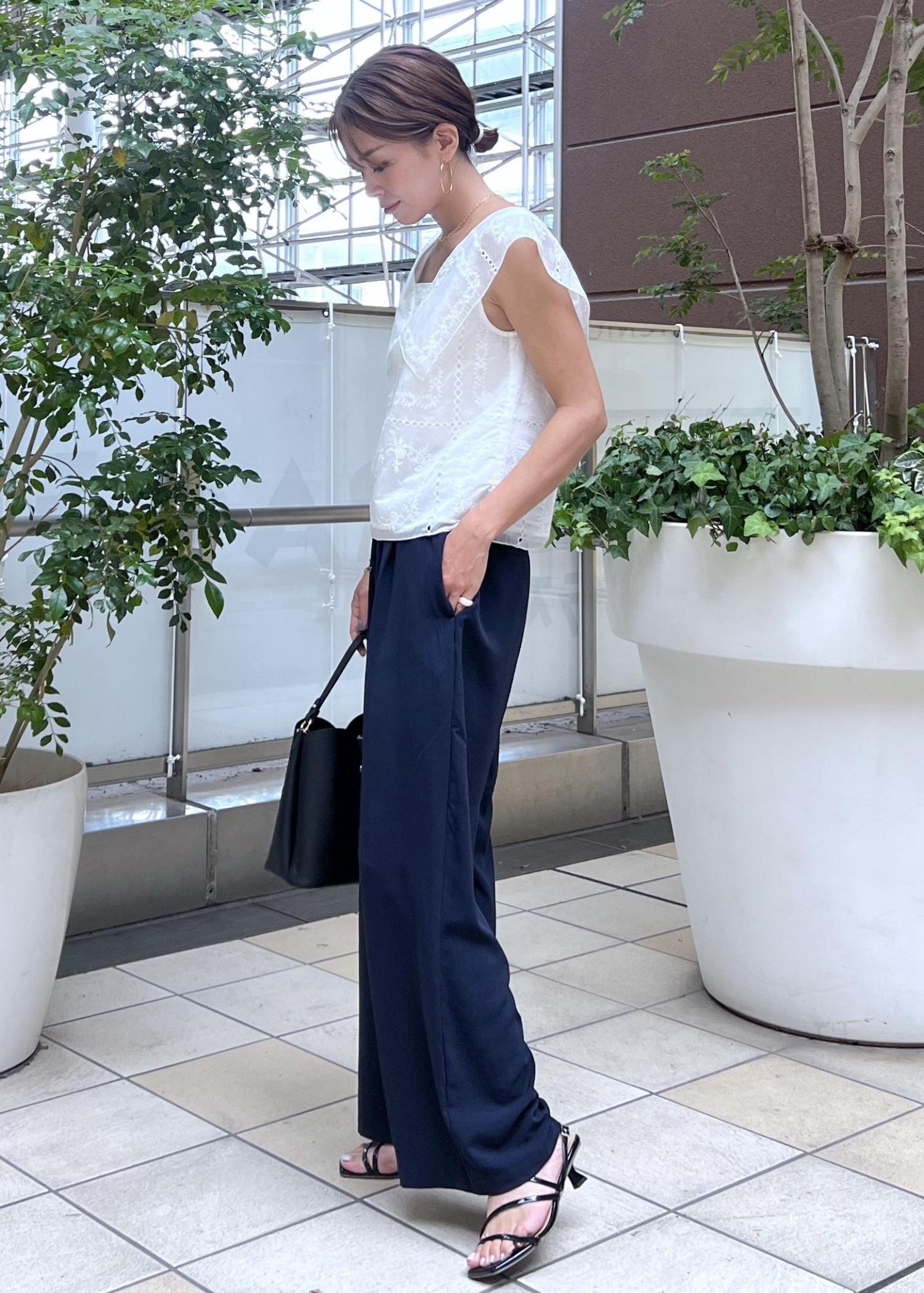 ウエスト総ゴムで締め付け感なく着やすいサイズ感。