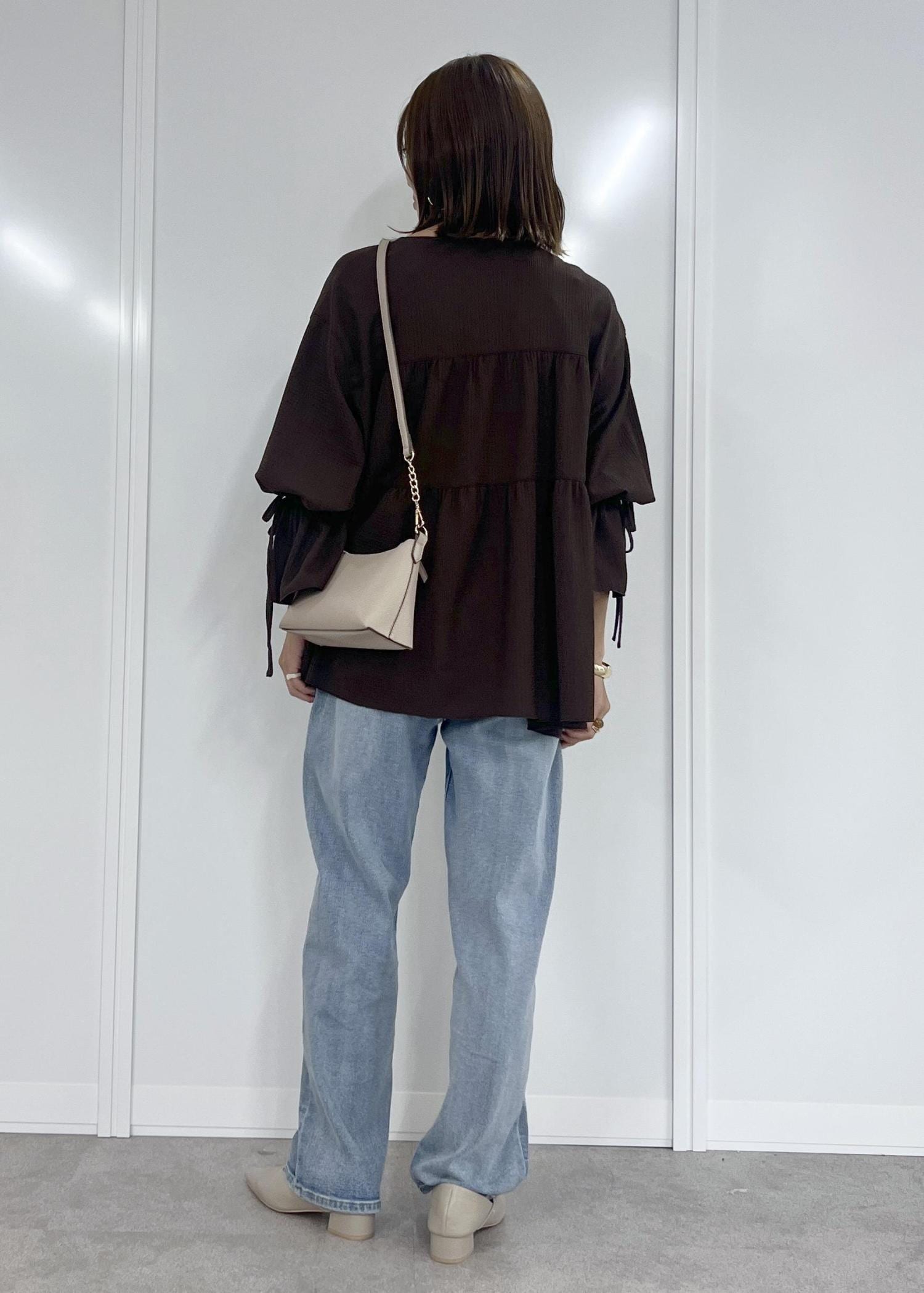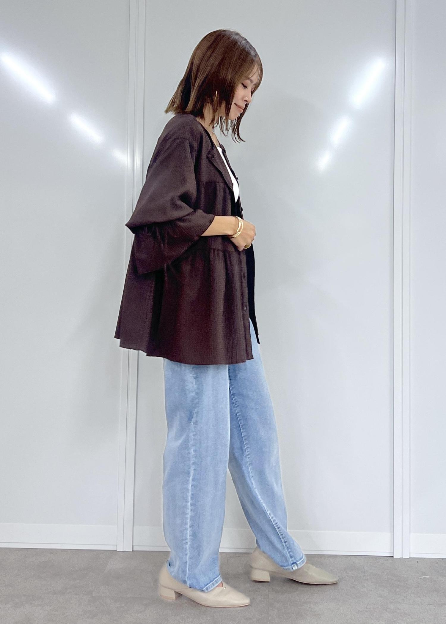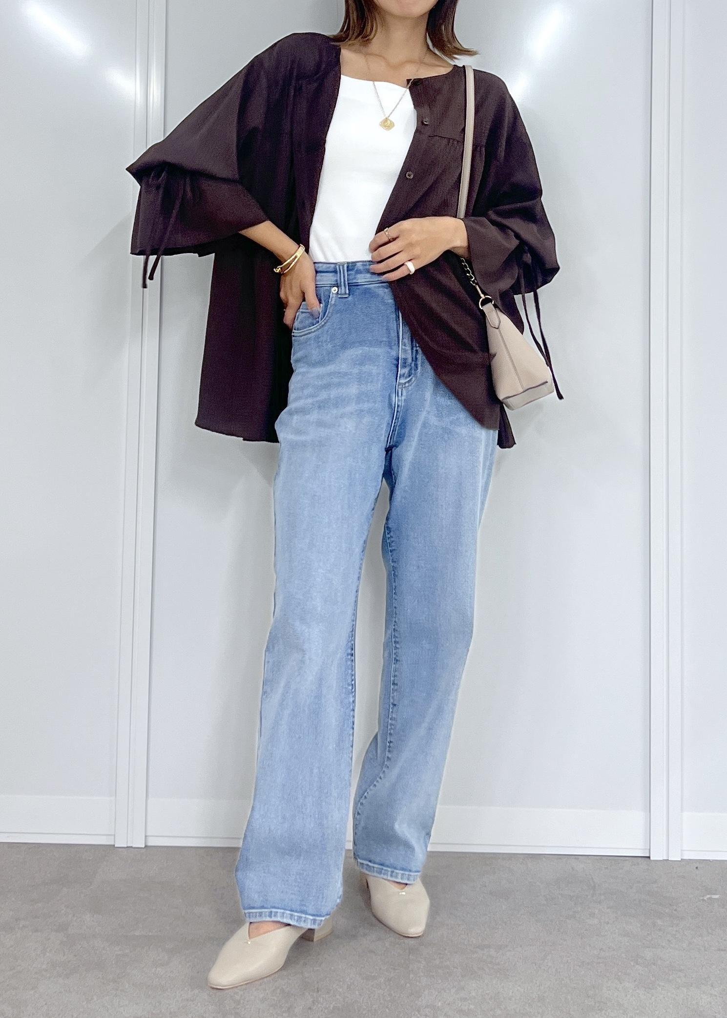 フレア袖がポイントのシャツは、前を開けて羽織にすれば今から秋まで長く着られるコーデに。