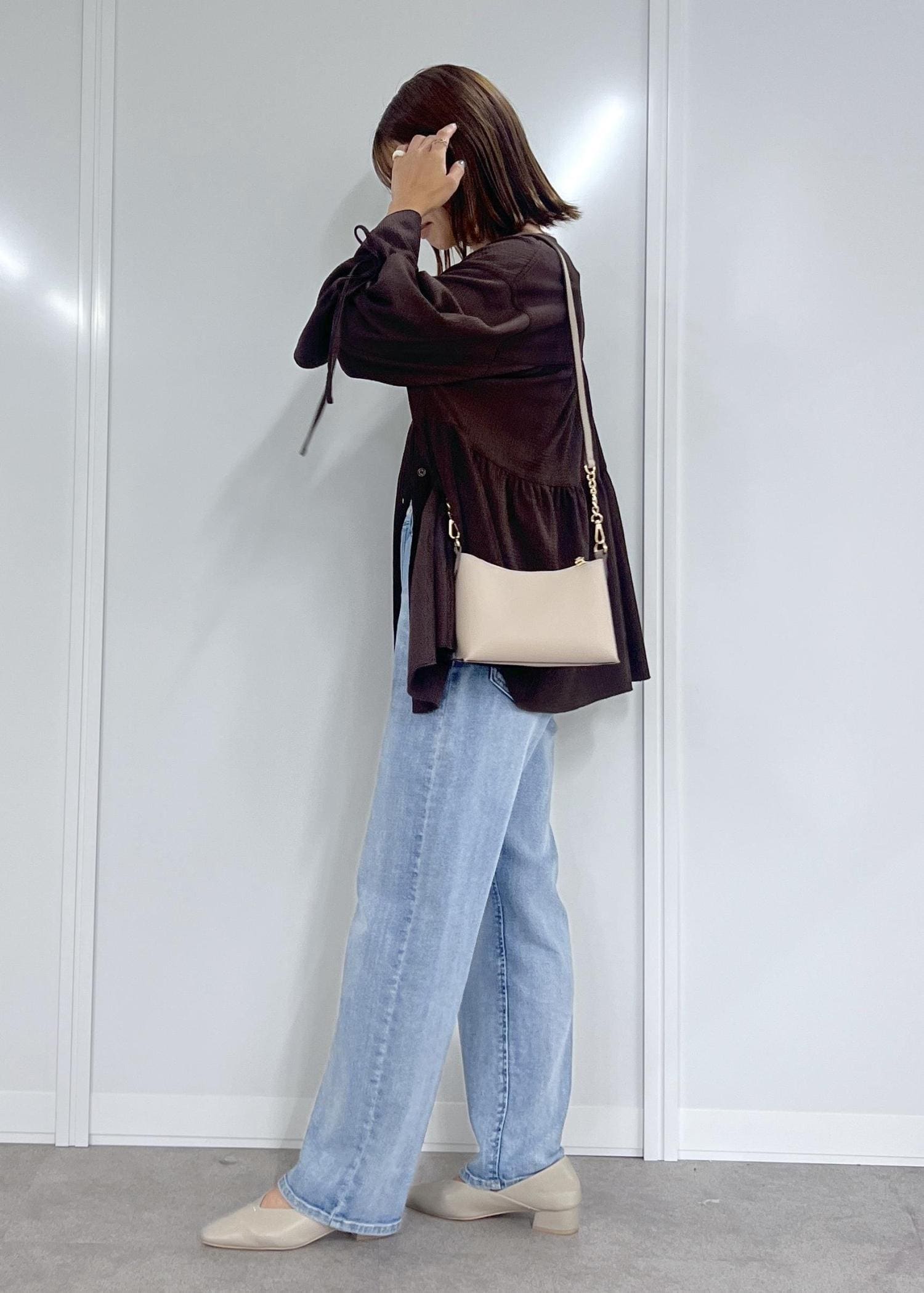 濃いめのブラウンでこなれ感のあるカラーですが、デニムでカジュアルな着こなしもおすすめです。