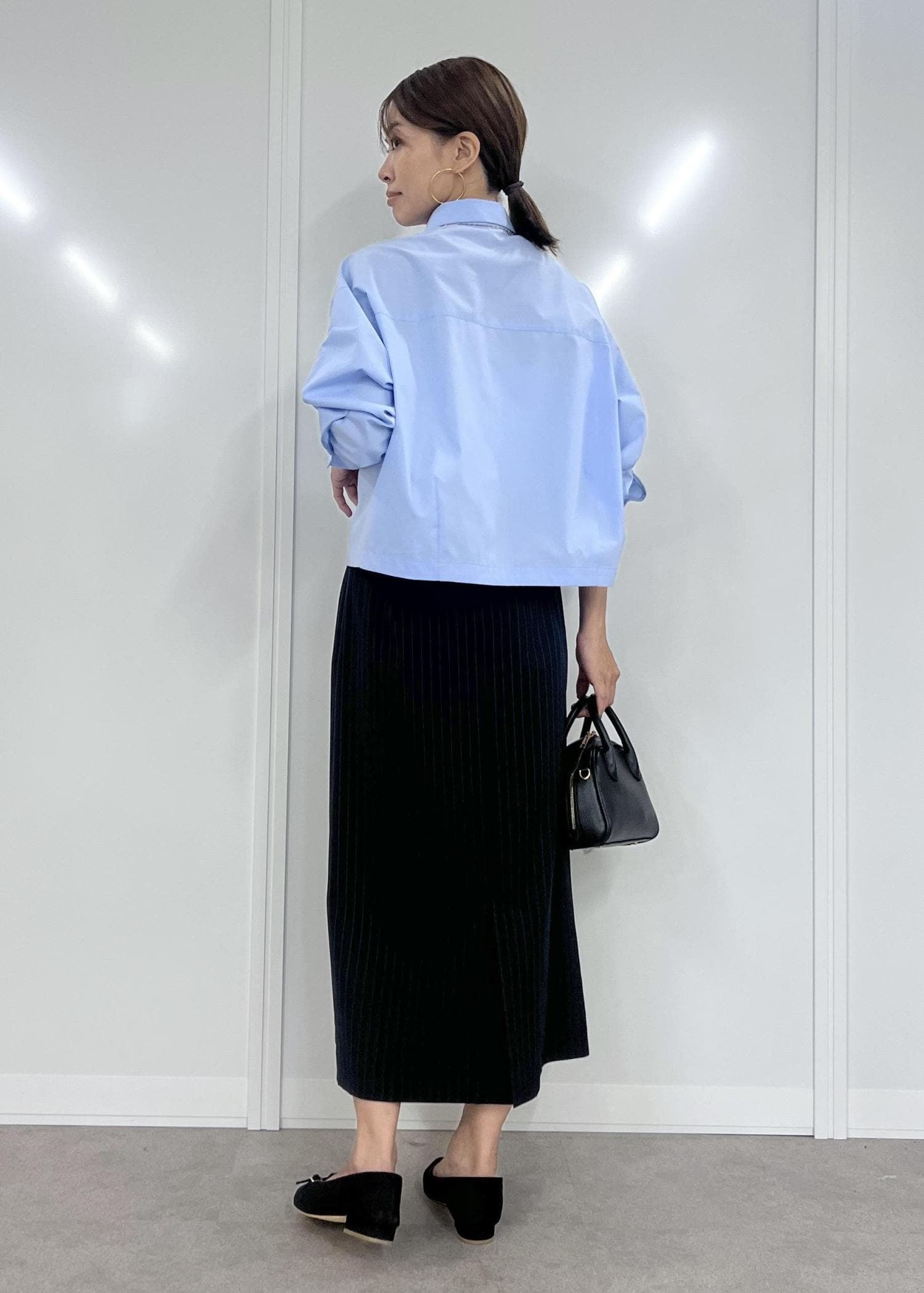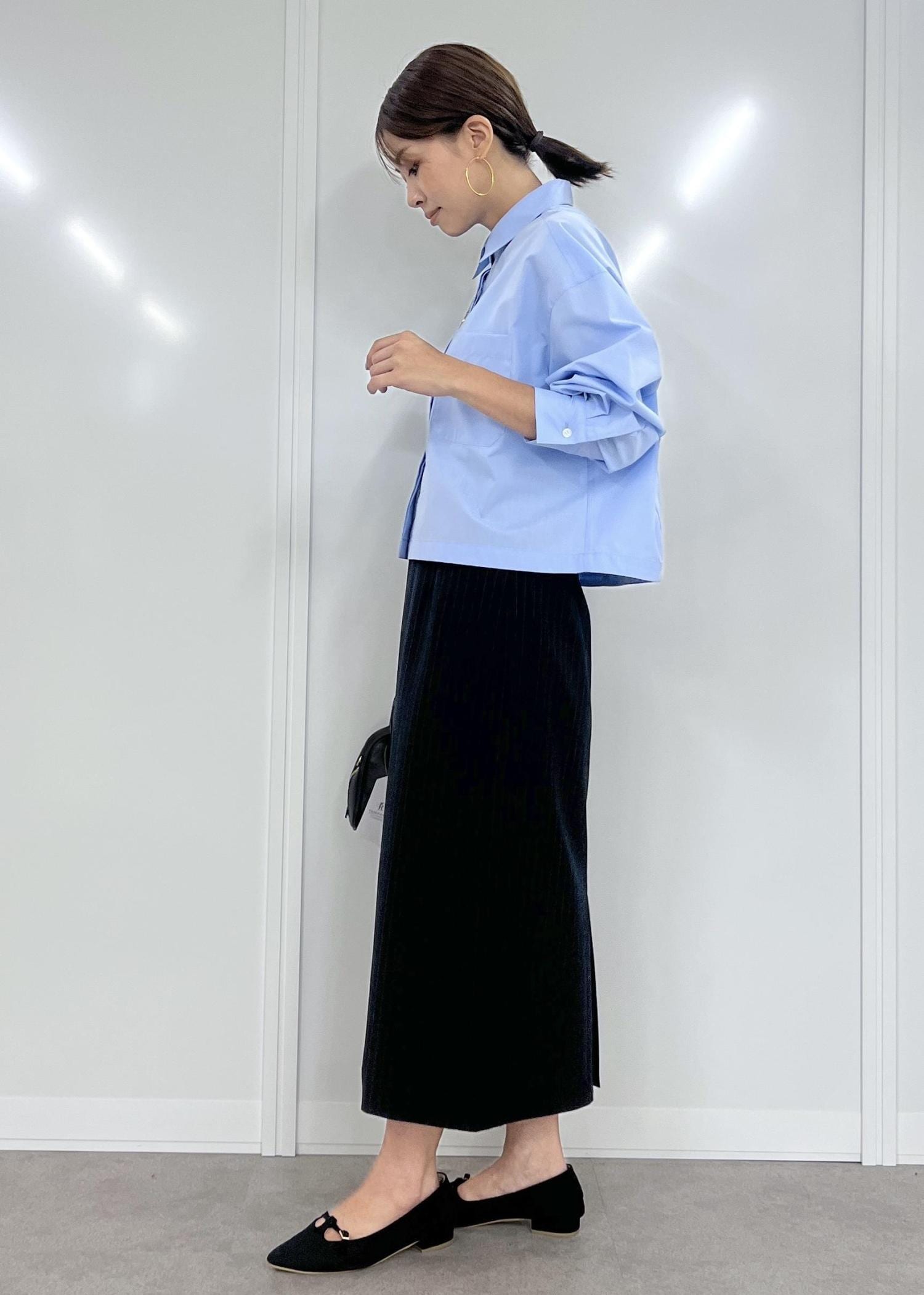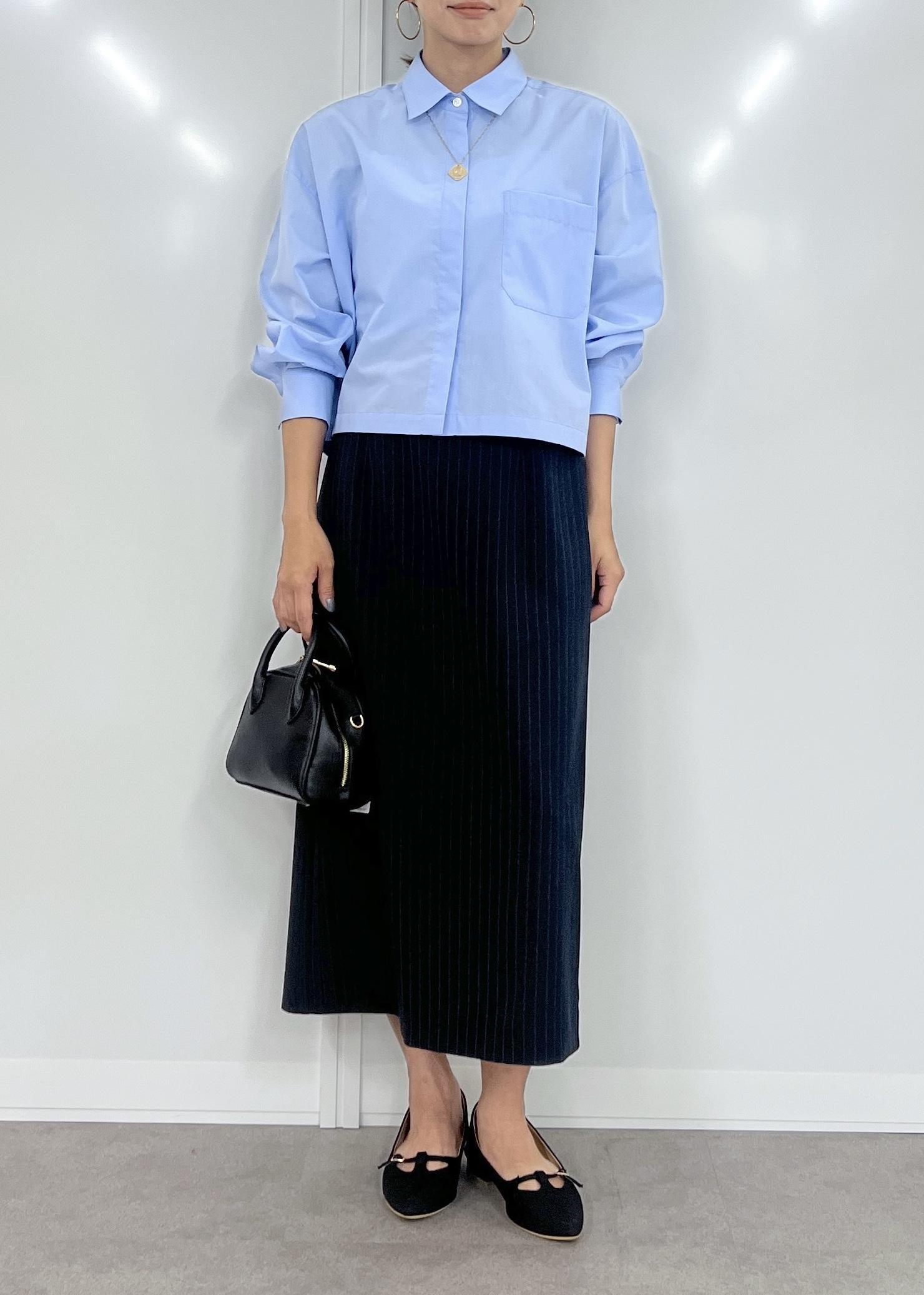ウエストインせずバランス良く合わせやすいクロップド丈のシャツは、スカートにもおすすめ。