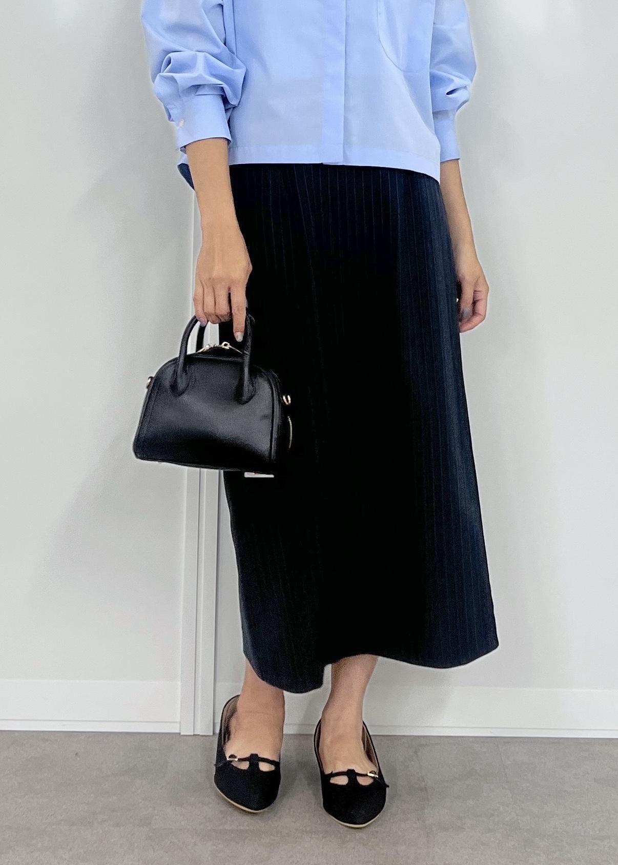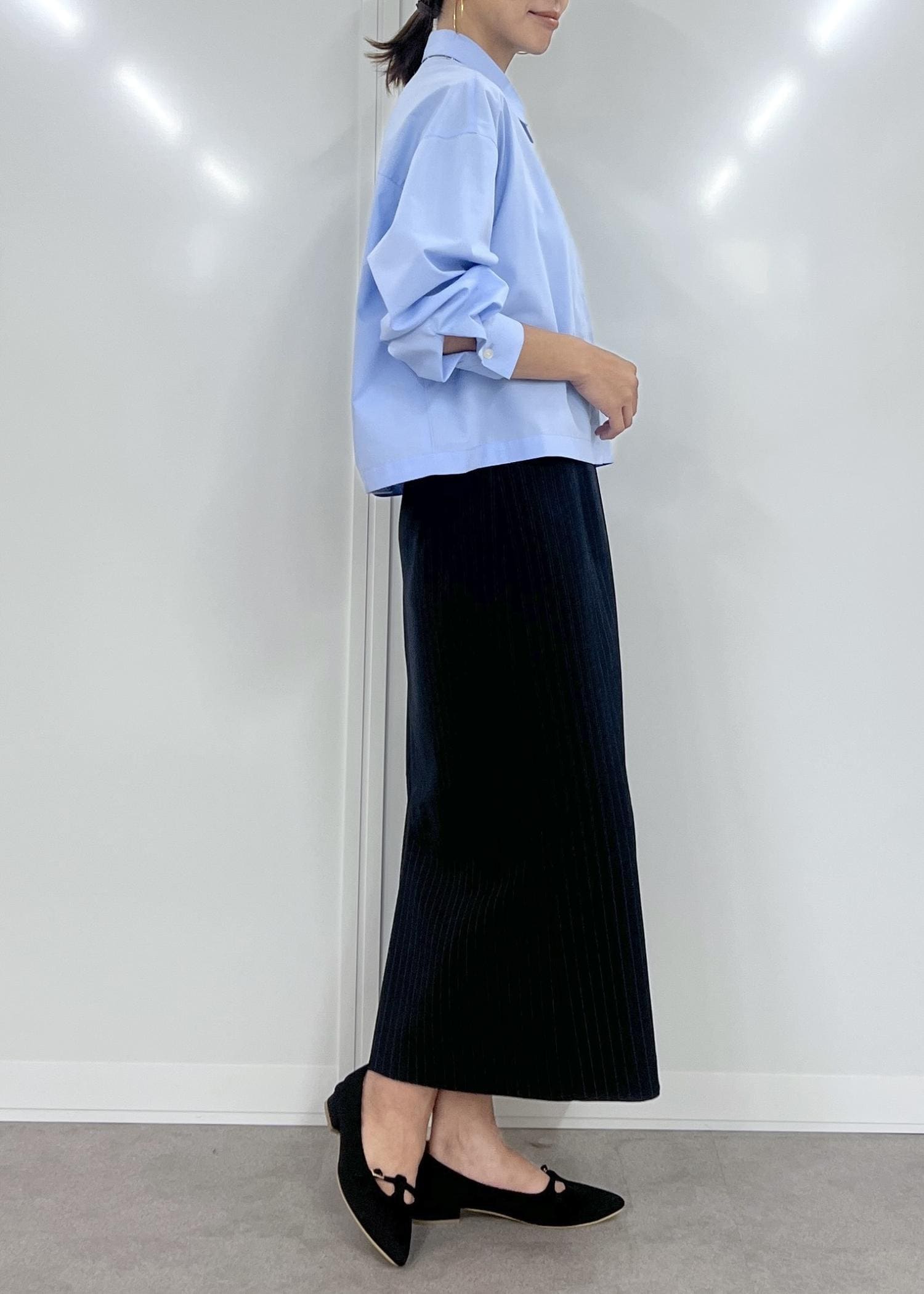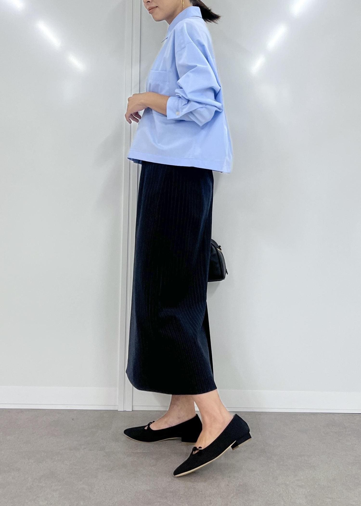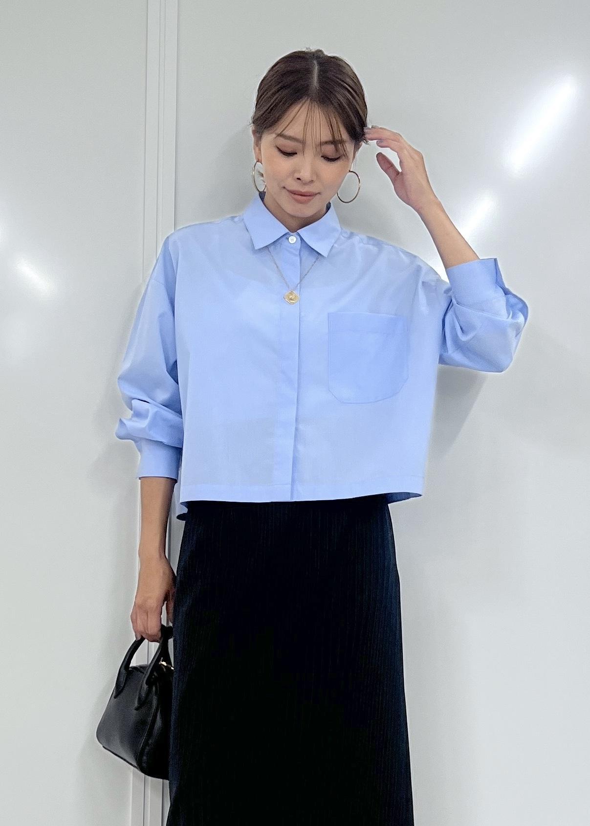 ウエストインせずバランス良く合わせやすいクロップド丈のシャツは、スカートにもおすすめ。