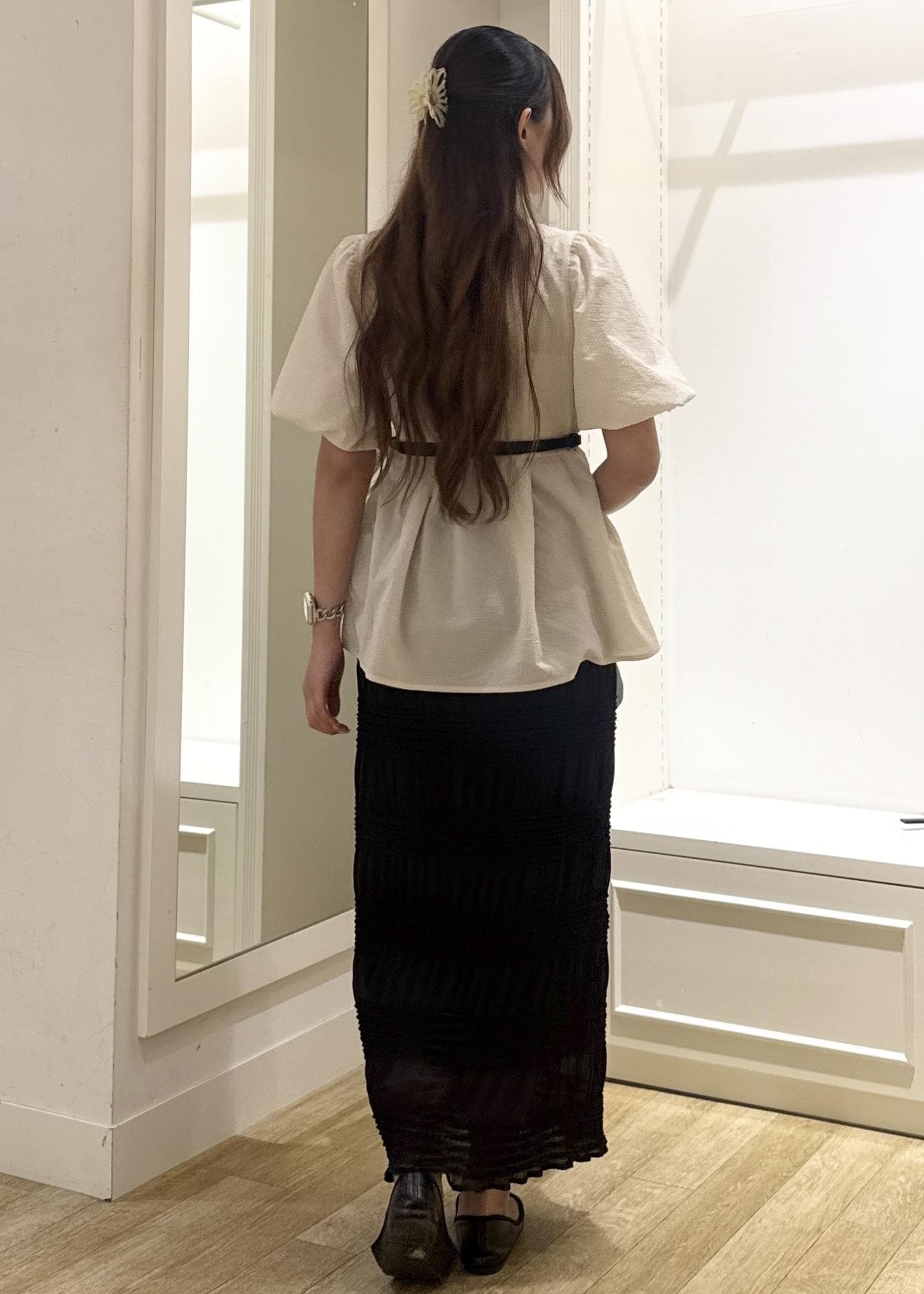 今回はバルーンペプラムブラウスで体型カバーをしつつ、メリハリをつけるためにウエスト部分にベルトをしてみました。