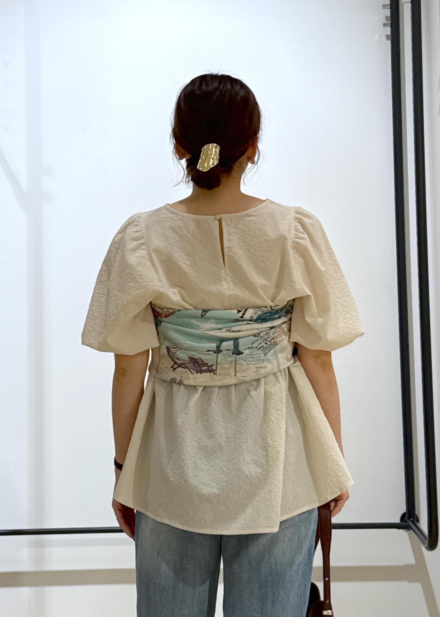 薄手で凹凸感のある素材なので肌離れよく、とても軽い着心地のブラウスです。シワになりにくい素材感です。