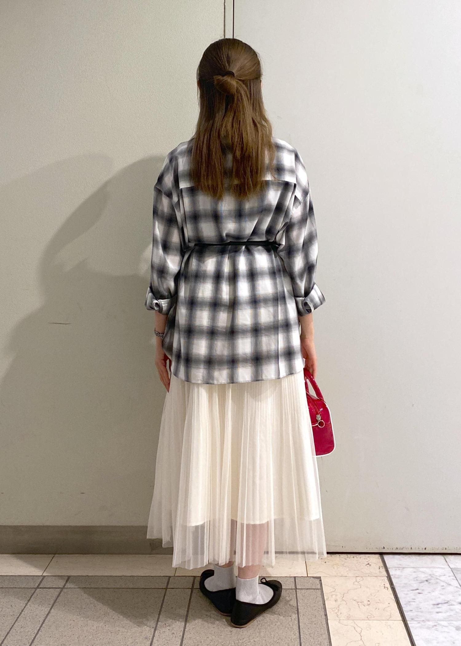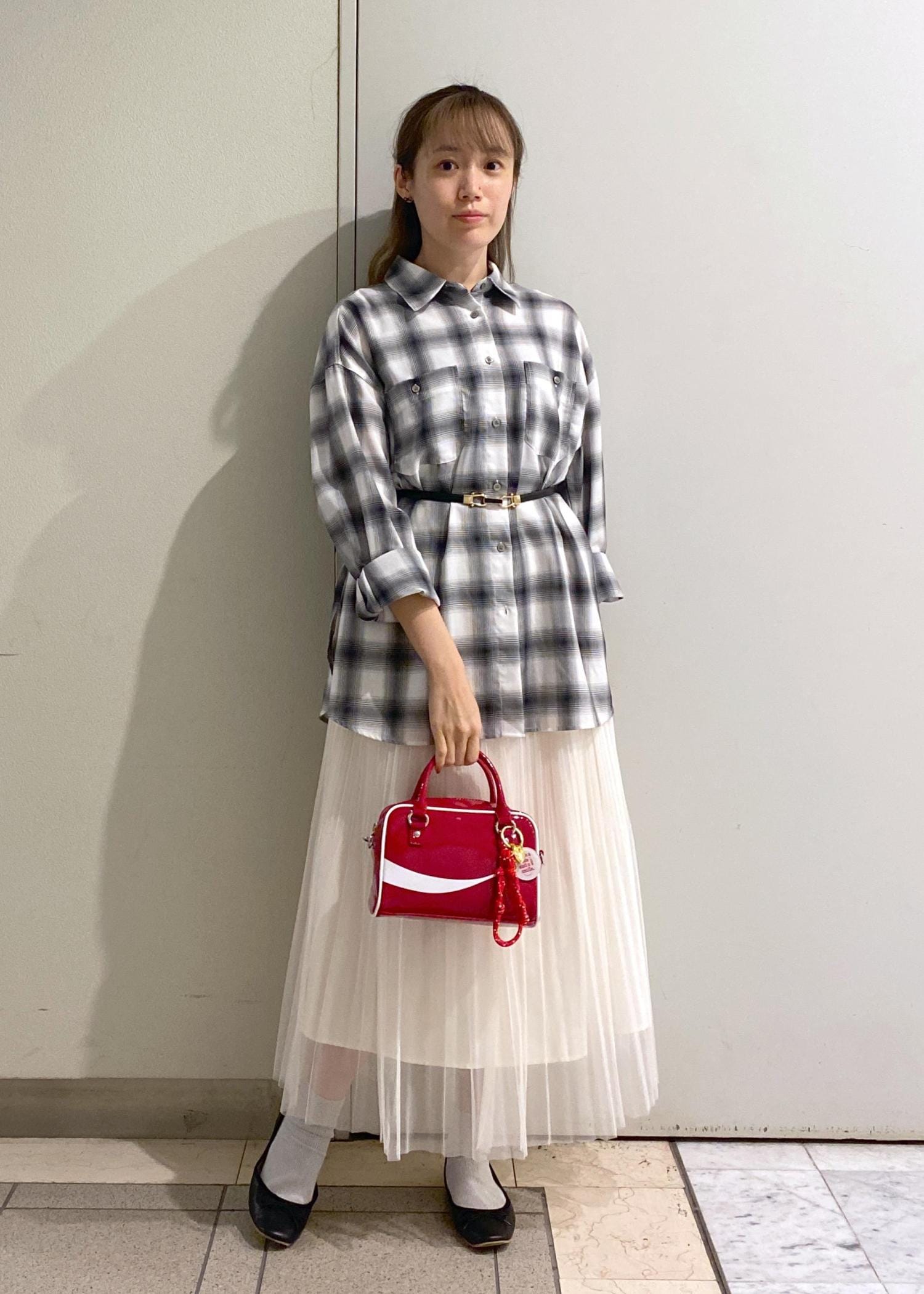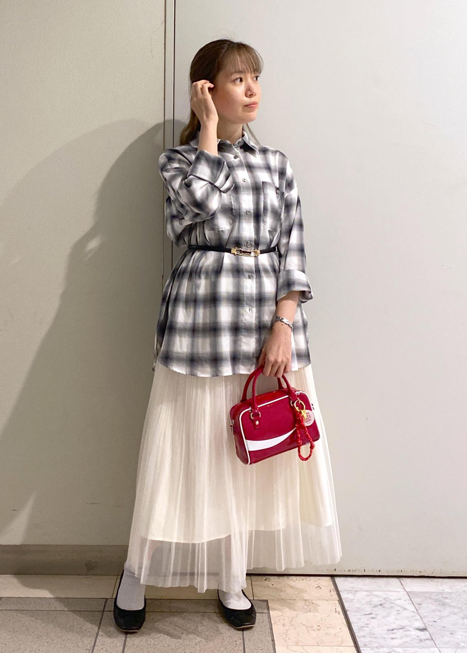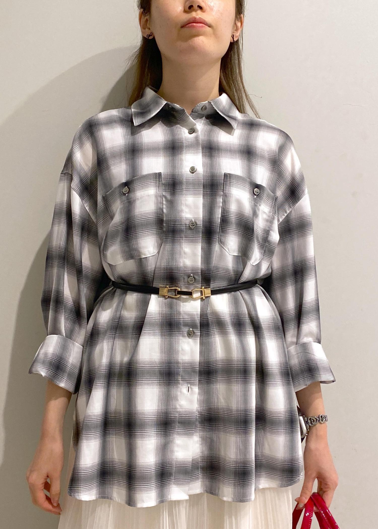チェックシャツはベルトを合わせてチュニック風の着こなしに。