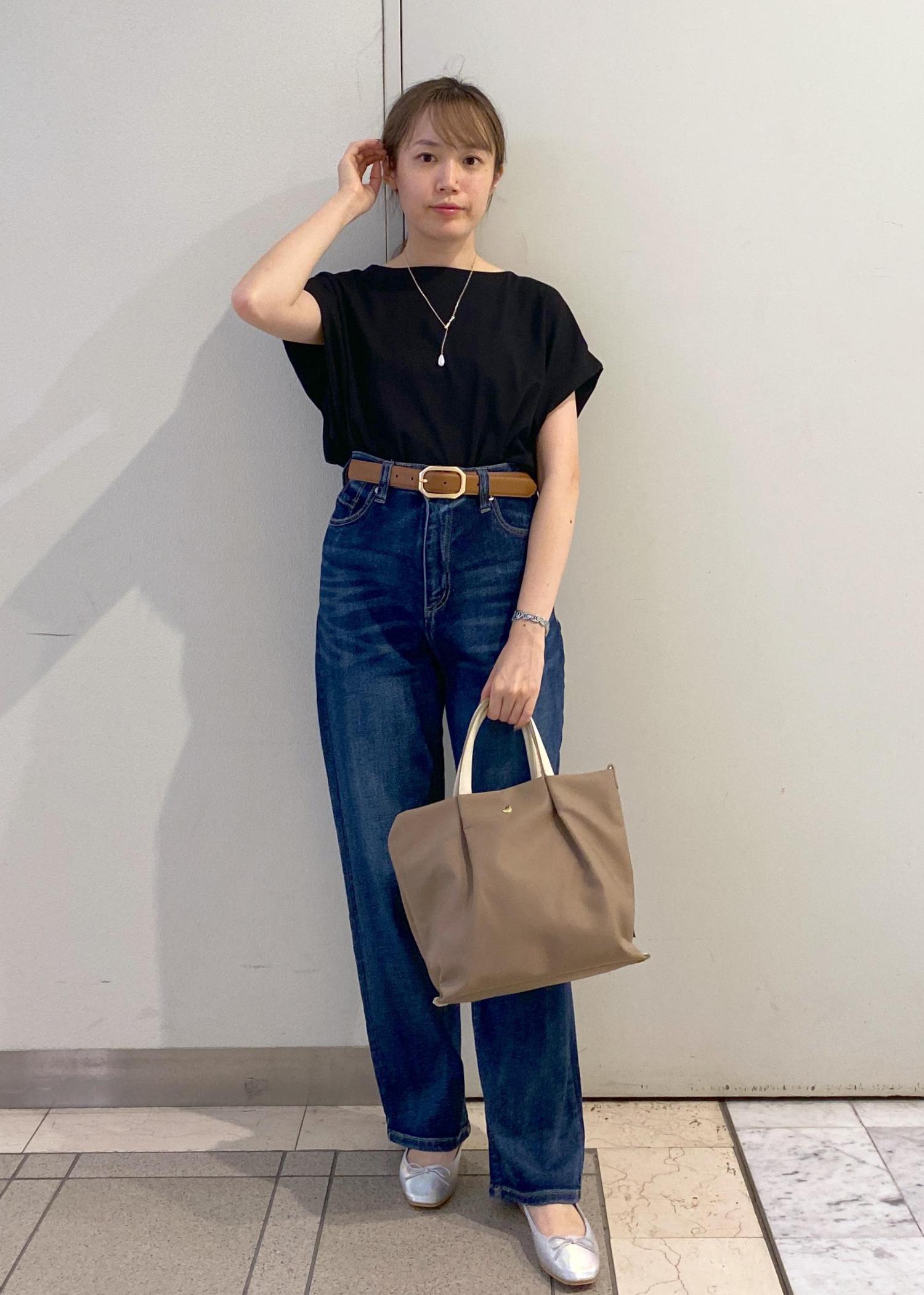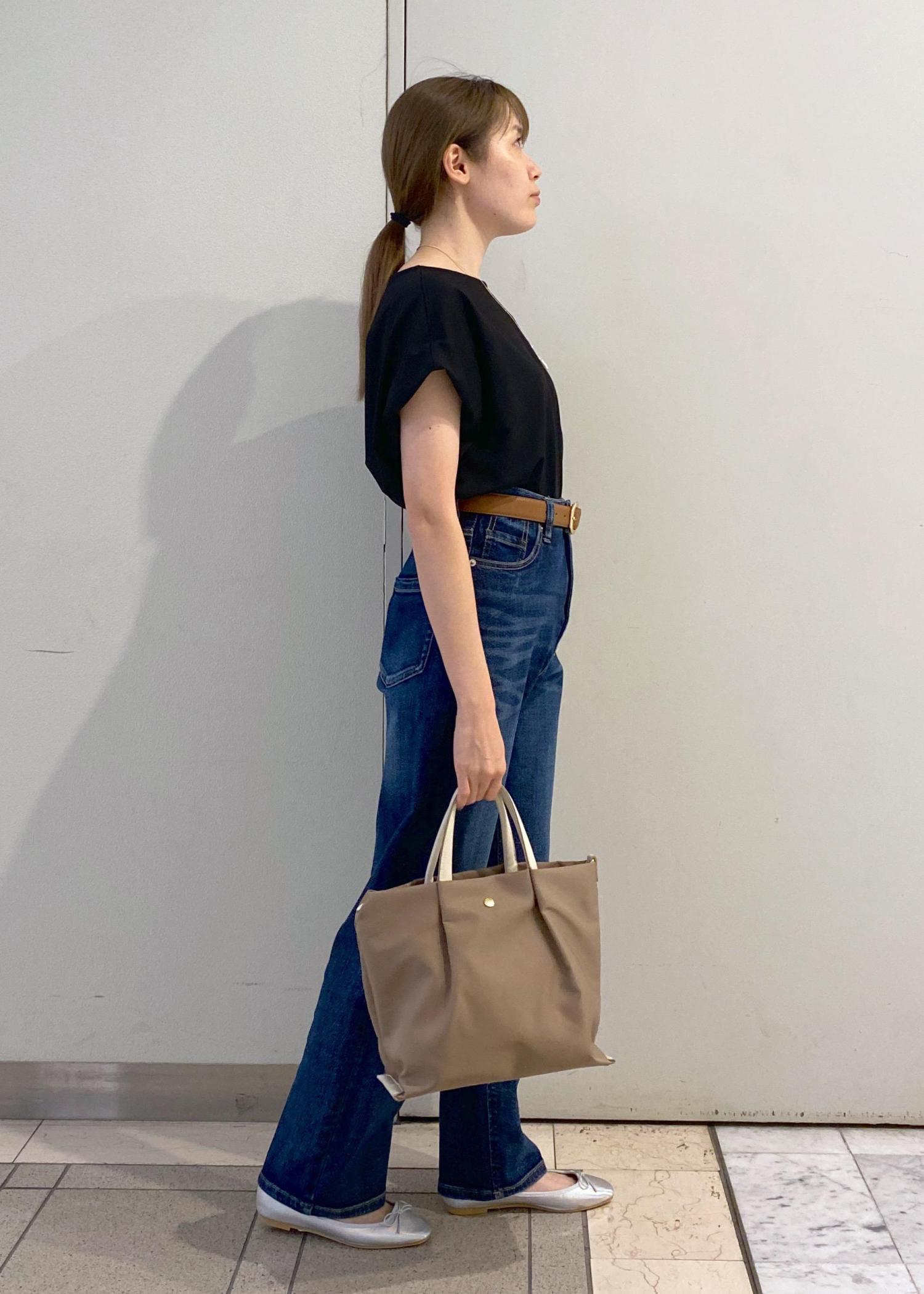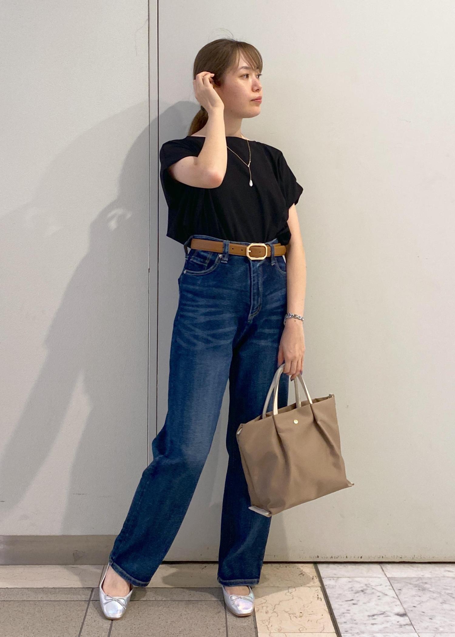 ゆったりシルエットのトップスは、ウエストイン+ベルトですっきりとした着こなしに。