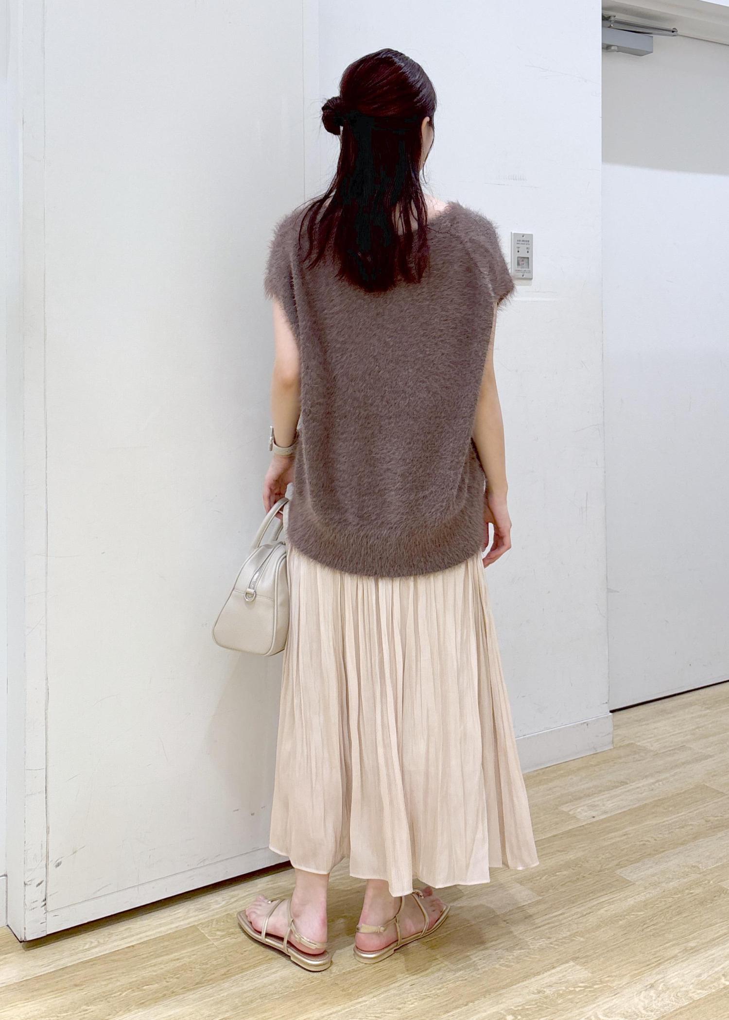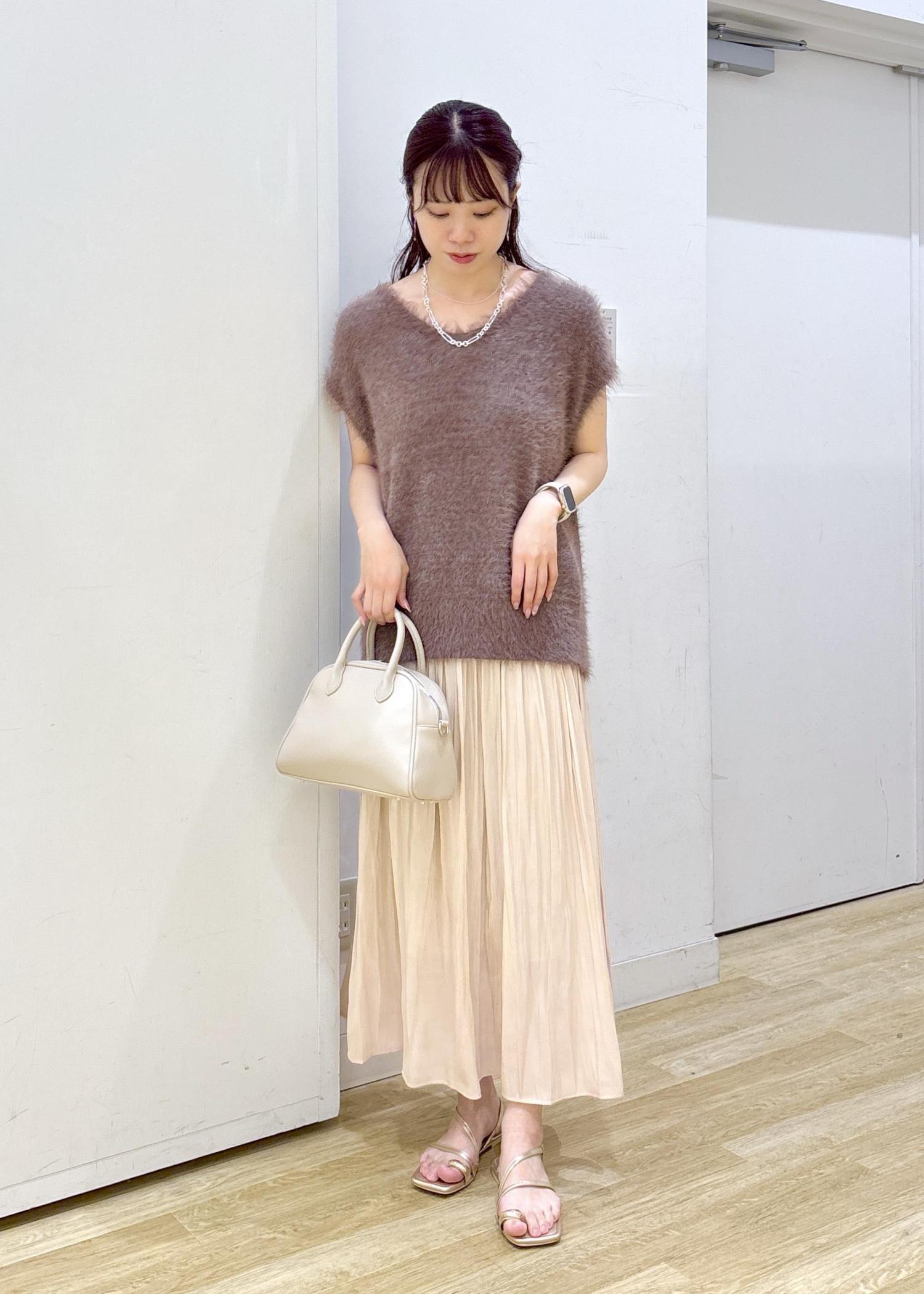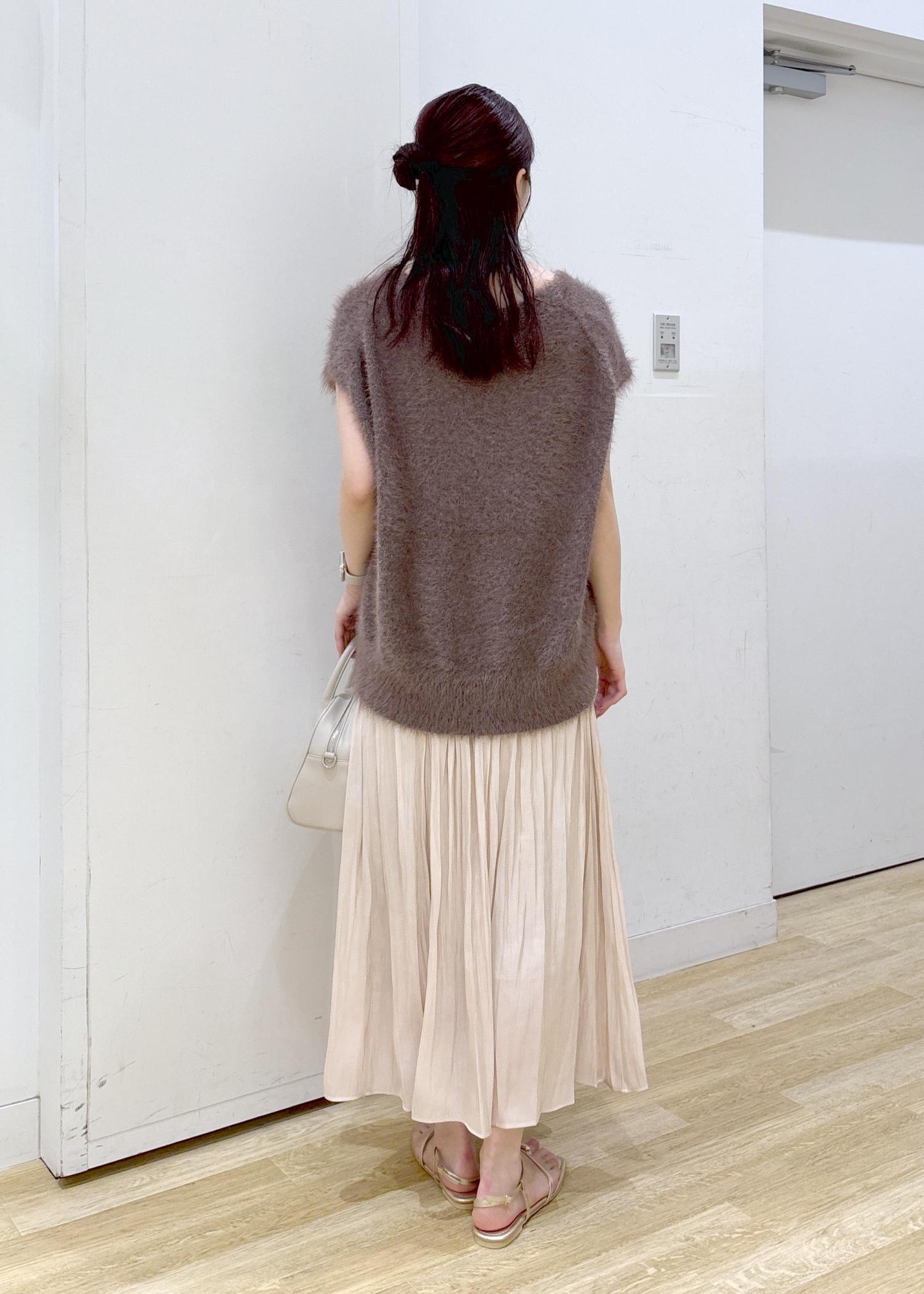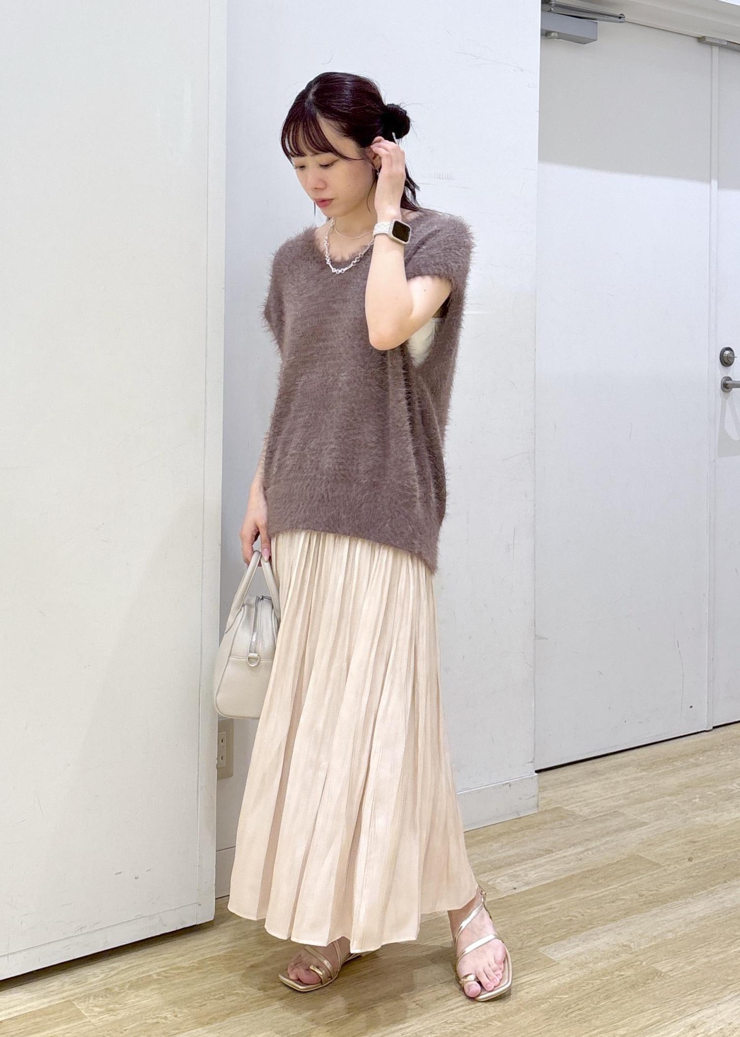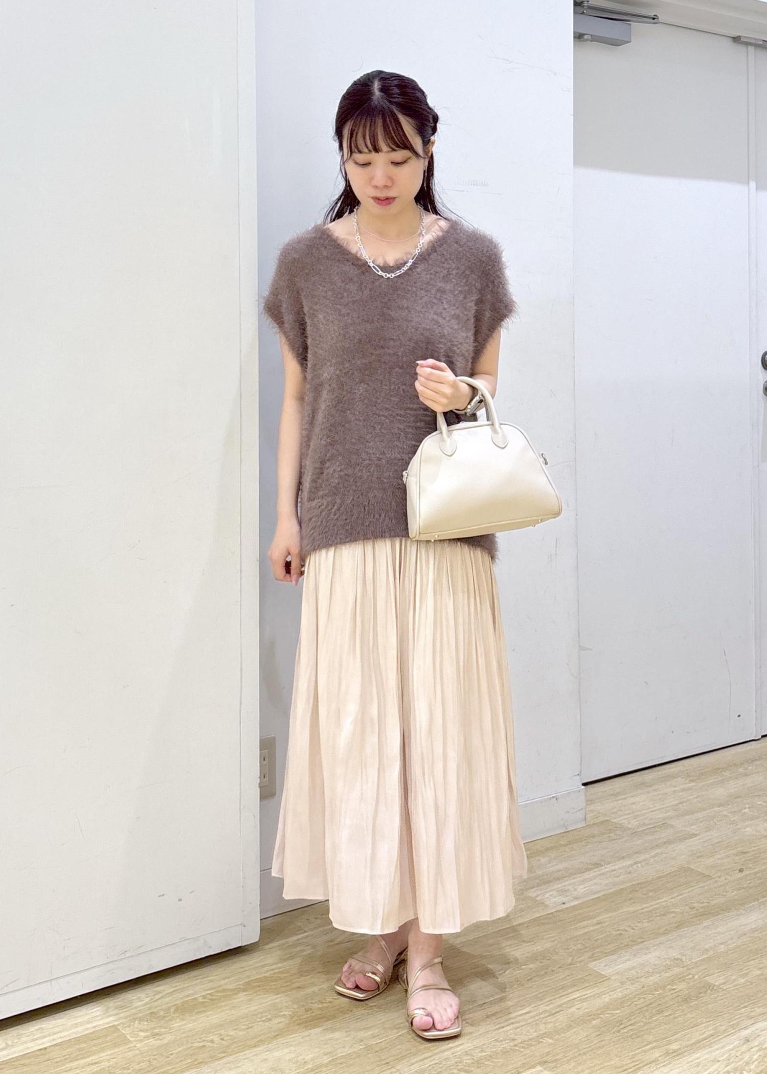 フェザーニットと光沢感のあるスカートを合わせてフェミニンなコーディネートに仕上げました◎
