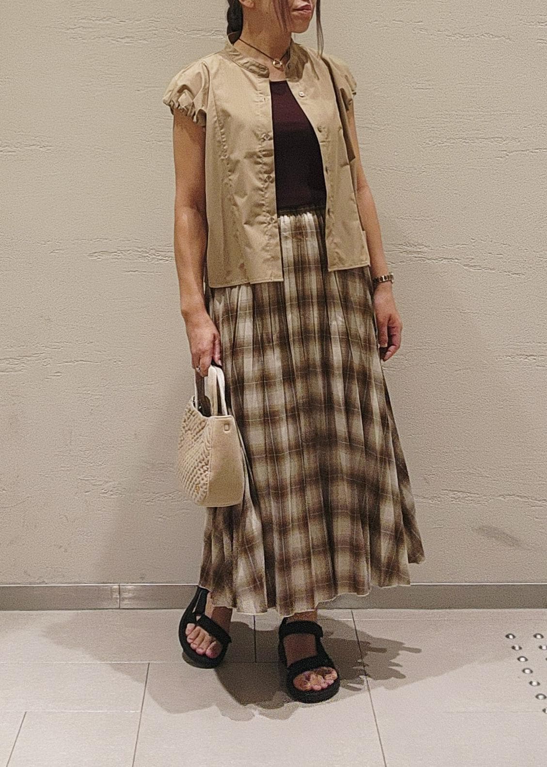 チェック柄が可愛いスカートに、ブラウンのインナーとベロア素材のバッグで秋の雰囲気をプラス!