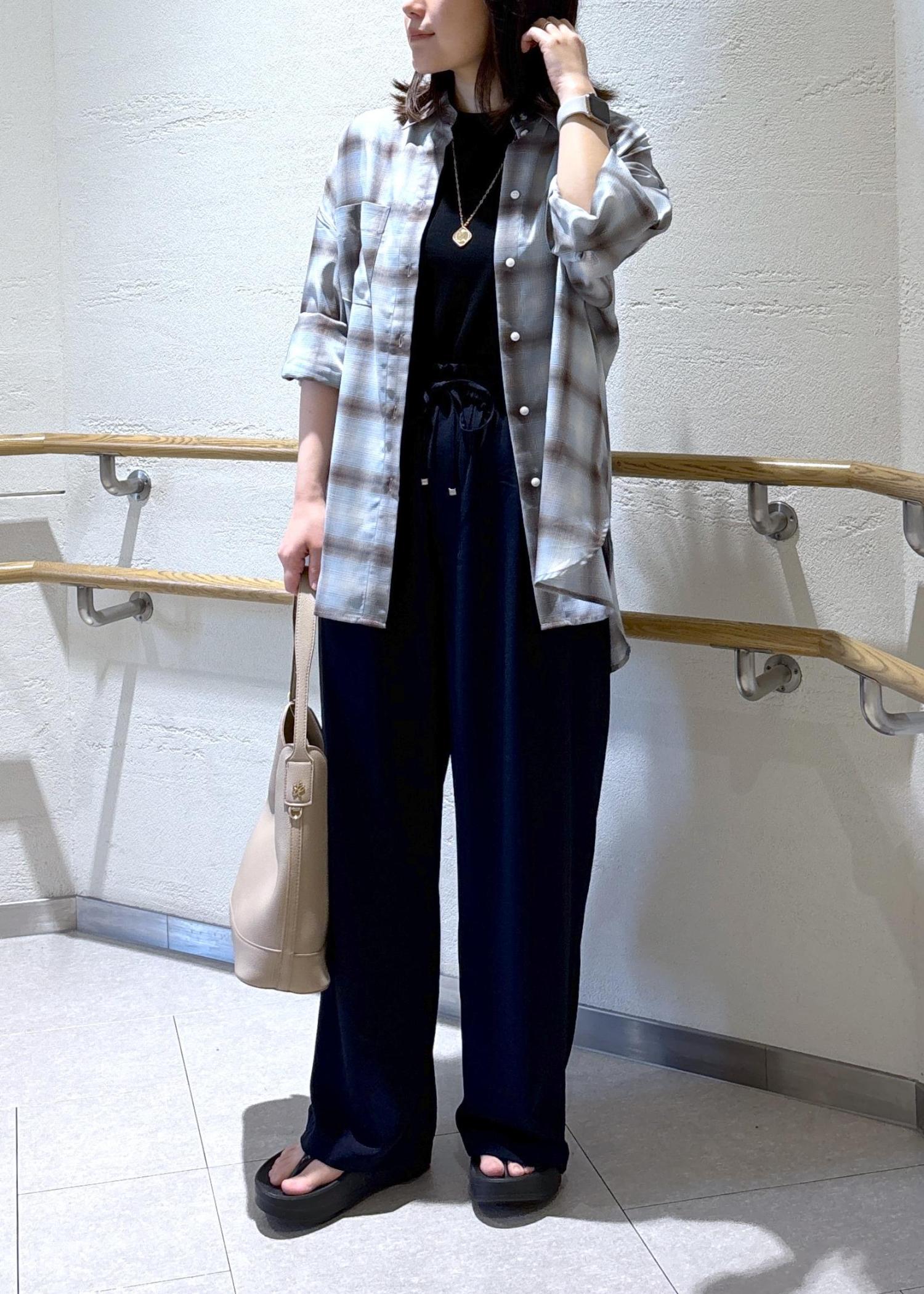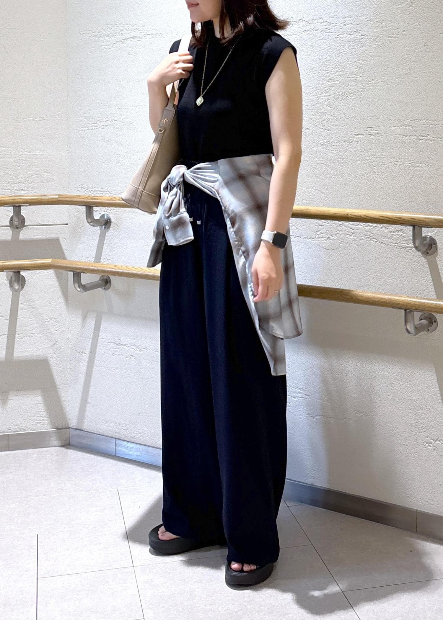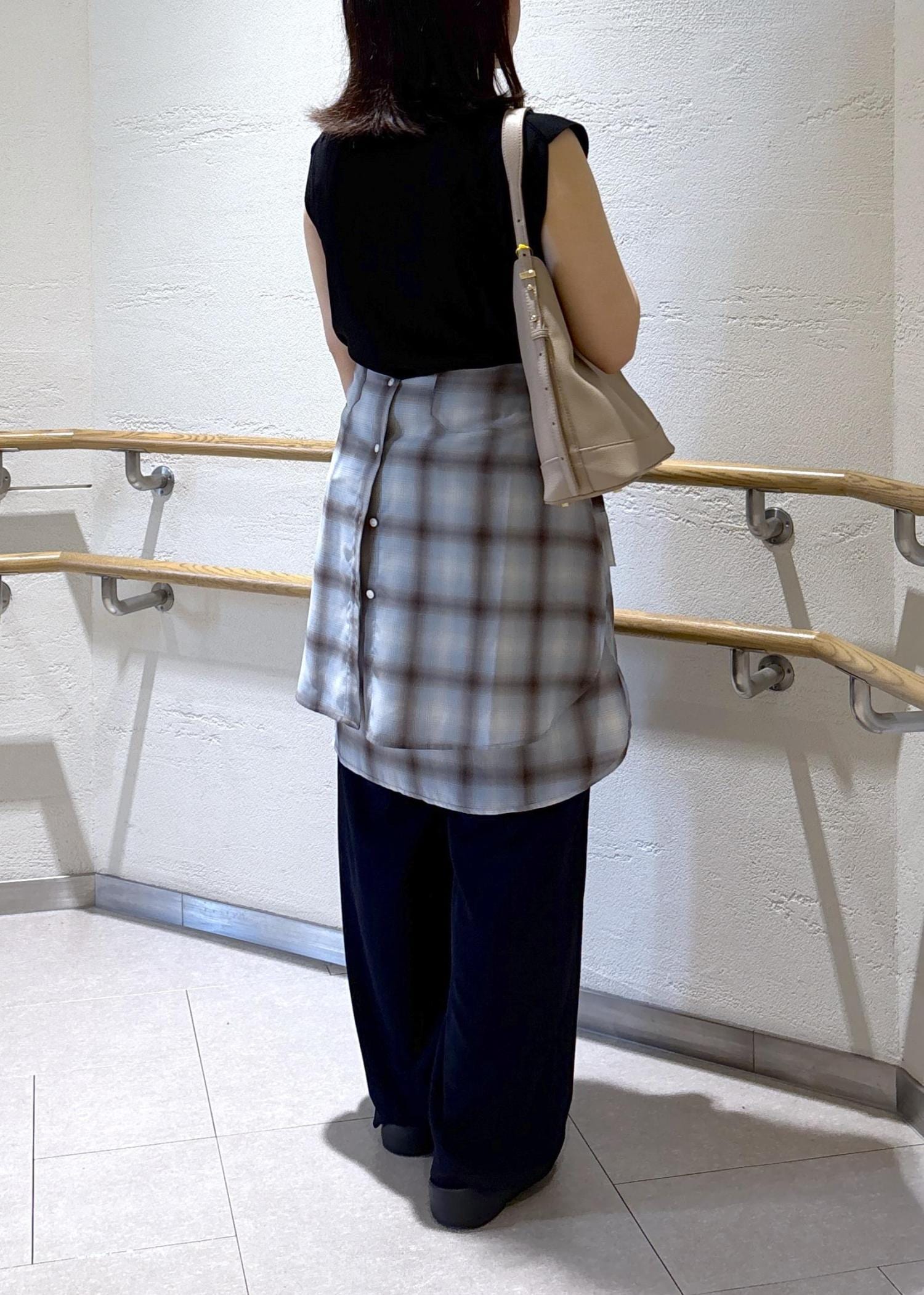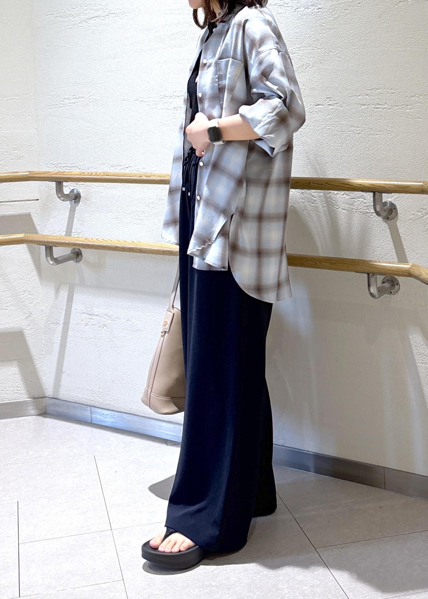 腰回りをカバー&コーデのアクセントとして、オンブレシャツを腰に巻きました。
