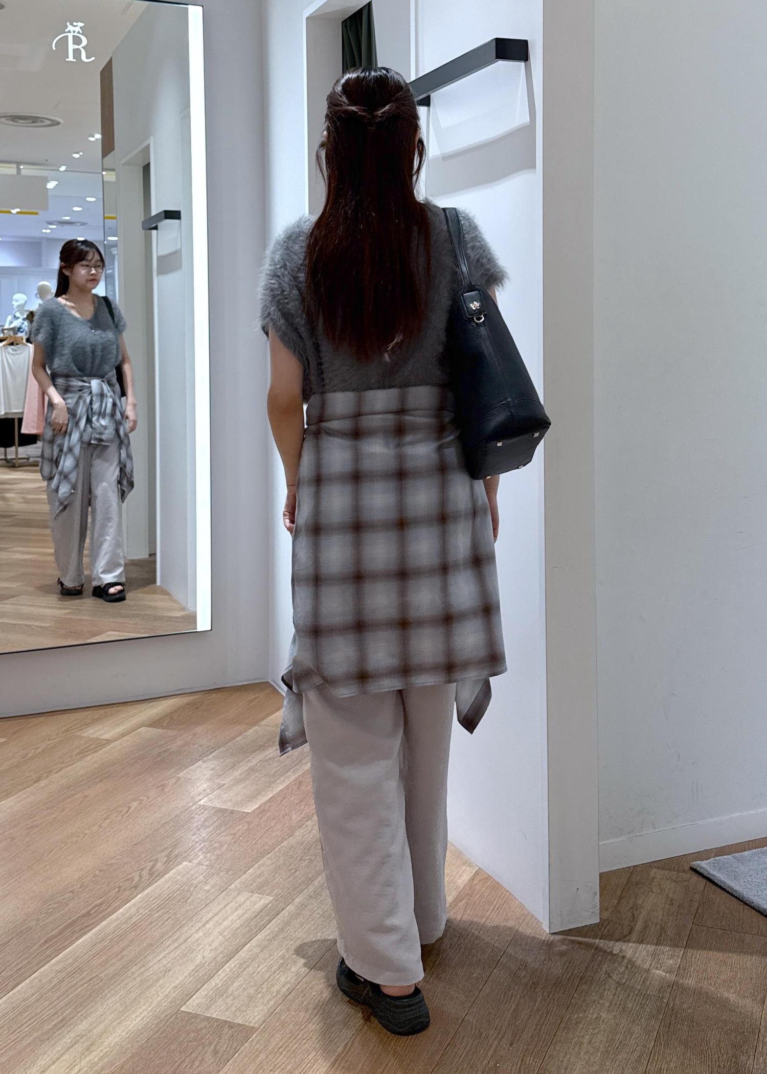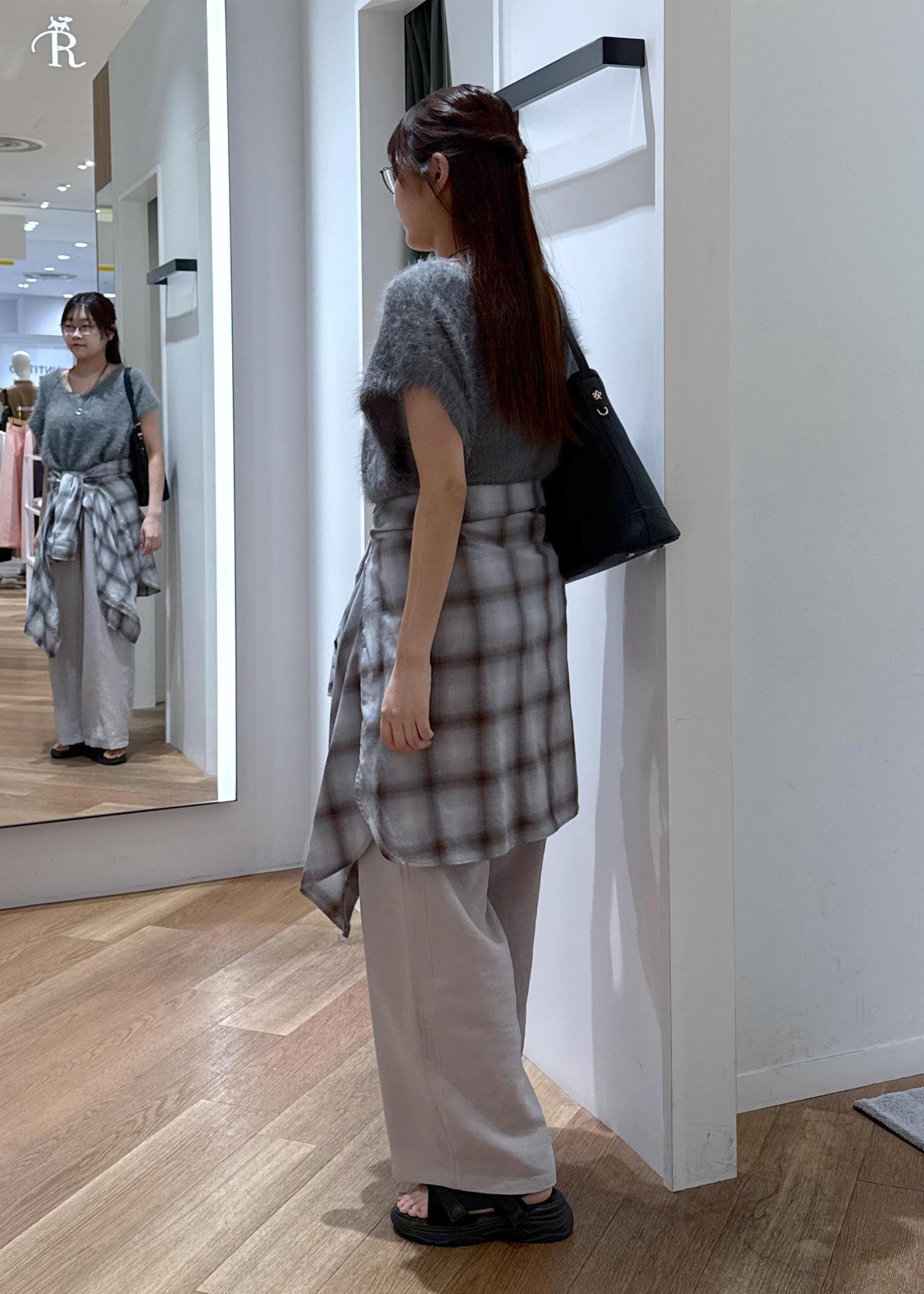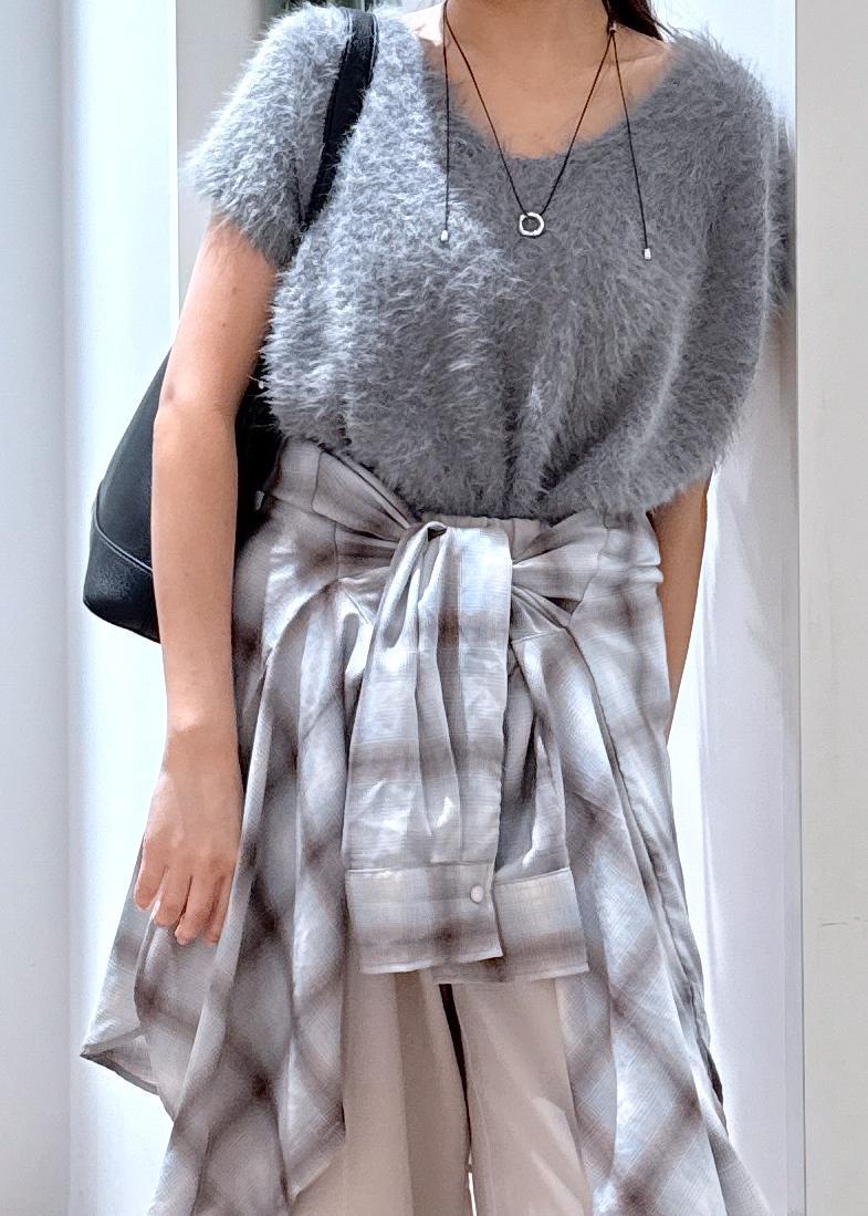 グレーのベストを1枚でヘルシーに着用し、チェックのシャツを腰に巻いた、季節先取り意識のコーディネートです。