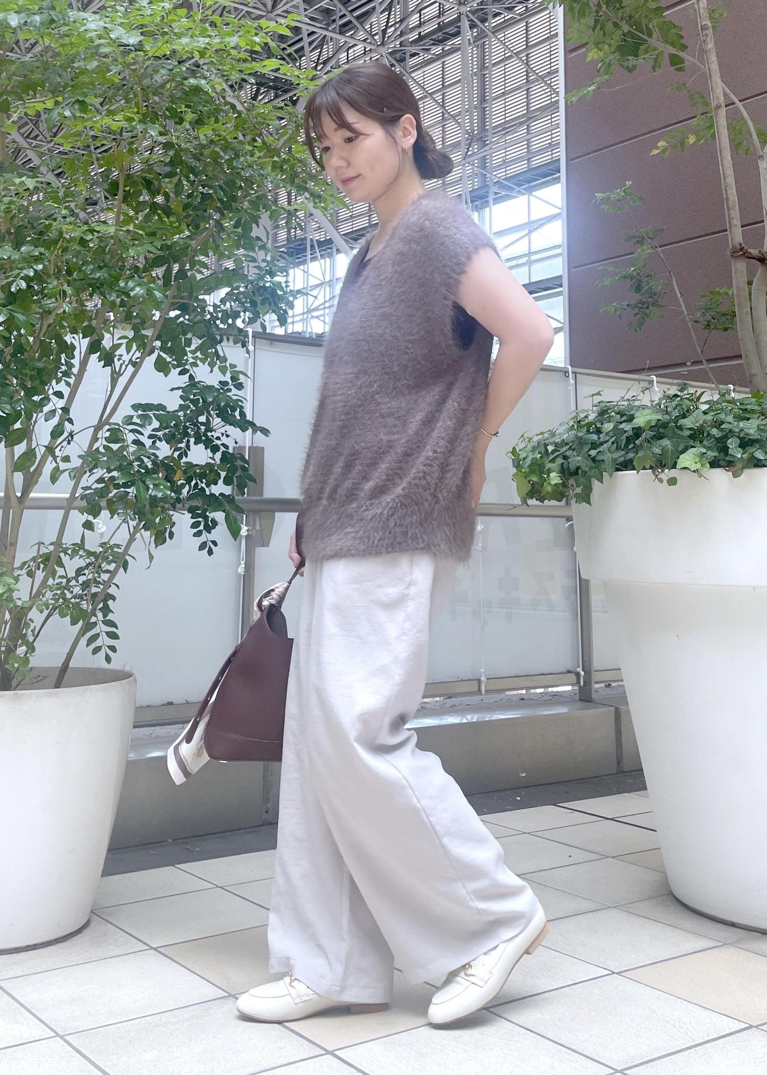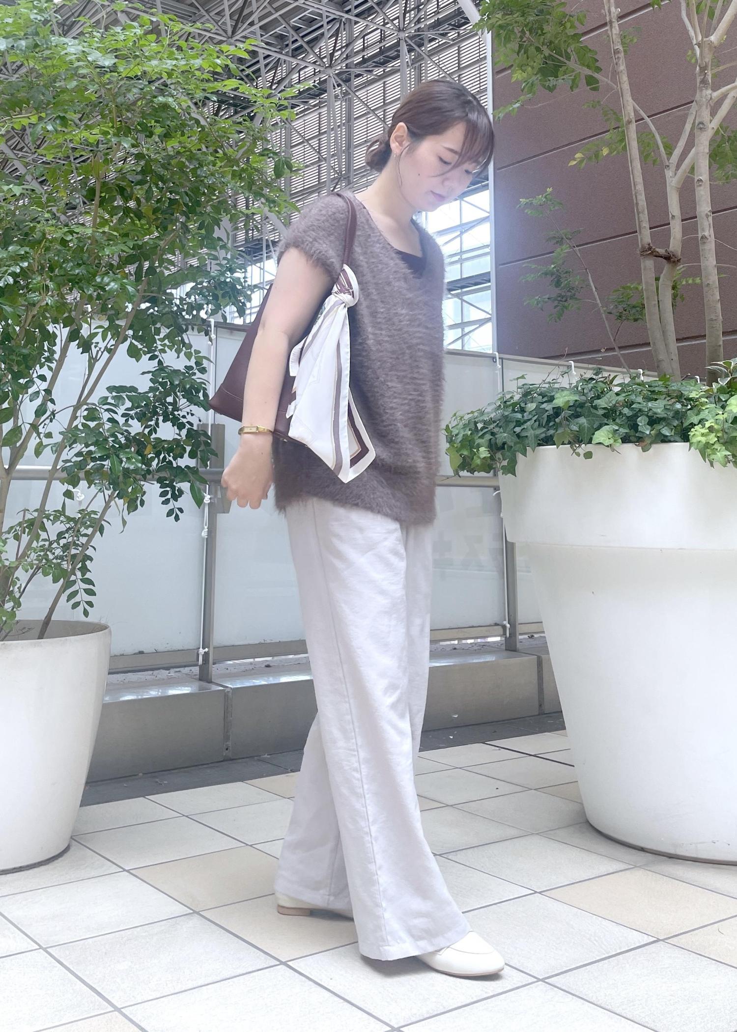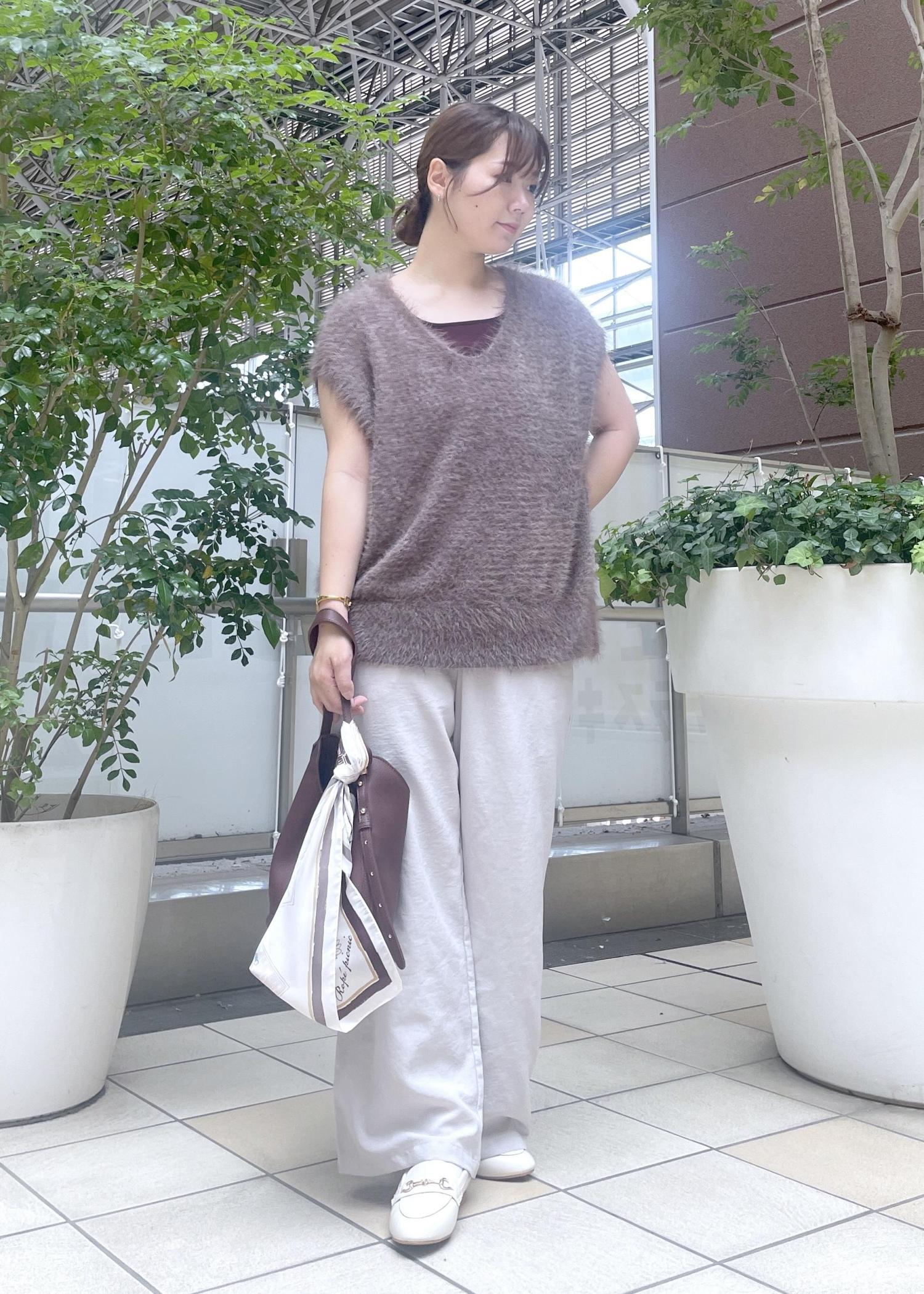 シャギーニットを主役にブラウンのカラーでまとめた秋の始まりにオススメのコーデです。