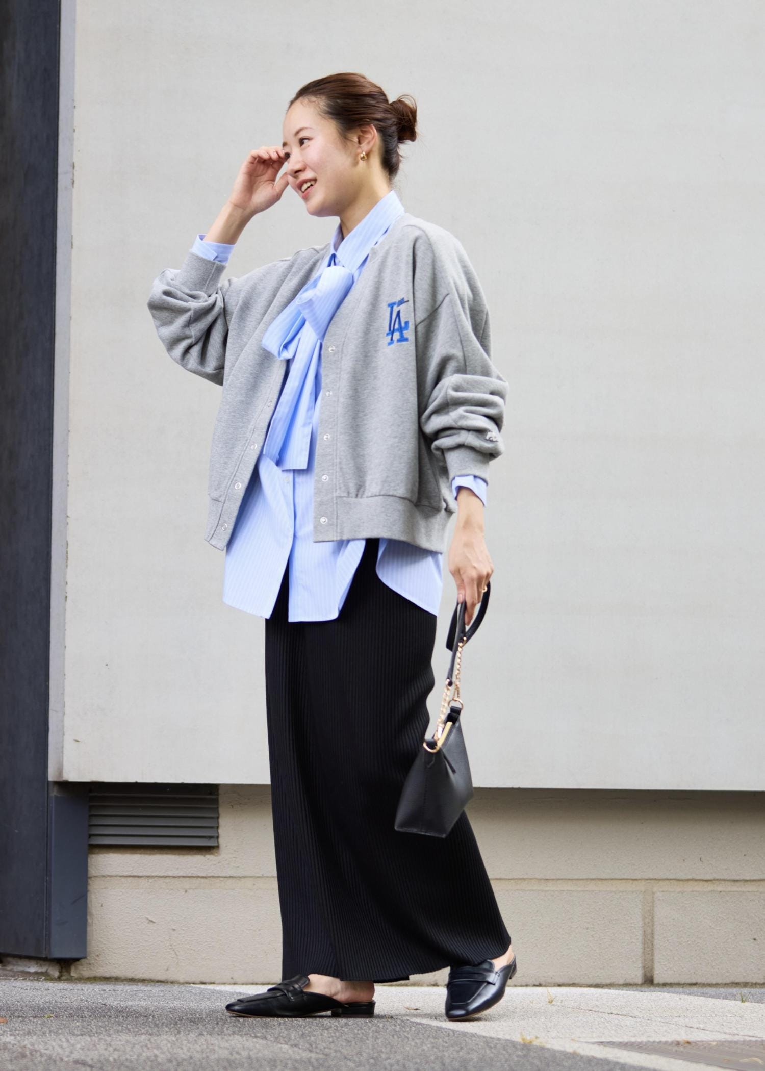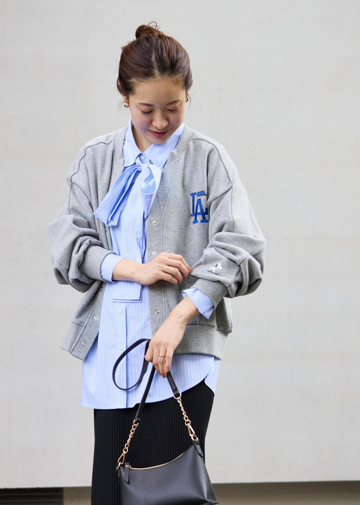 カジュアルなカーディガンを主役に、キレイめアイテムを合わせたストリートスタイルです。