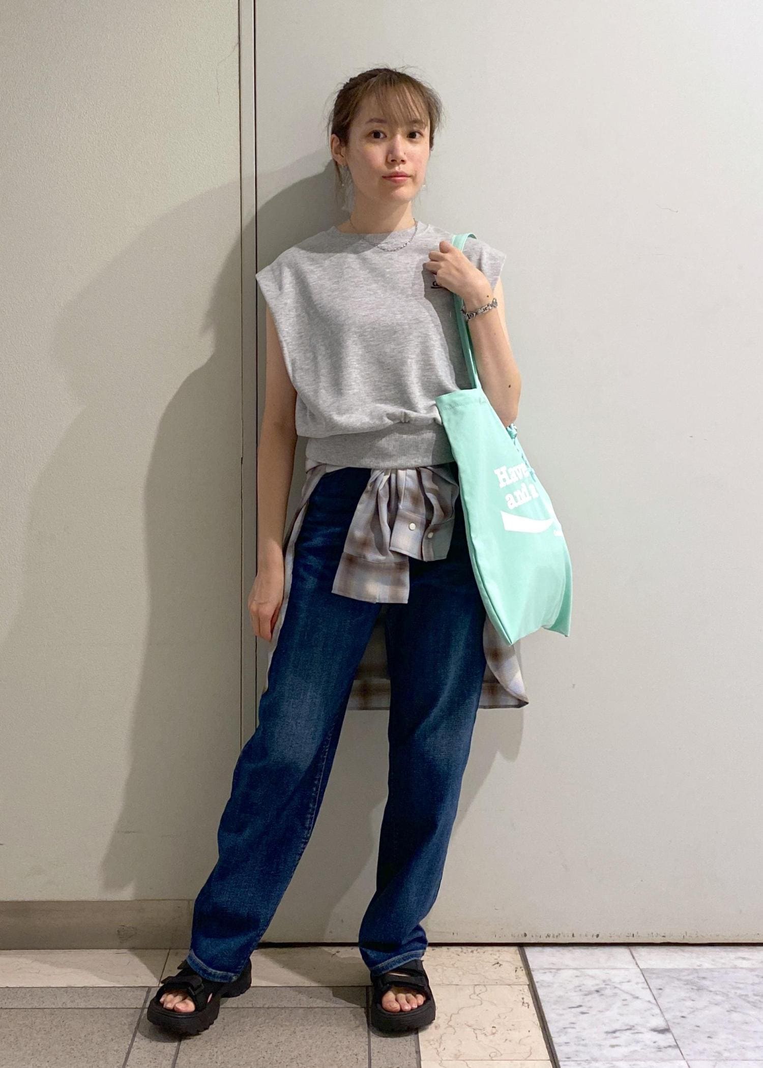 トップスが薄いグレーなので、パンツは濃いブルーをチョイス。