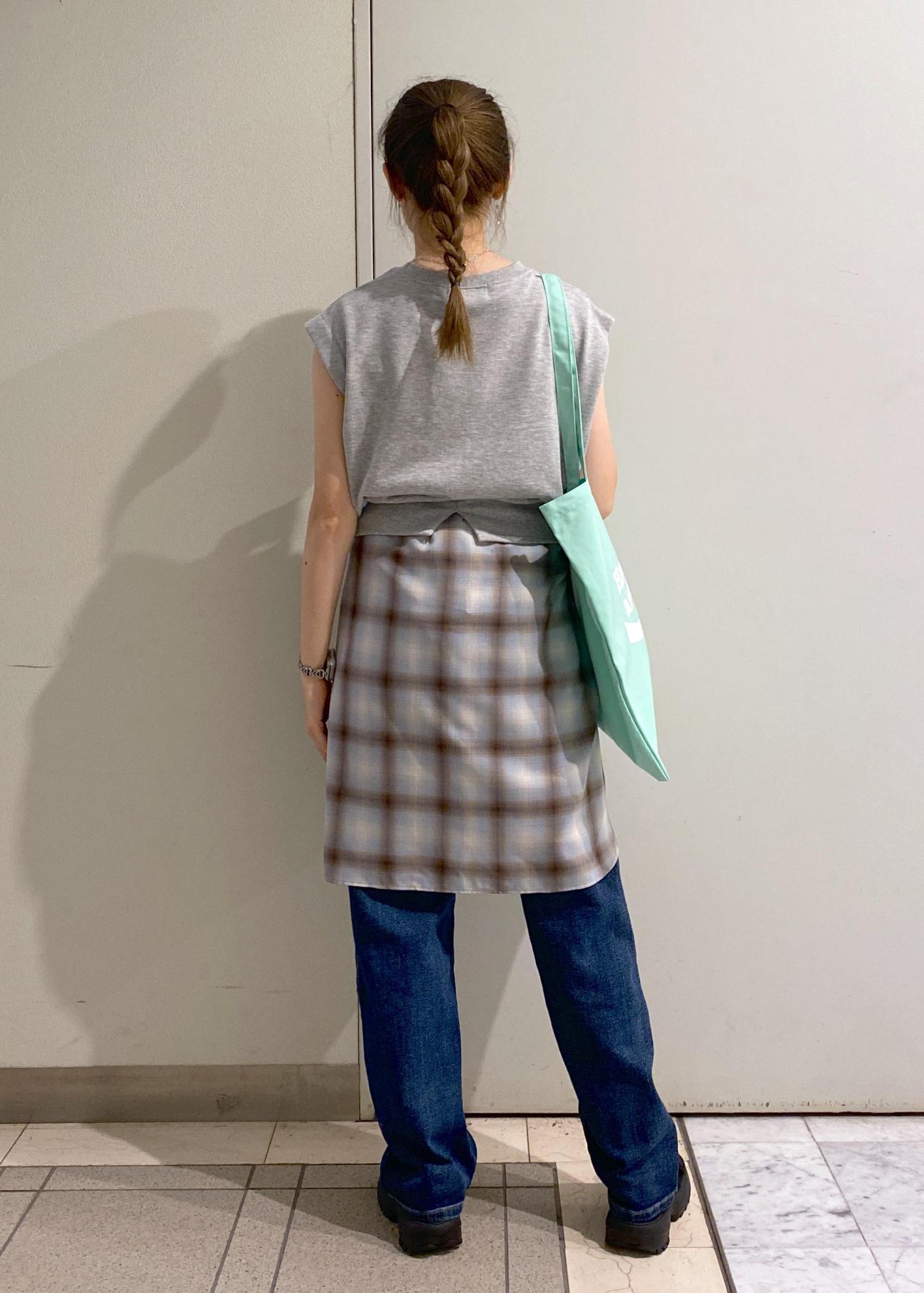 トレンドのチェックシャツは腰に巻いてアレンジ。