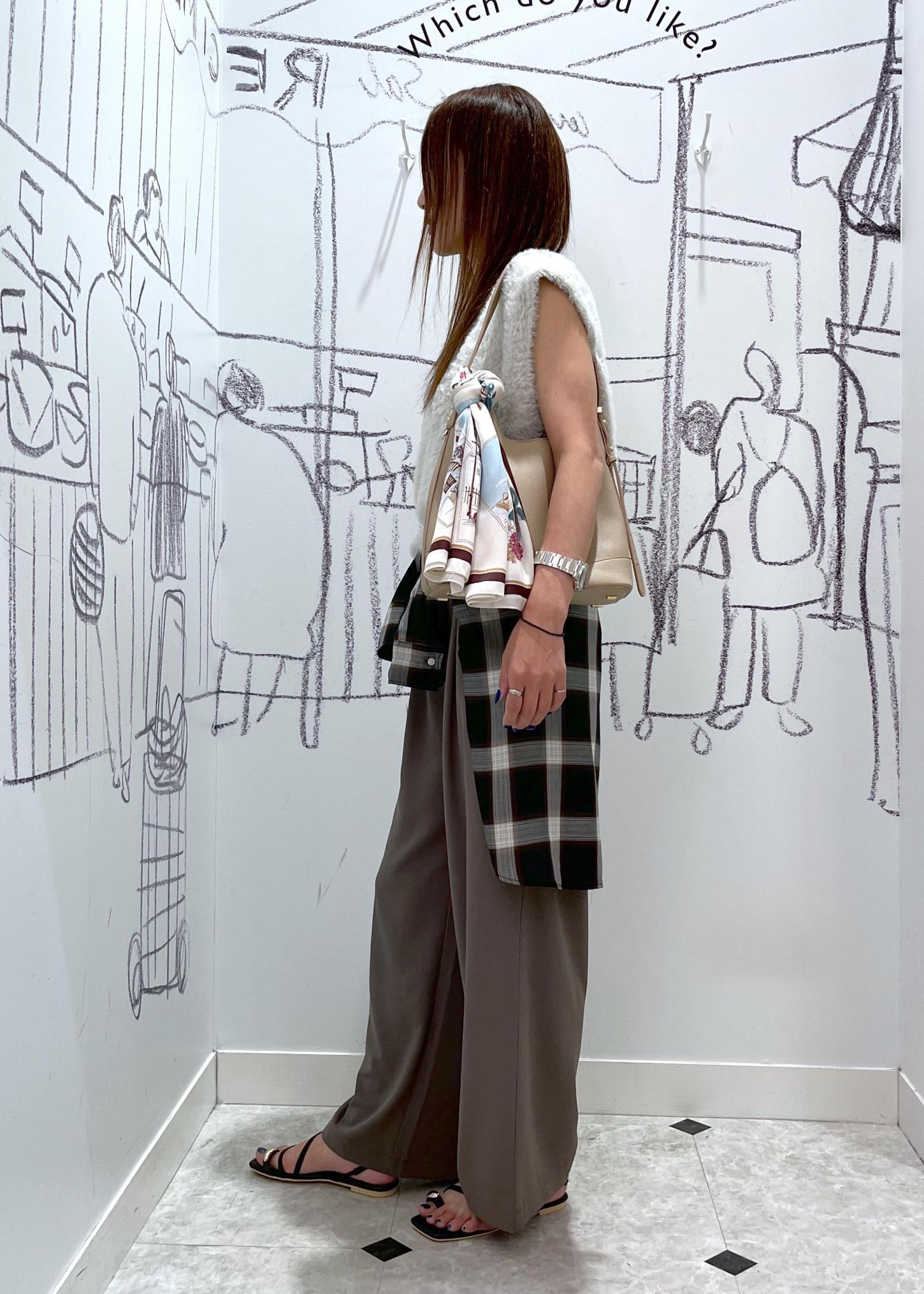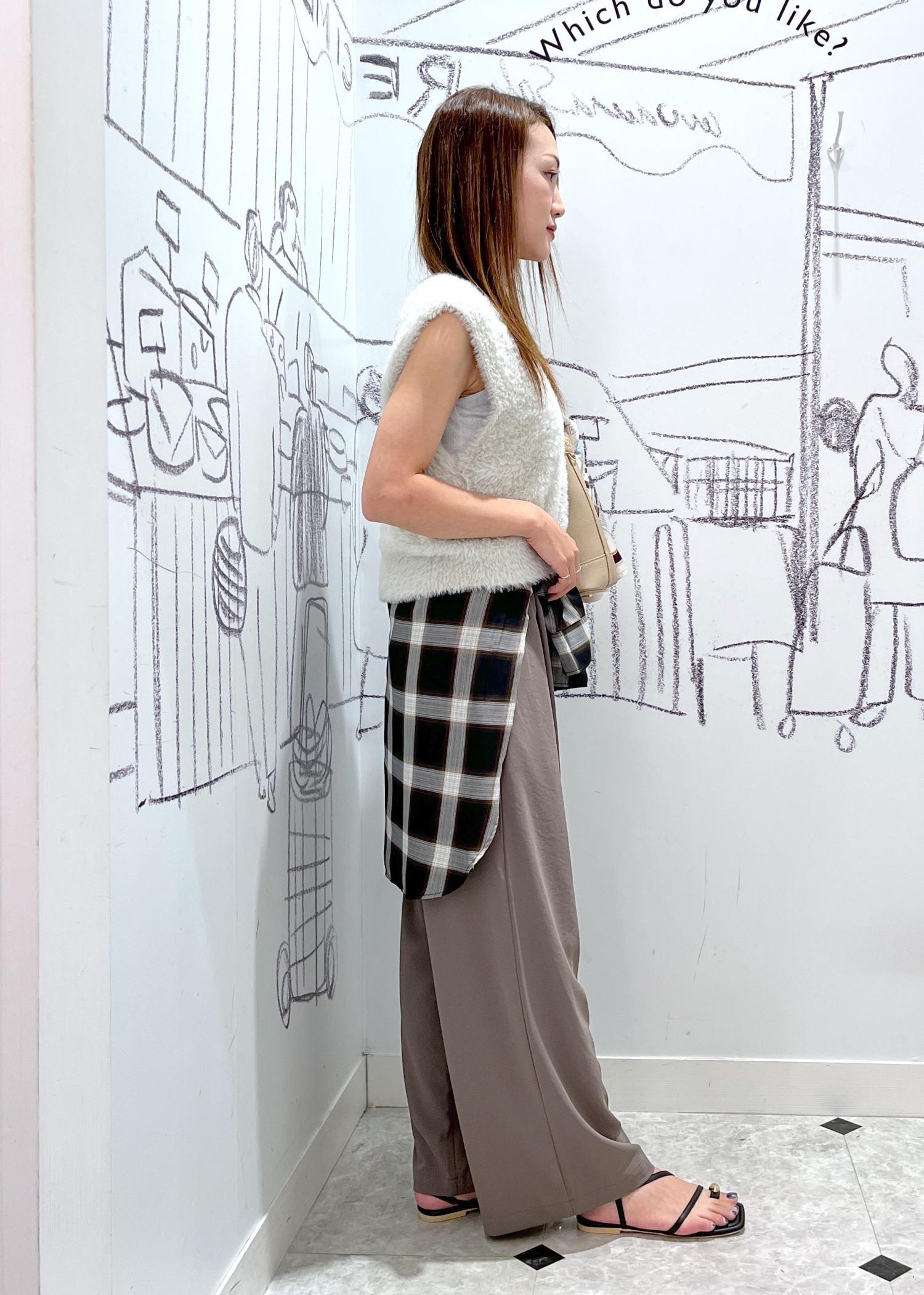 もこもこの触り心地の良いファーベストにさらっとしたワイドパンツを合わせて、夏から着れる秋先取りコーデです。着丈が短めですっきりするので、ボトムスにボリューム感がある物でもすっきりと着れます。チェックシャツをアクセントに巻くとより秋らしく。