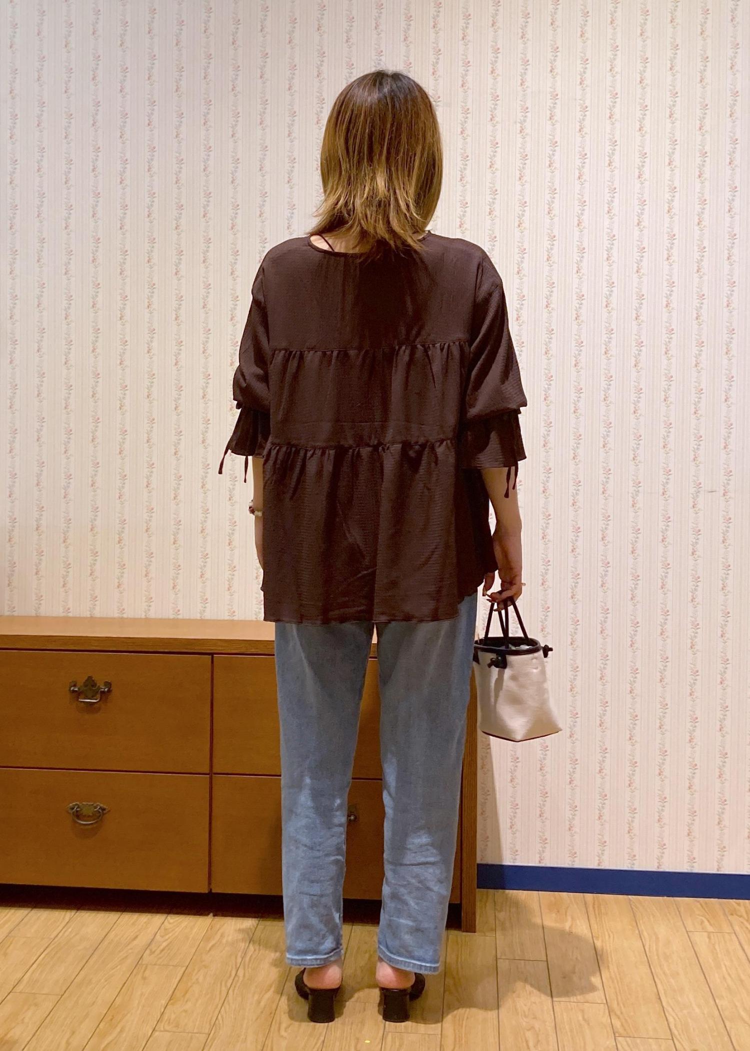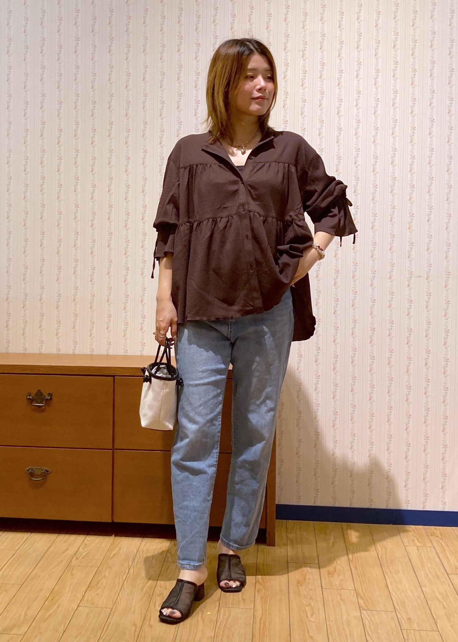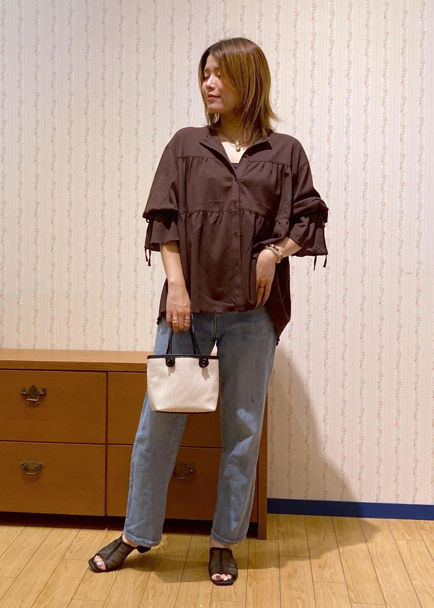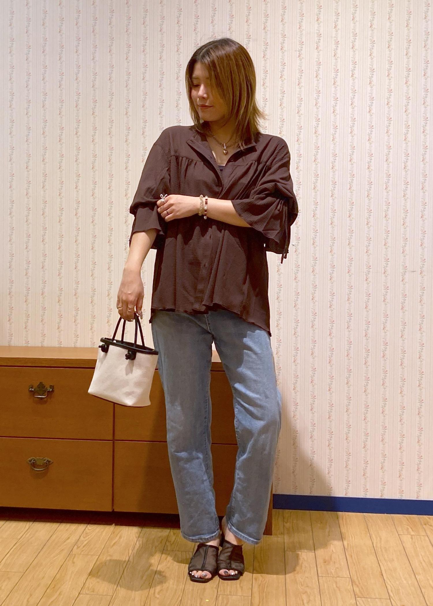ブラウン×薄色デニムのトレンド感のある色合わせがポイントです。