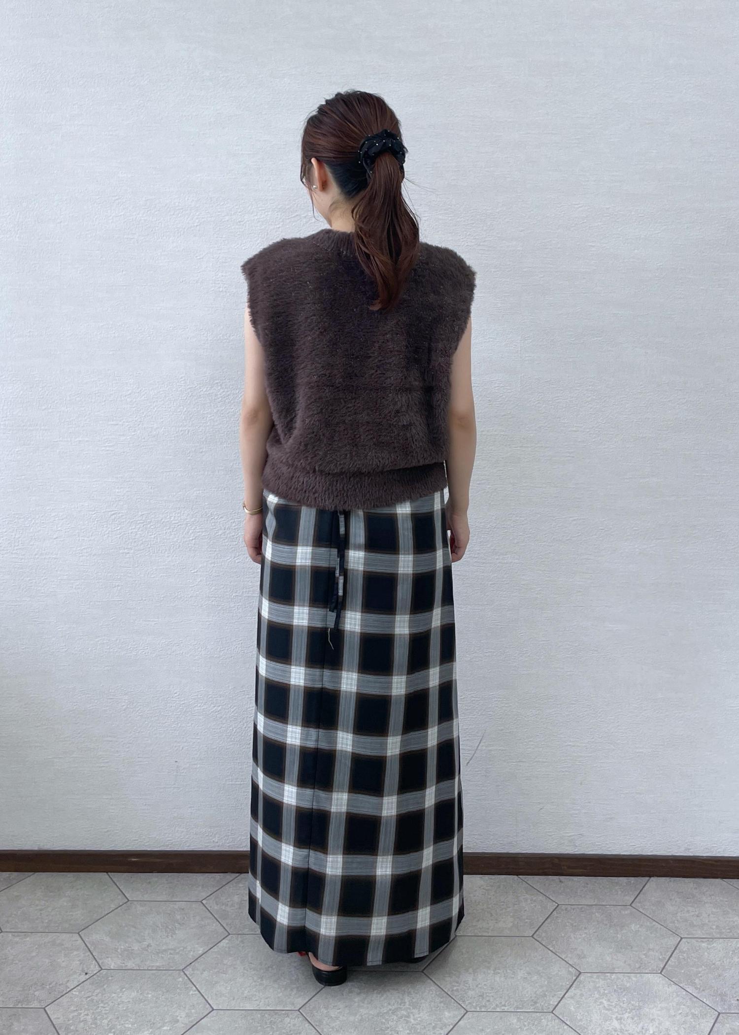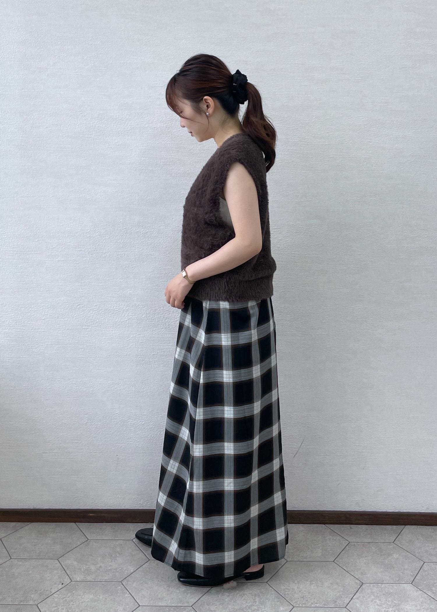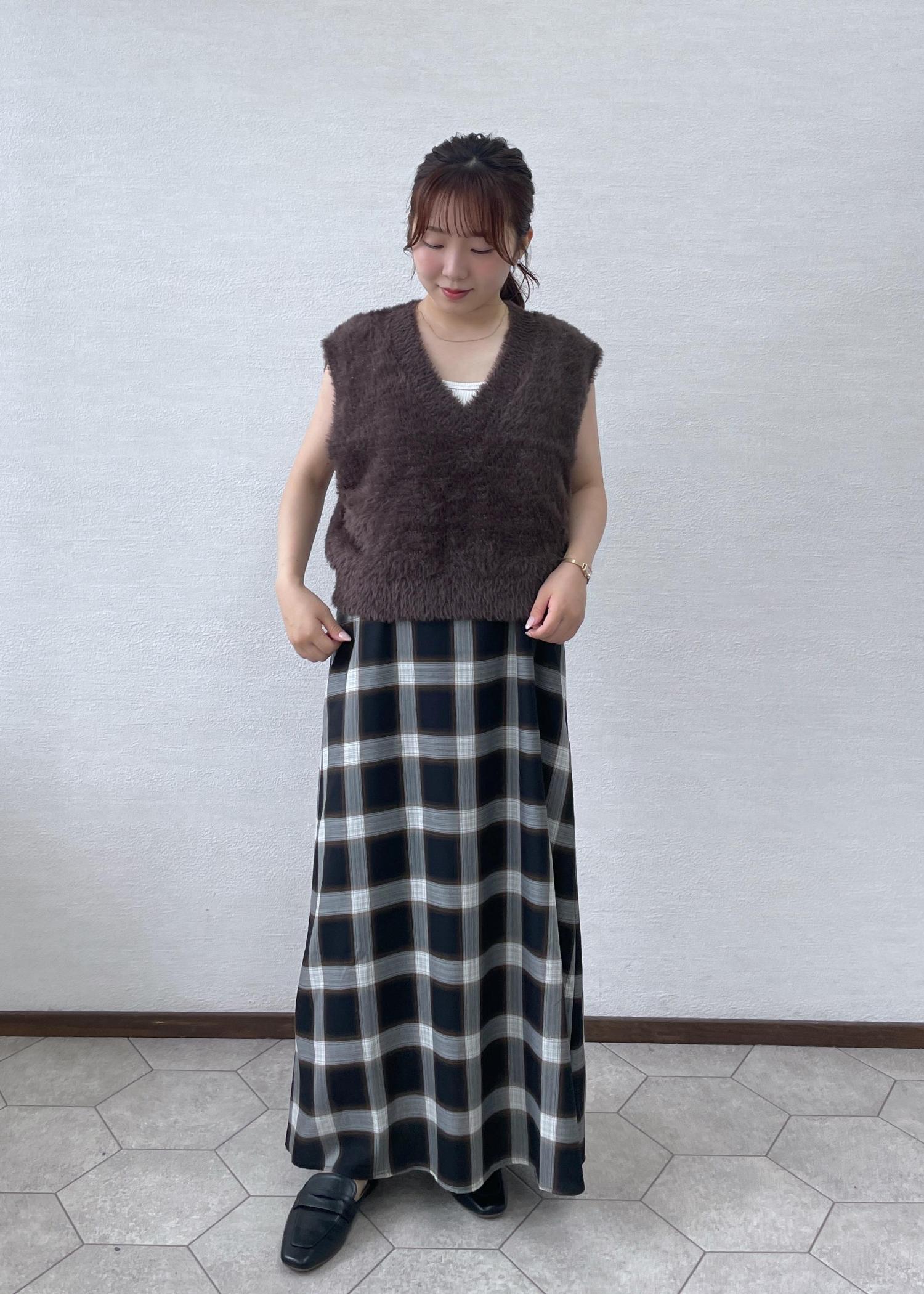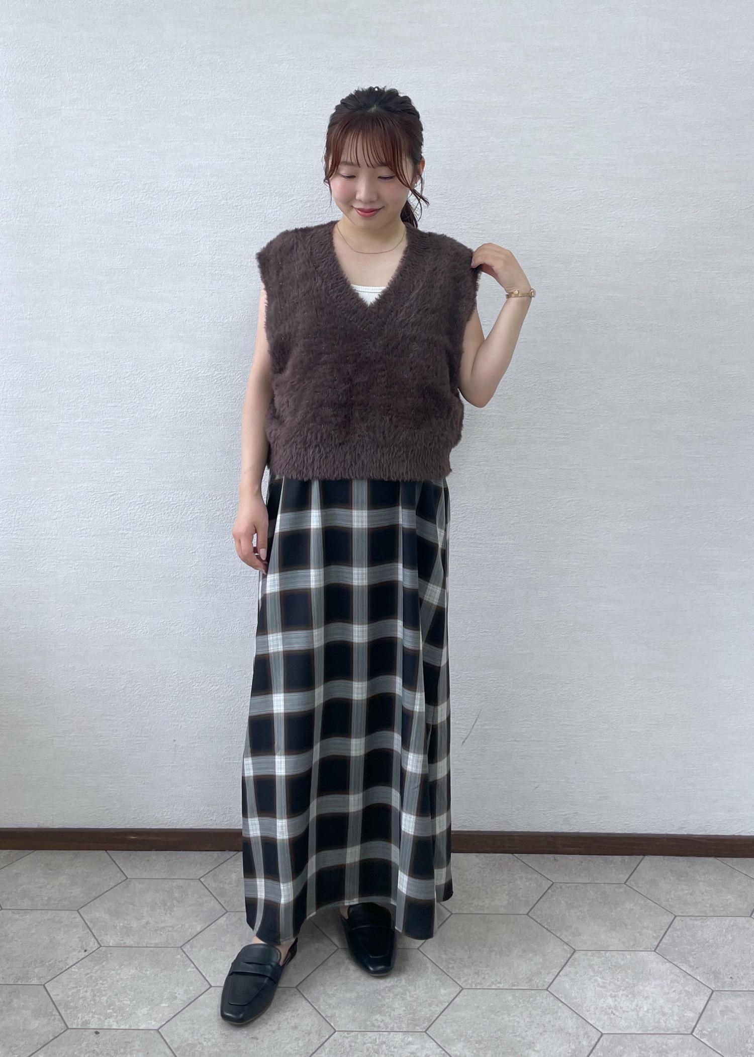 ワンピースの上からニットを重ねてみました!全体的に落ち着いた色でまとめて秋意識なコーデにしました!フェザーニットは1枚で着ると垢抜けた印象になります◎