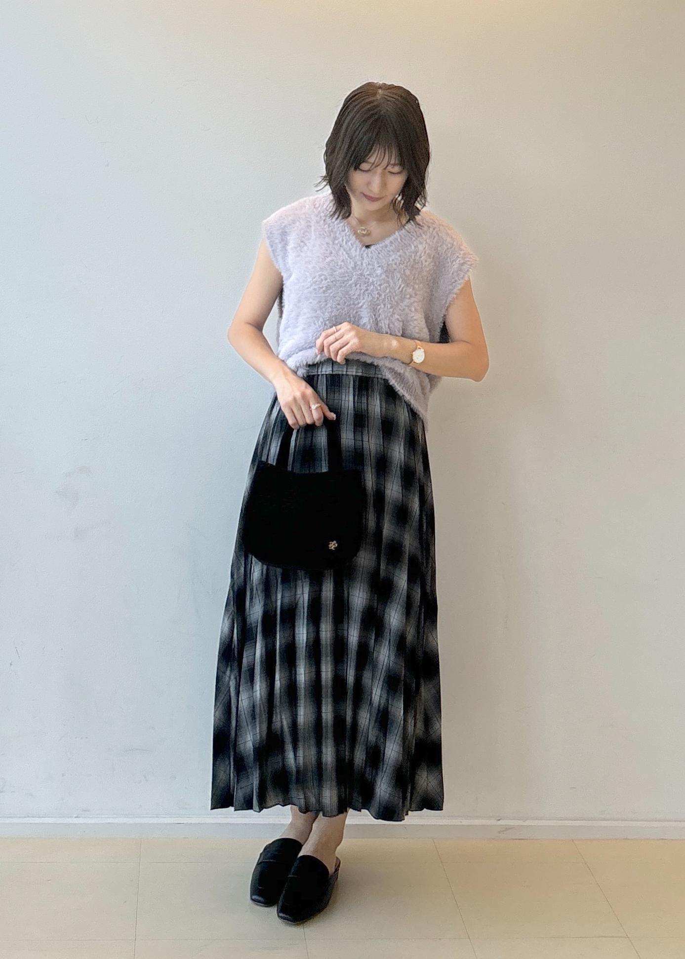ニットベストがパープルなので他をブラックでまとめて可愛さもありつつ少し大人っぽく。