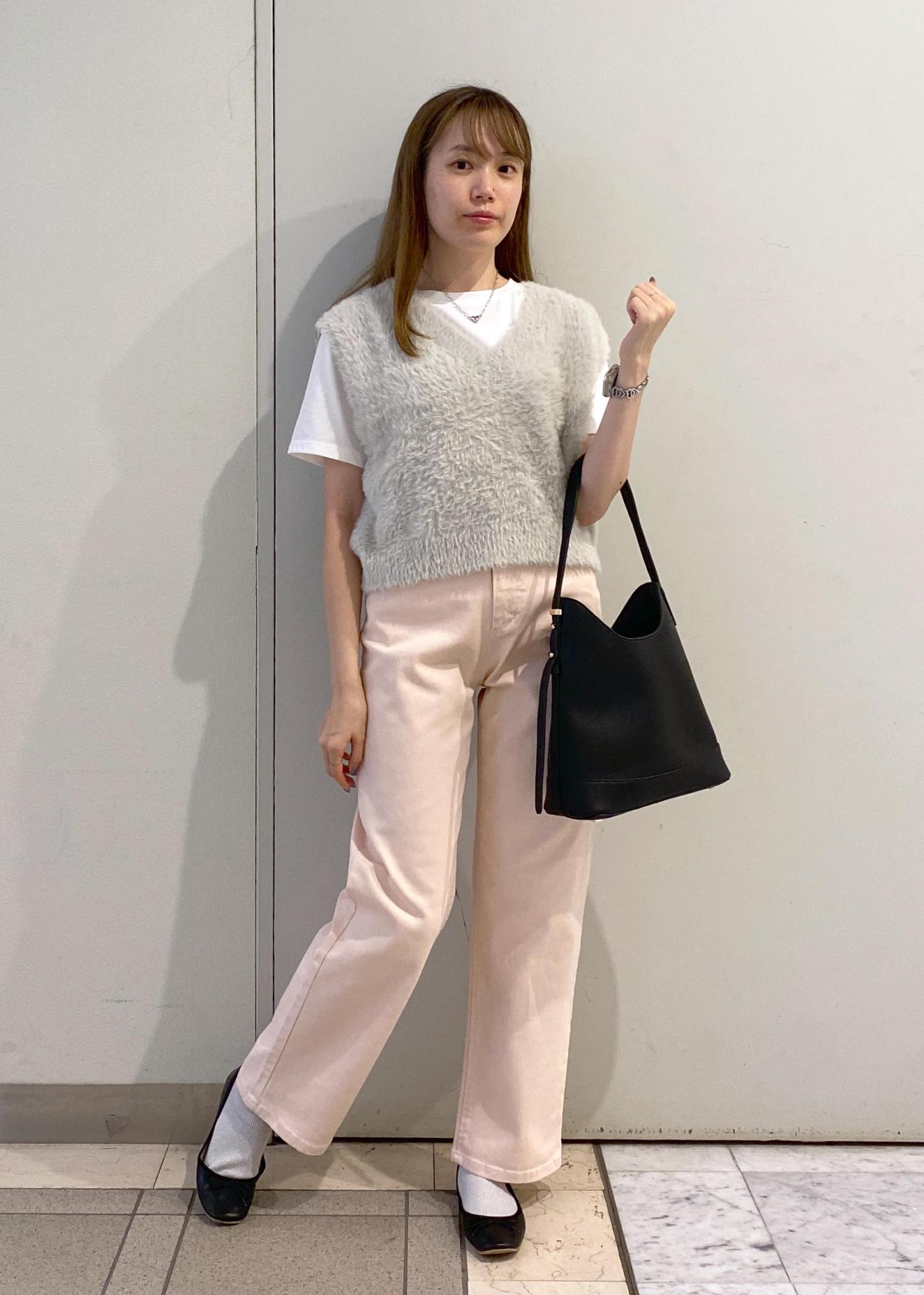 グレー×ホワイト×ピンクの優しい色味でまとめ、ブラックの小物使いで引き締めました。