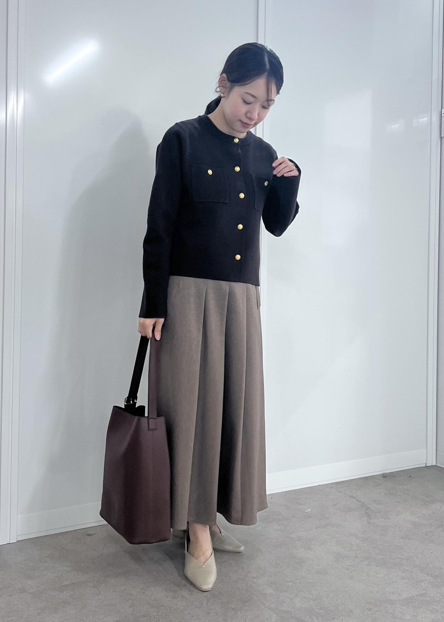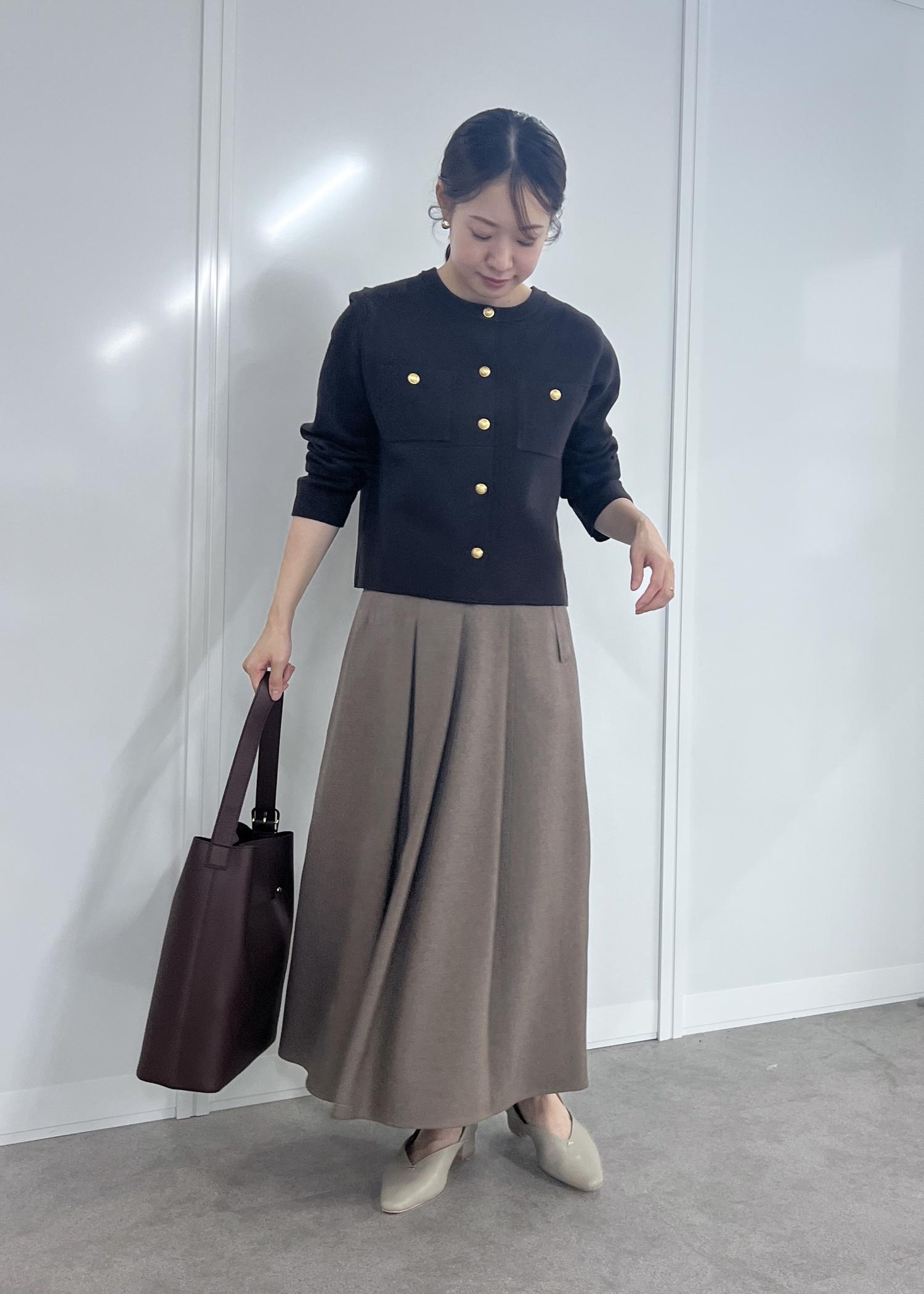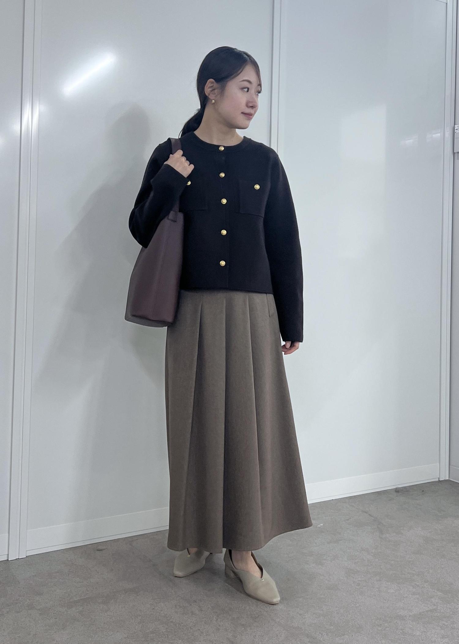 ブラウンのカーディガンにベージュのスカートで、秋を感じる装いに。