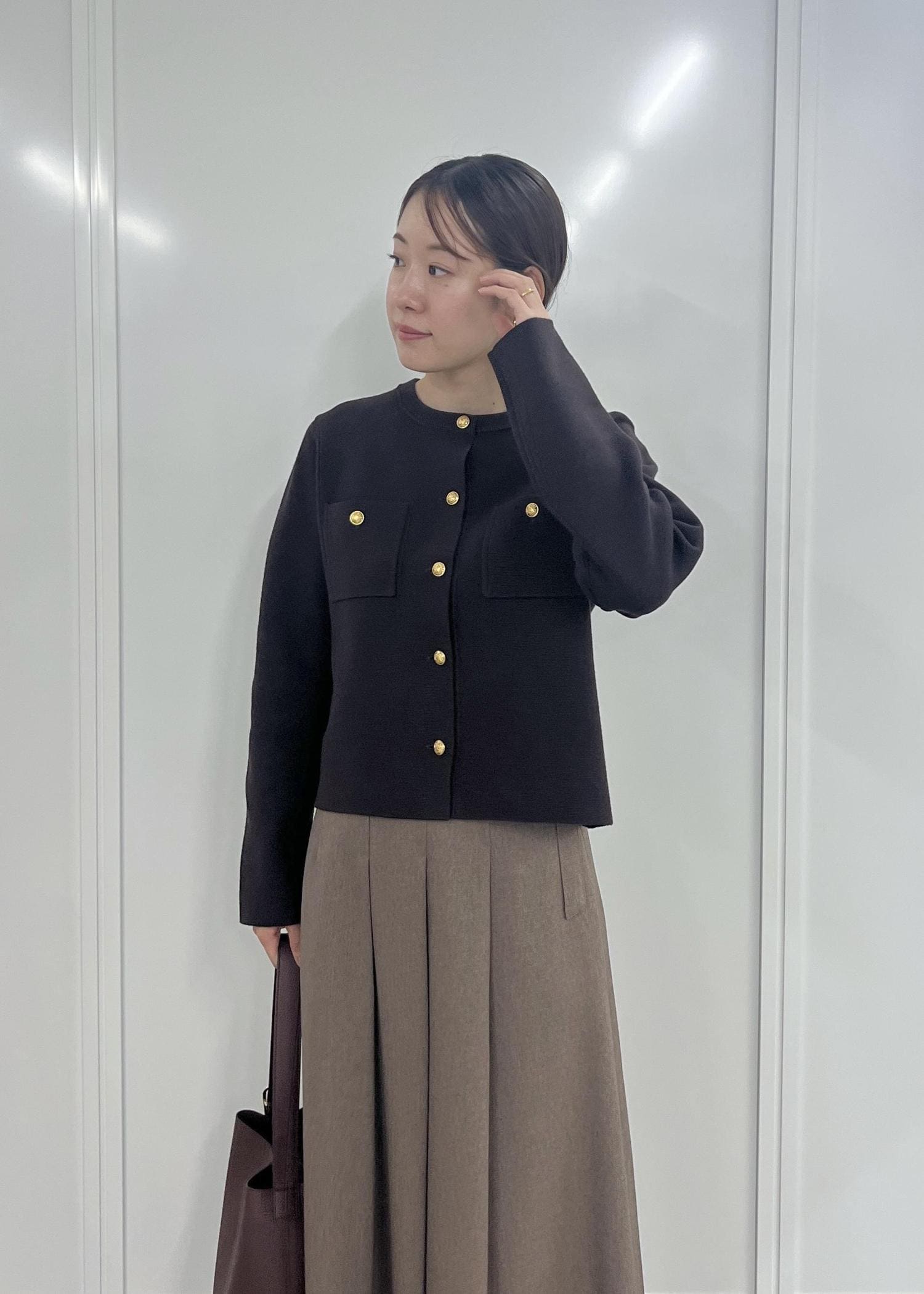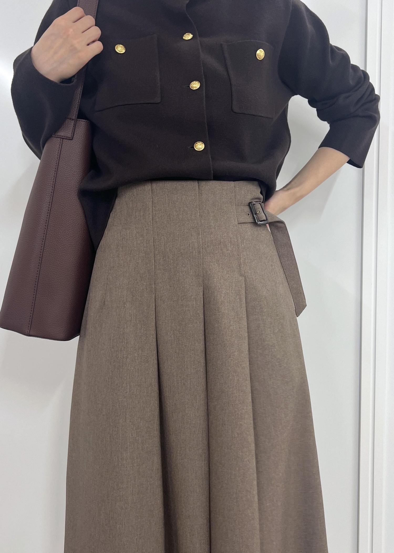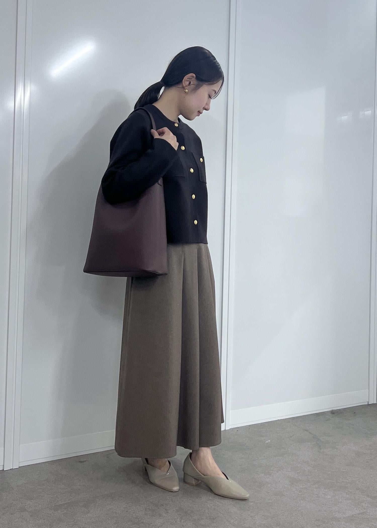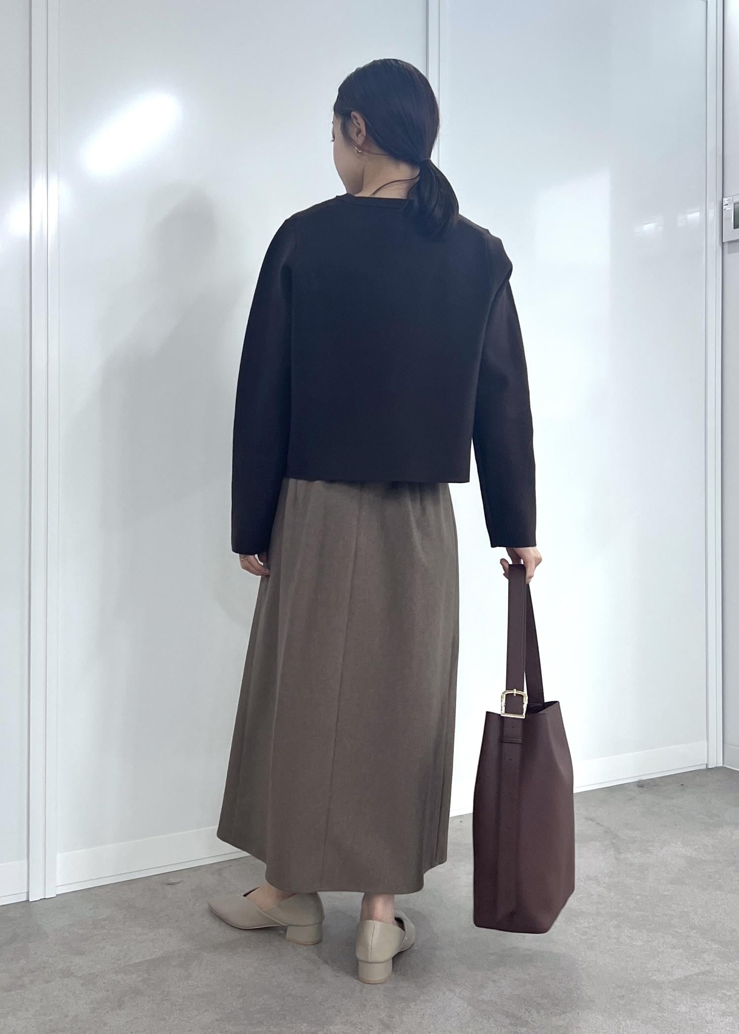 ブラウンのカーディガンにベージュのスカートで、秋を感じる装いに。