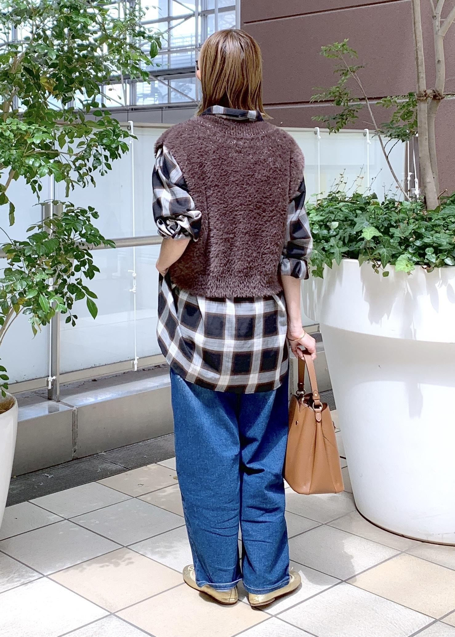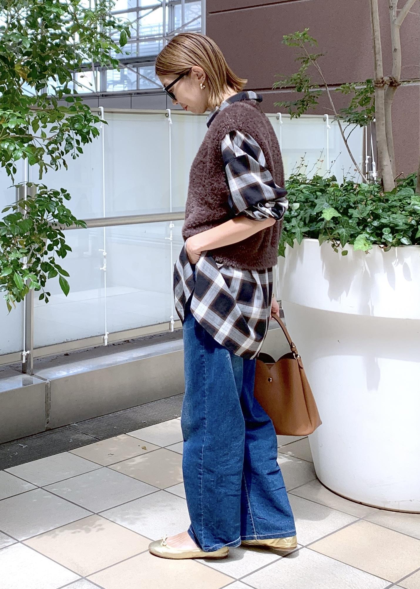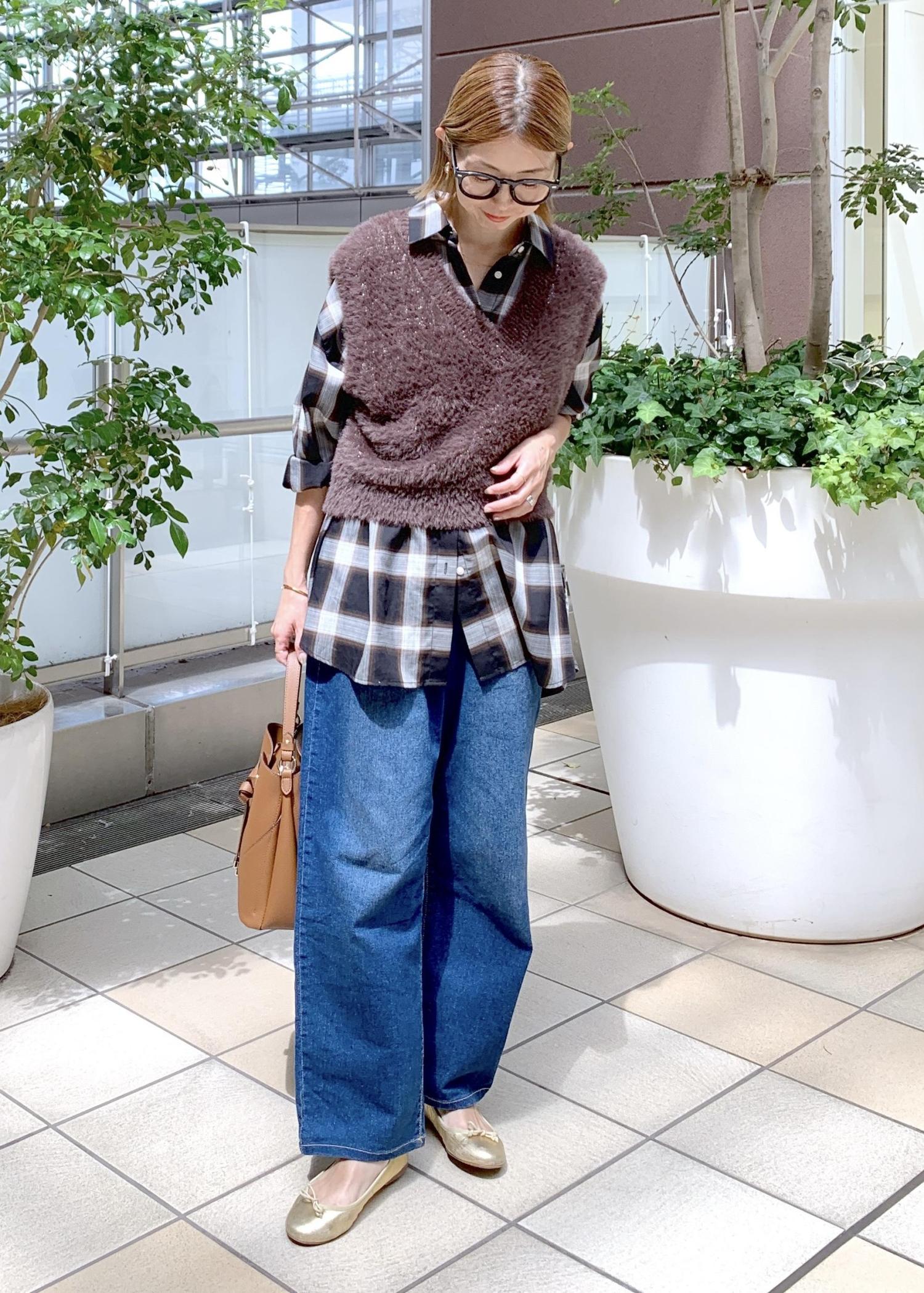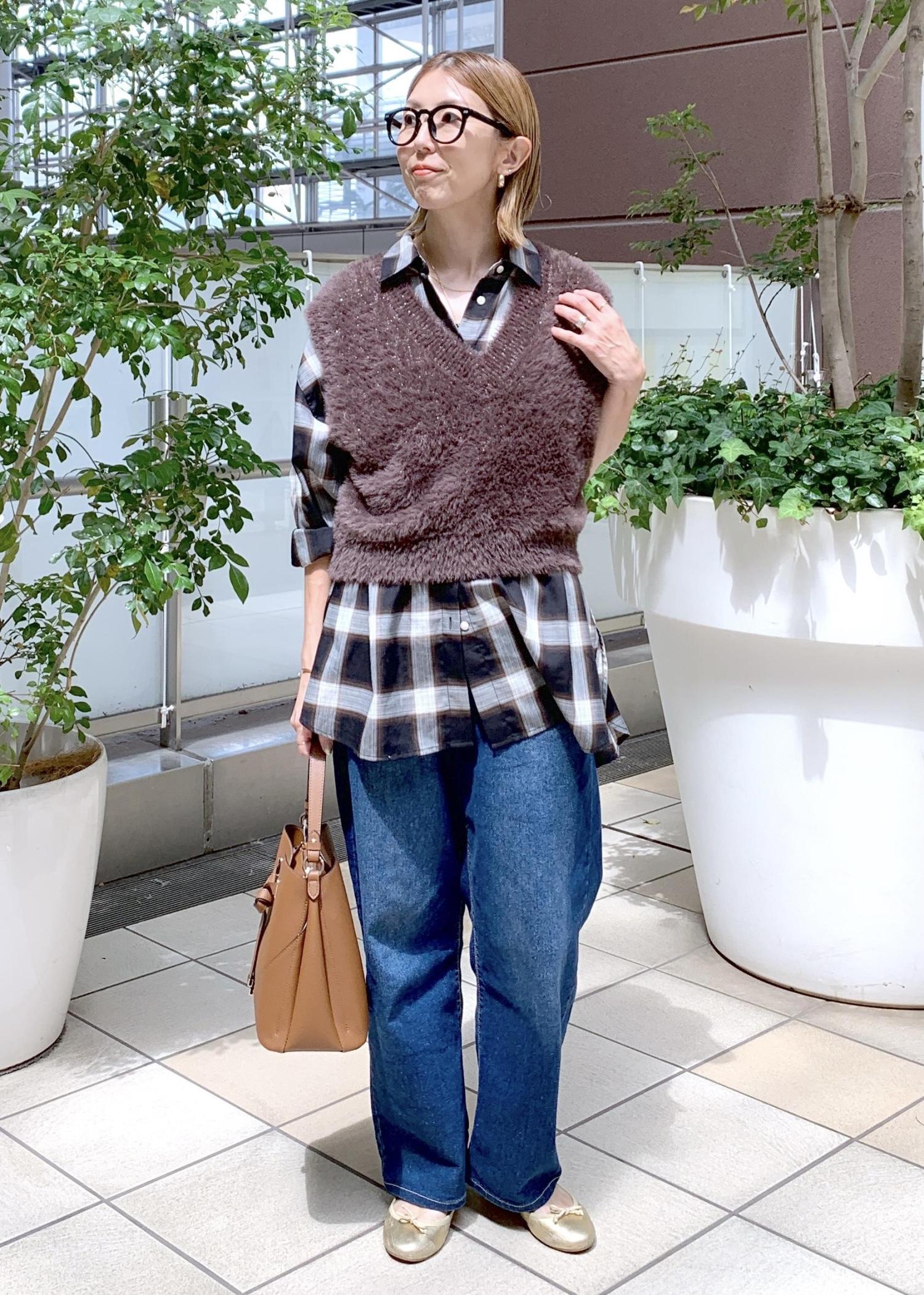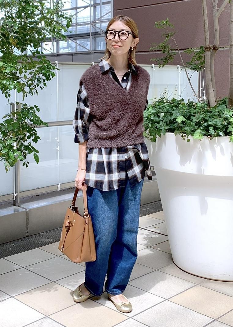 チェックシャツとフェザーニットベストをレイヤードした秋先取りスタイリング。