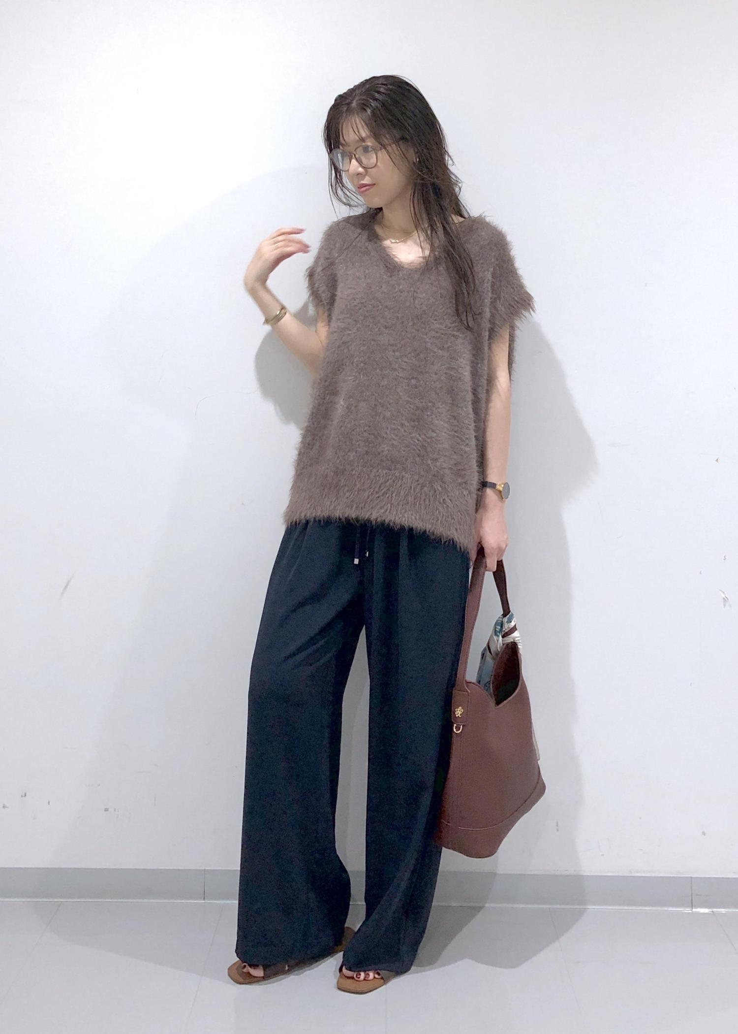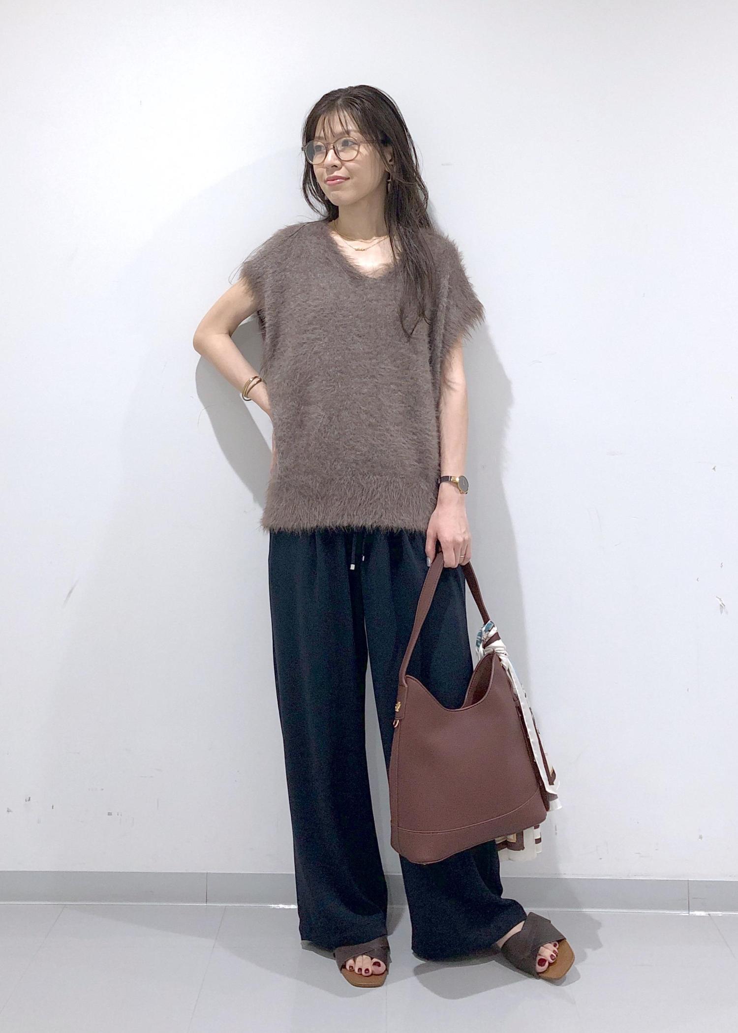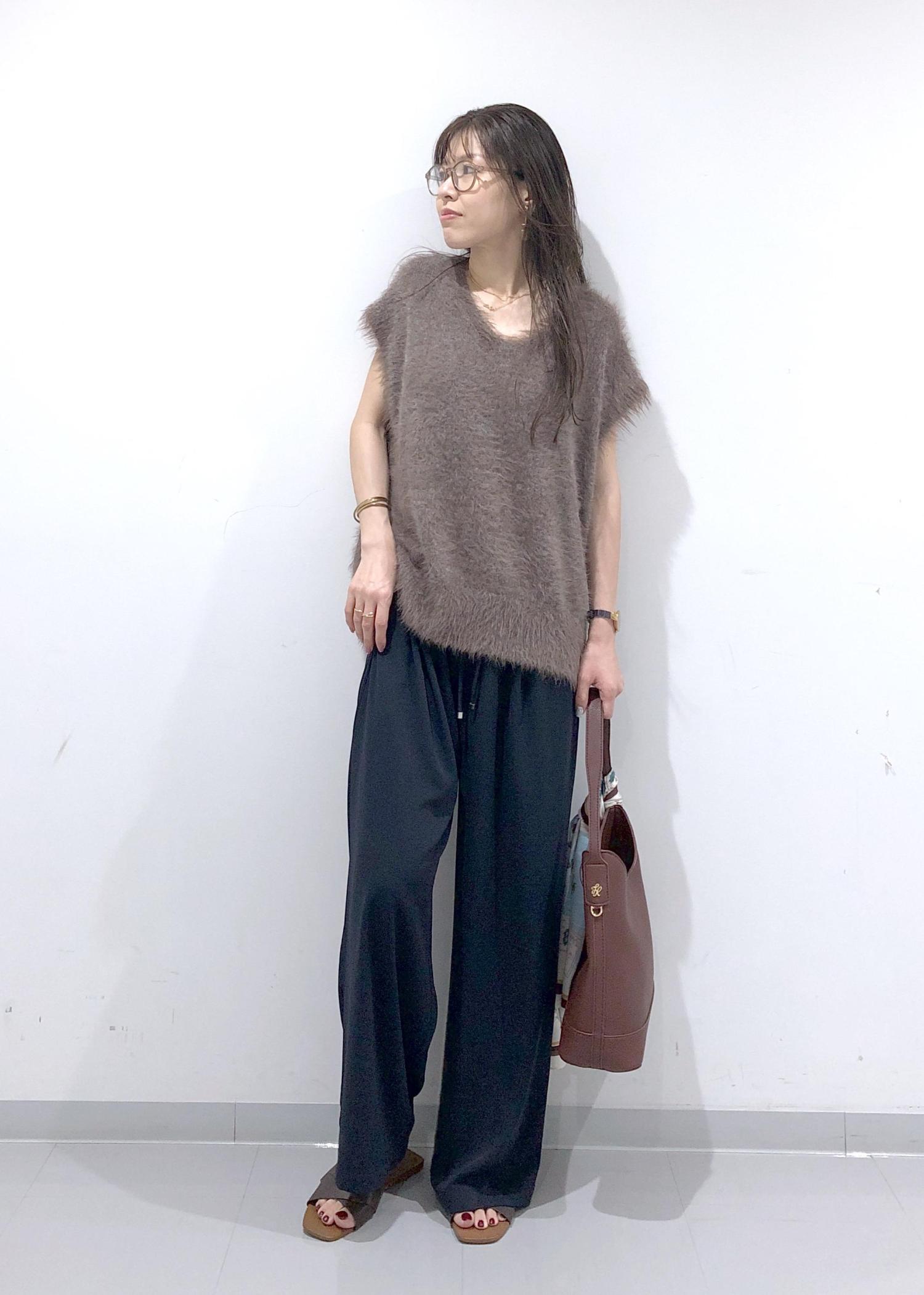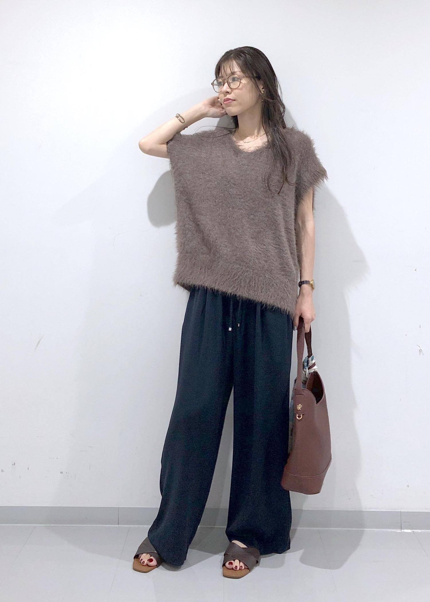 秋先取りのシャギーニットベストに、ゆるっとサラッと落ち感のあるイージーパンツを合わせたリラックスコーデ。