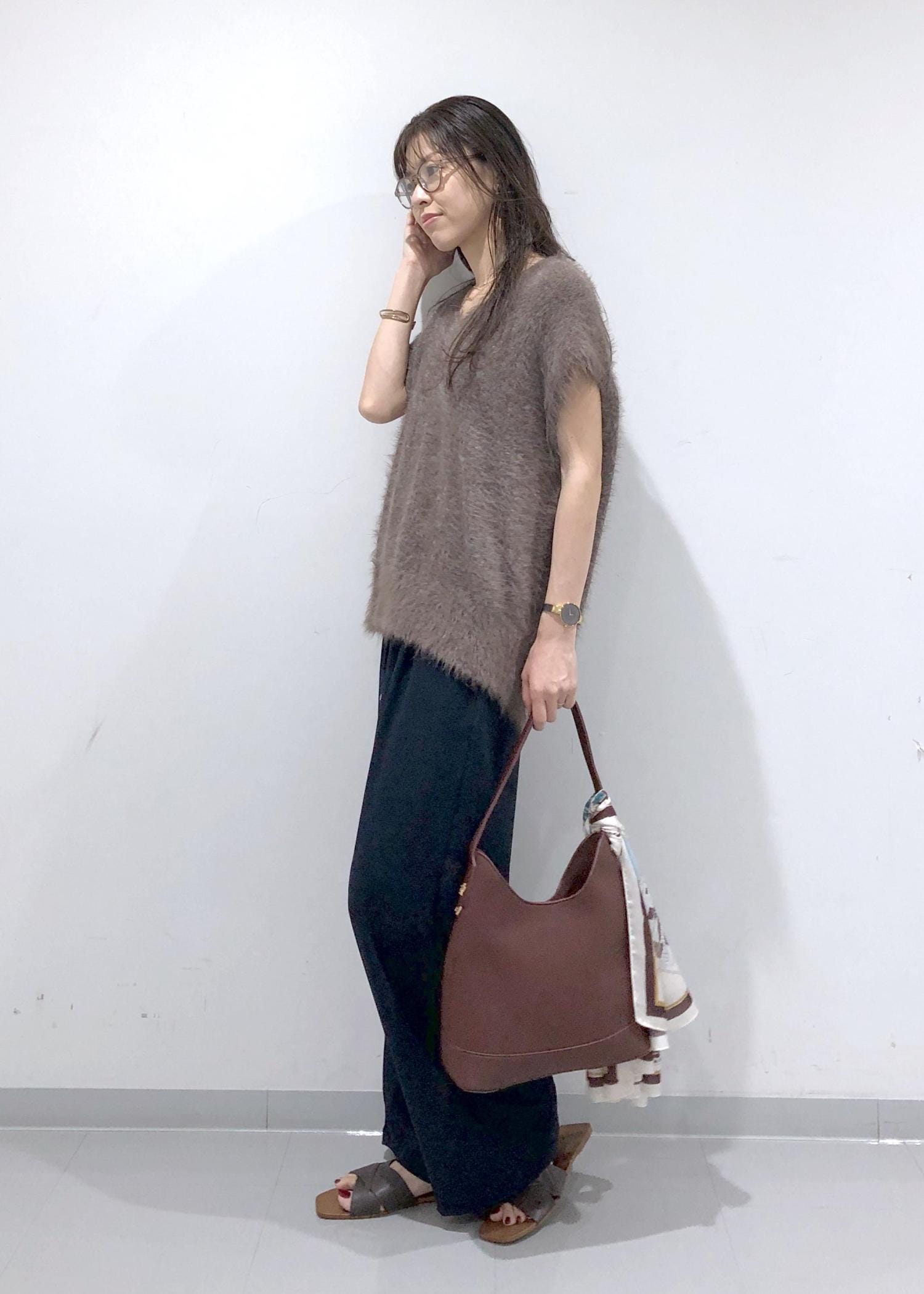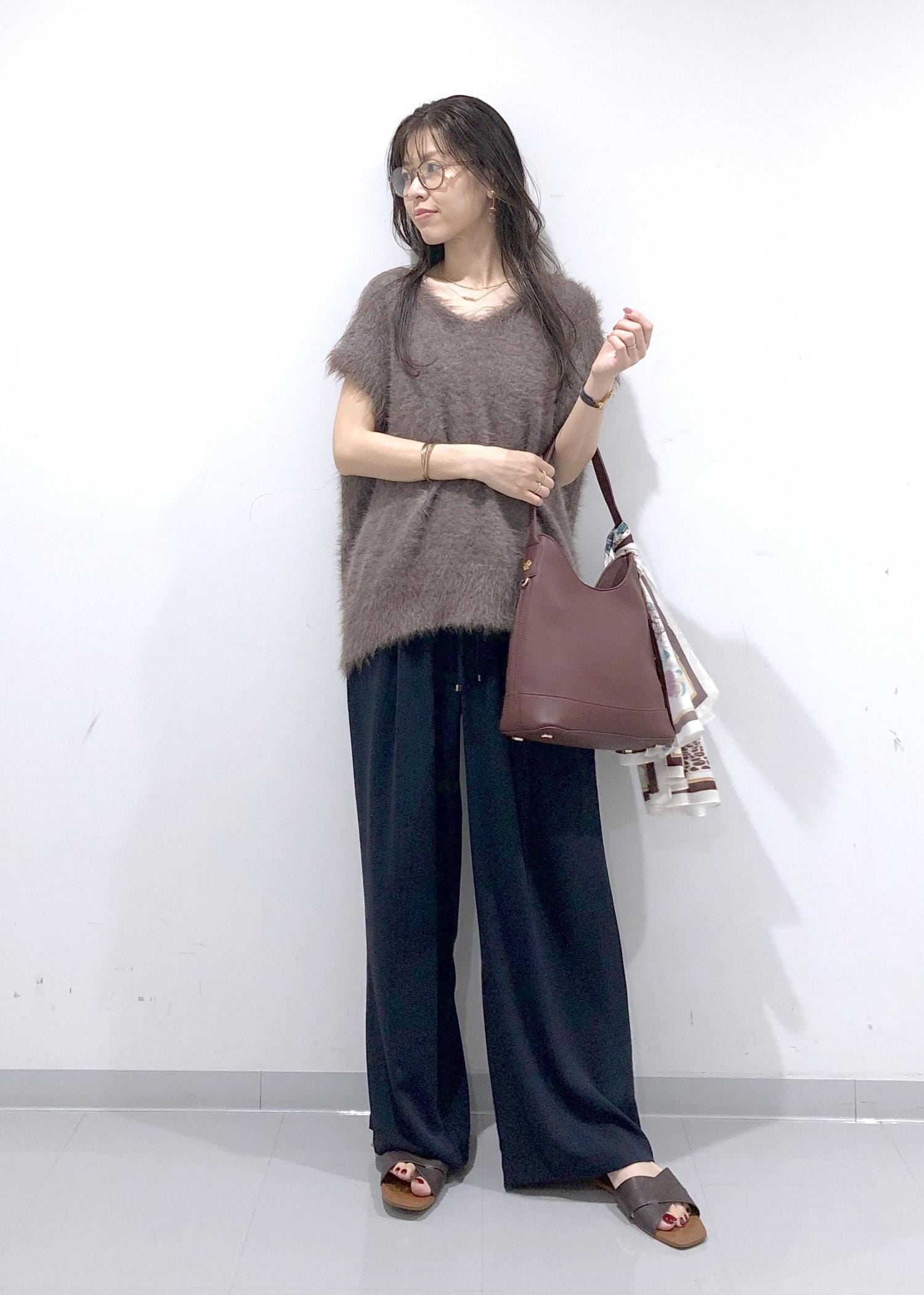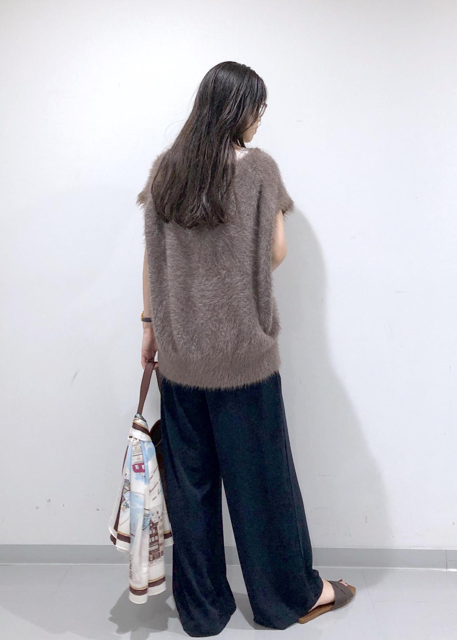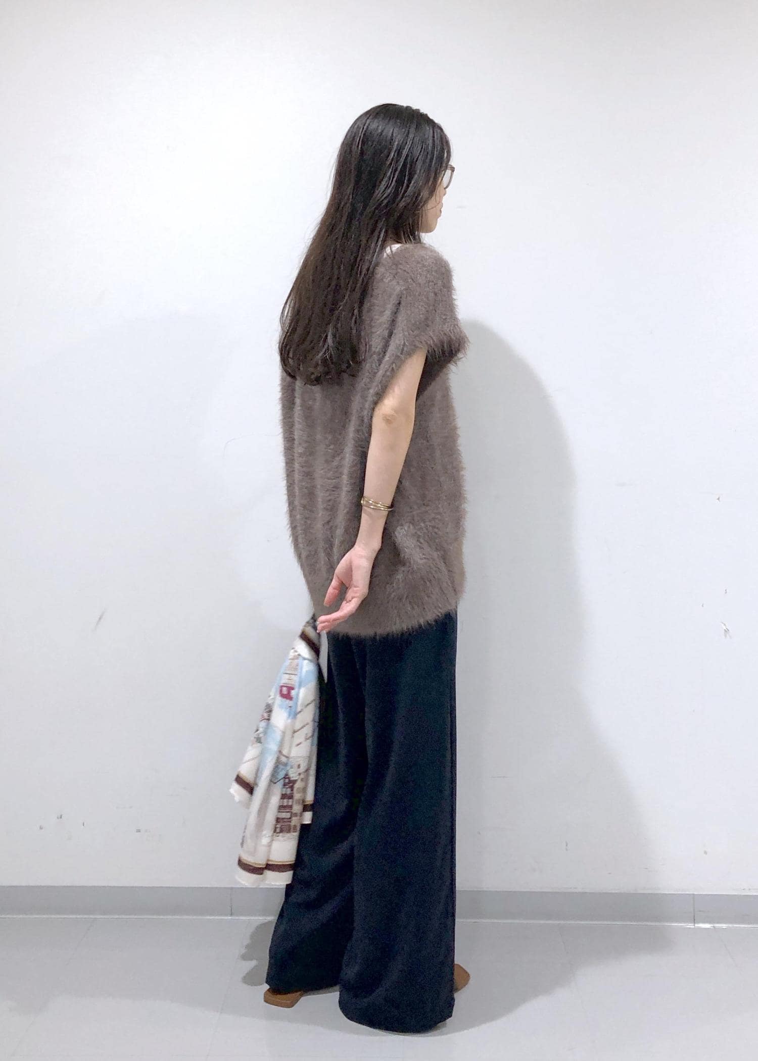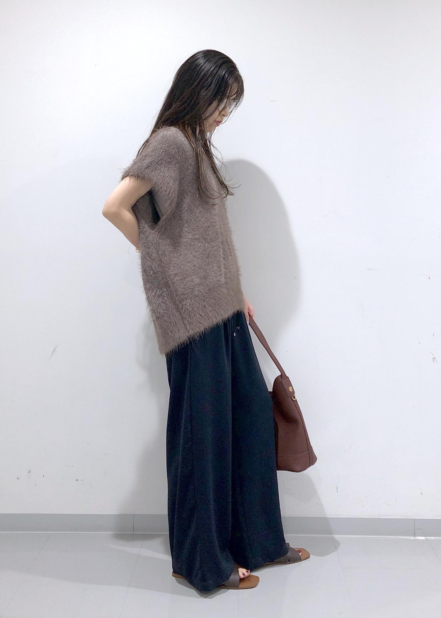秋先取りのシャギーニットベストに、ゆるっとサラッと落ち感のあるイージーパンツを合わせたリラックスコーデ。