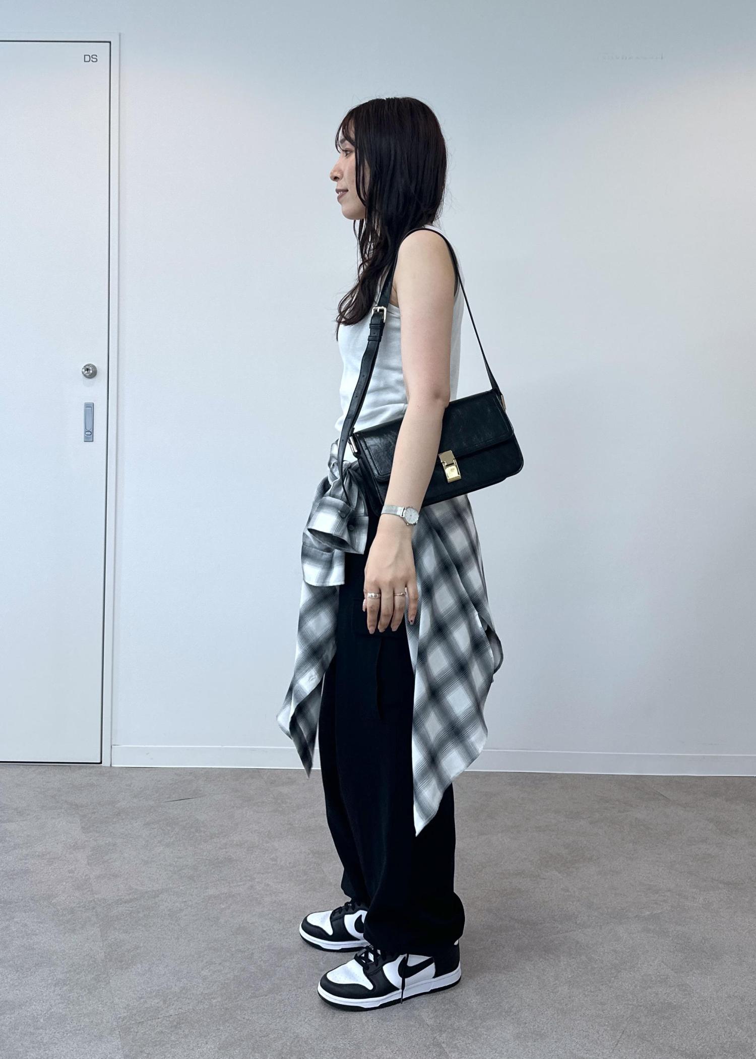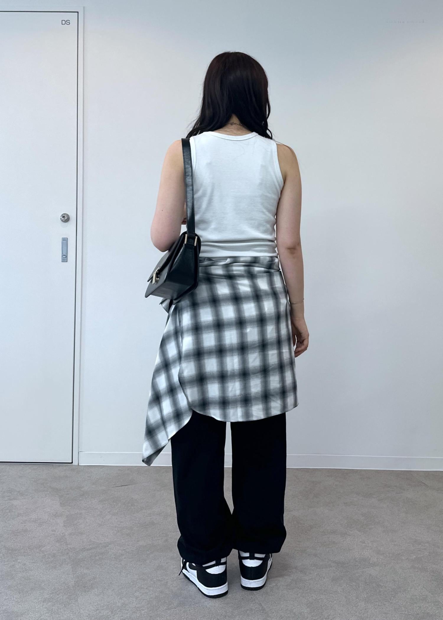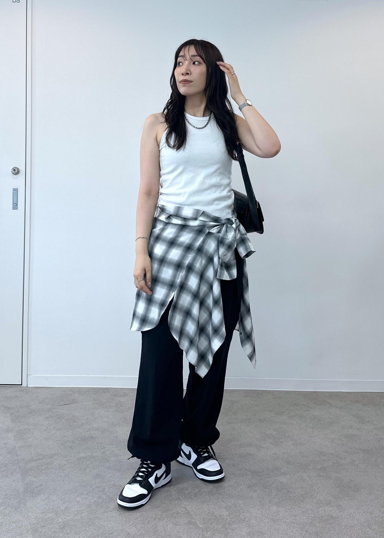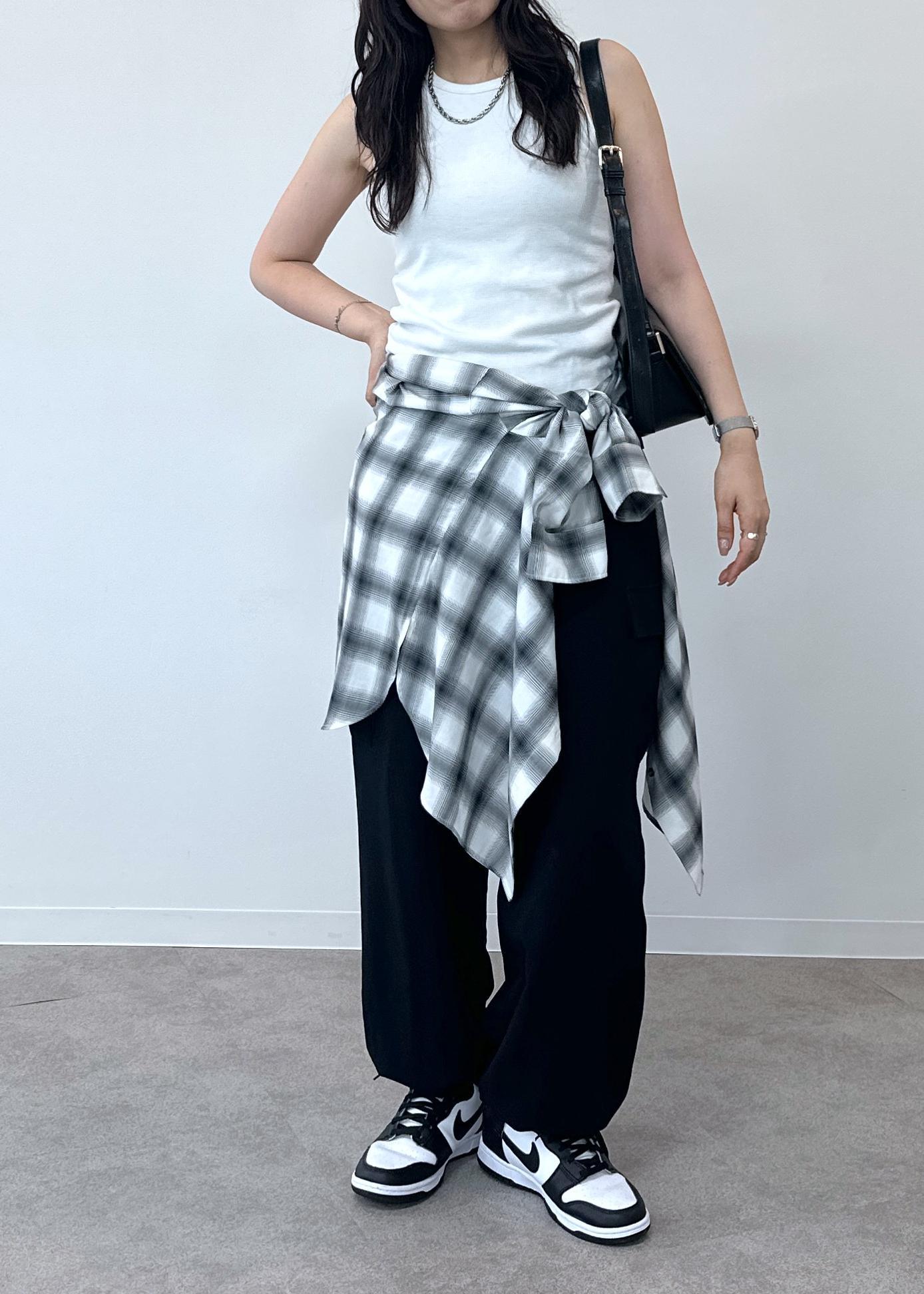 シンプルなタンクトップにシャツを腰巻きしたスタイルです。