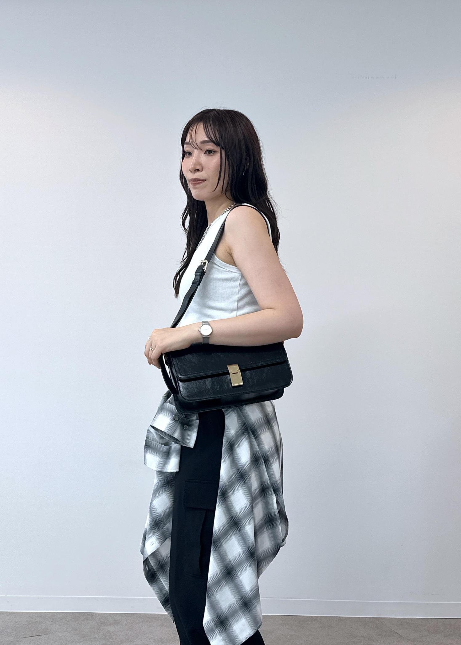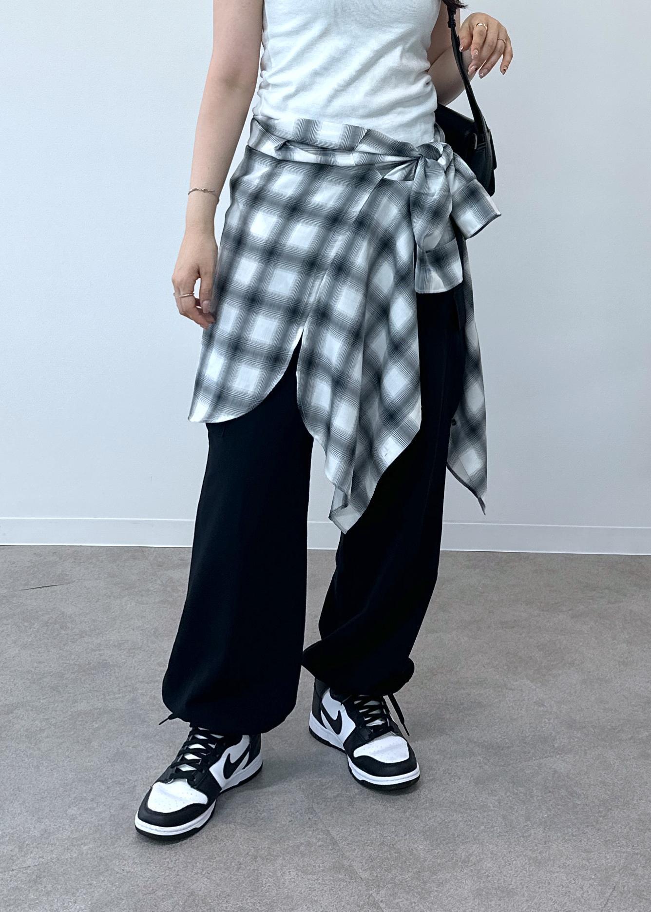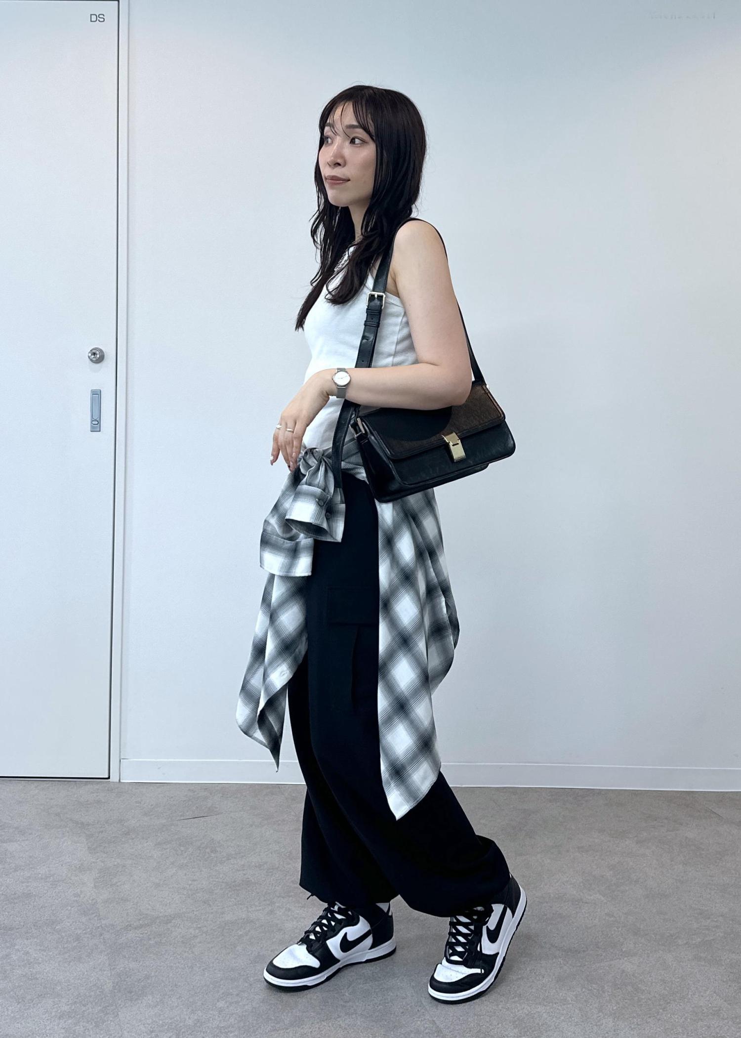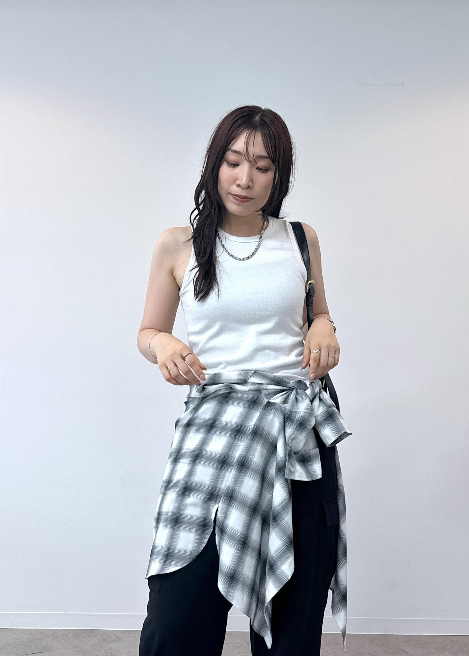 シンプルなタンクトップにシャツを腰巻きしたスタイルです。