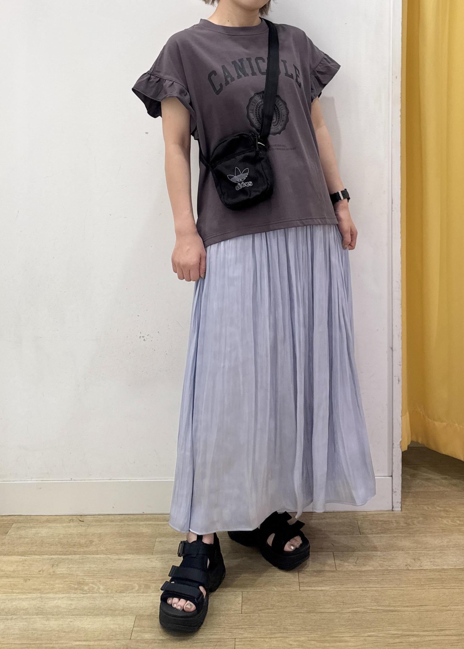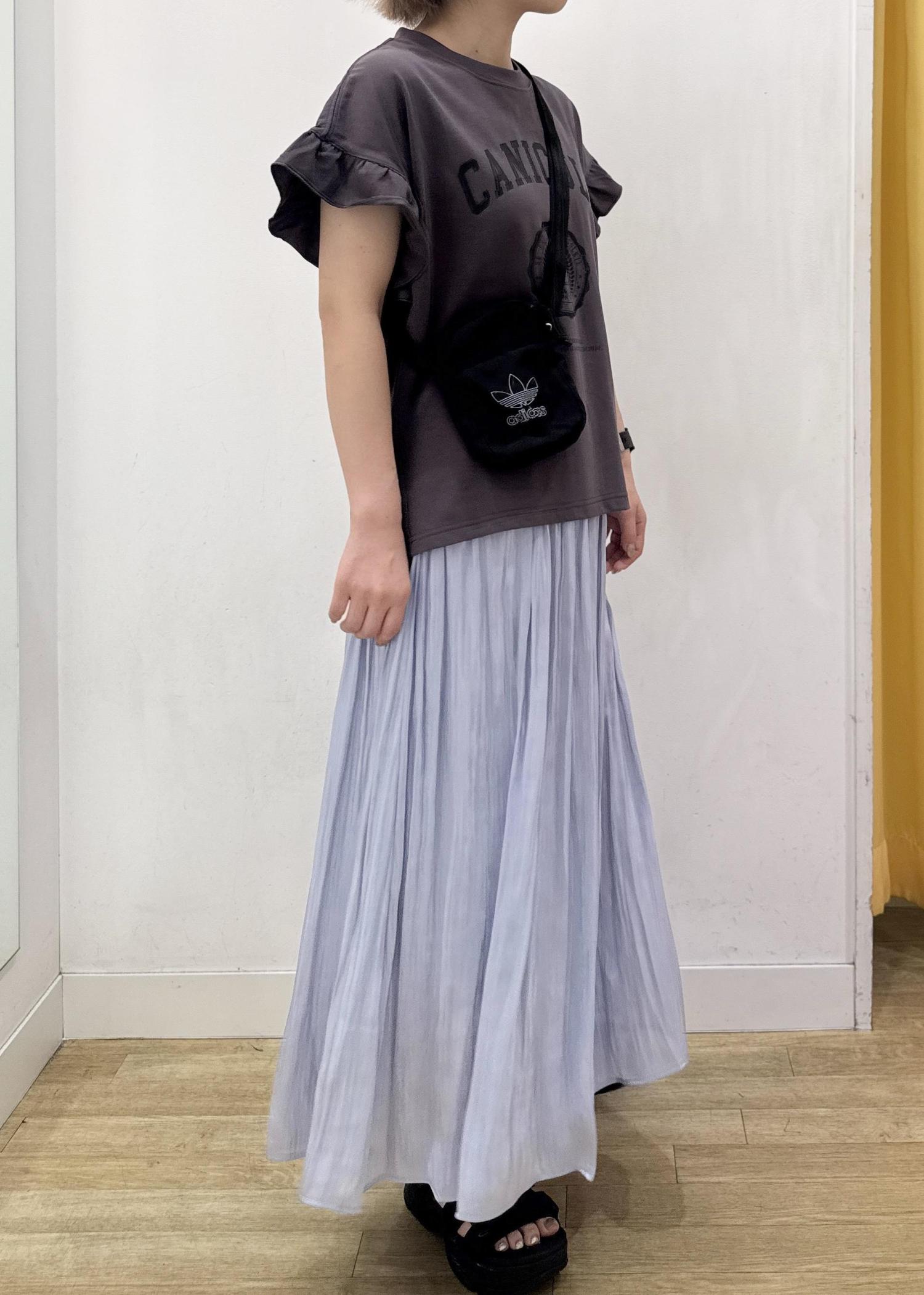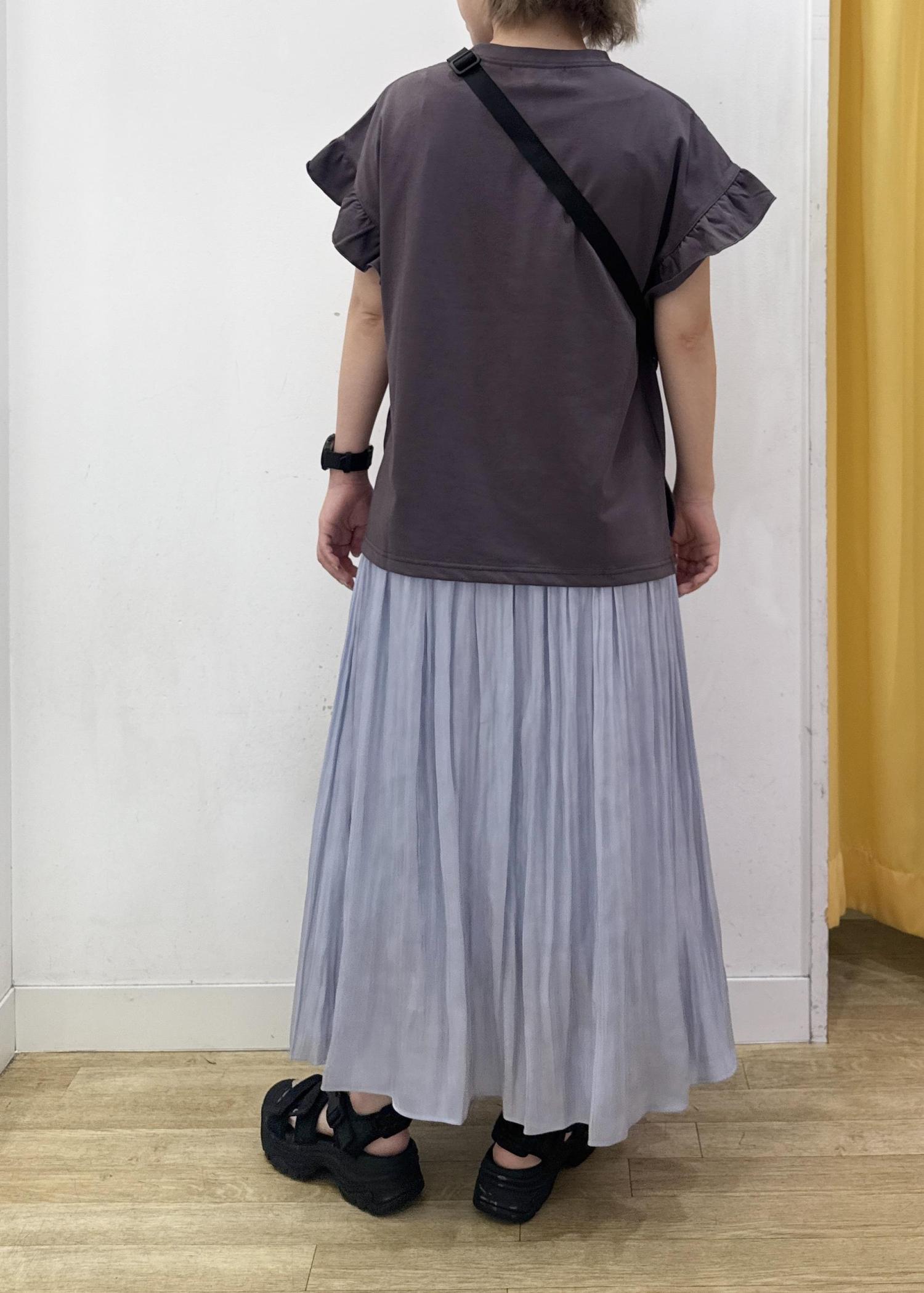細かめのプリーツデザインなので、ボリューム感も抑えめなキレイなフレアシルエットで穿いていただけます。 -