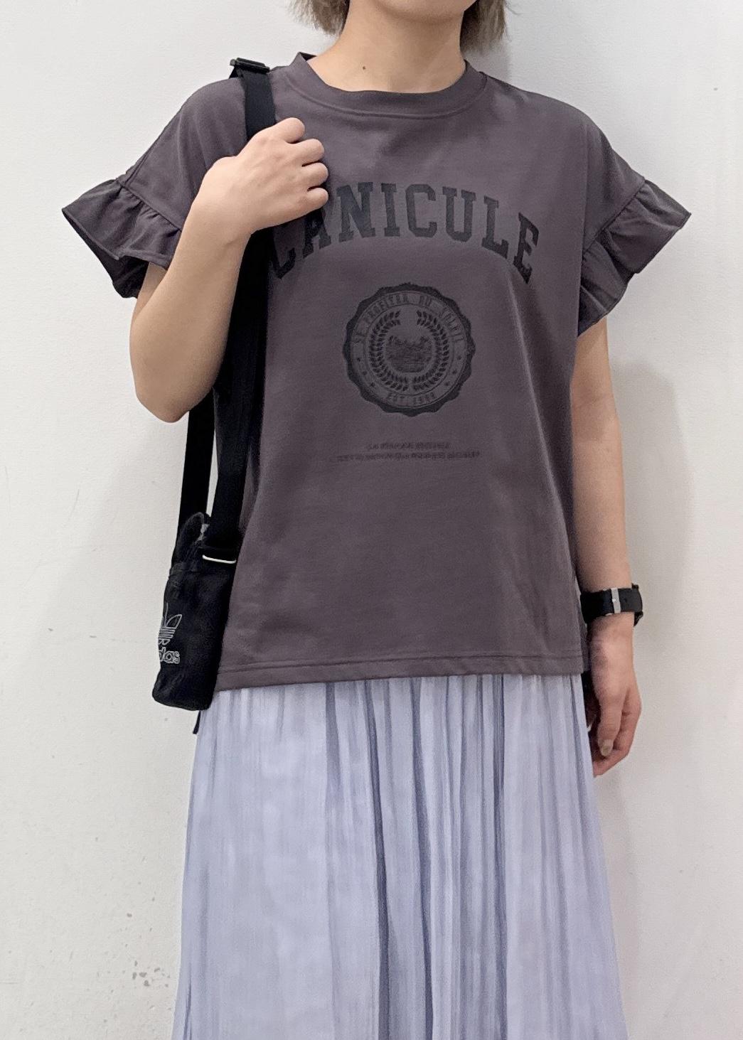 ロゴTシャツはシンプルでカジュアルになりがちですが、お袖のフリルデザインが可愛さをプラスしてくれるので1枚でオシャレに