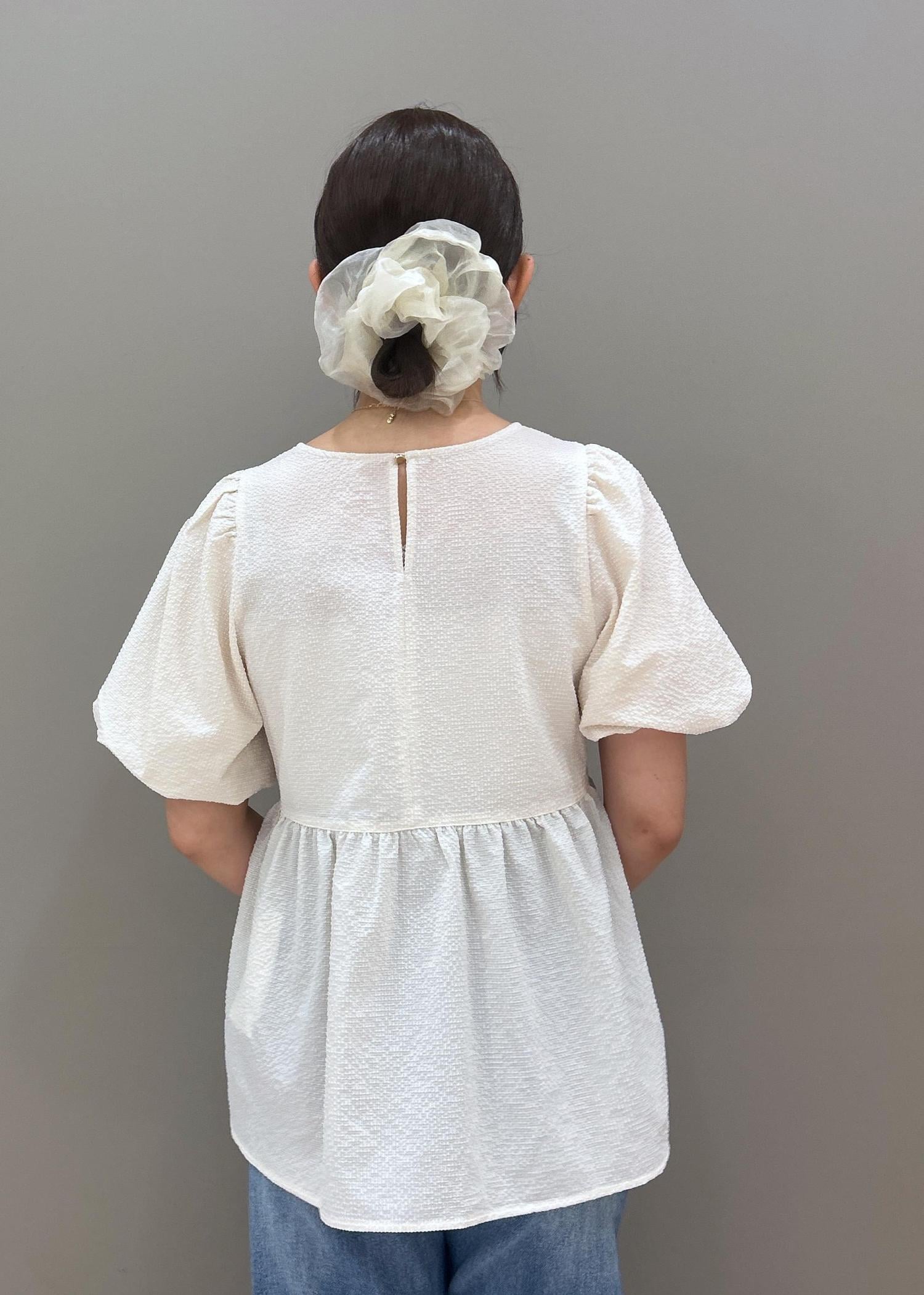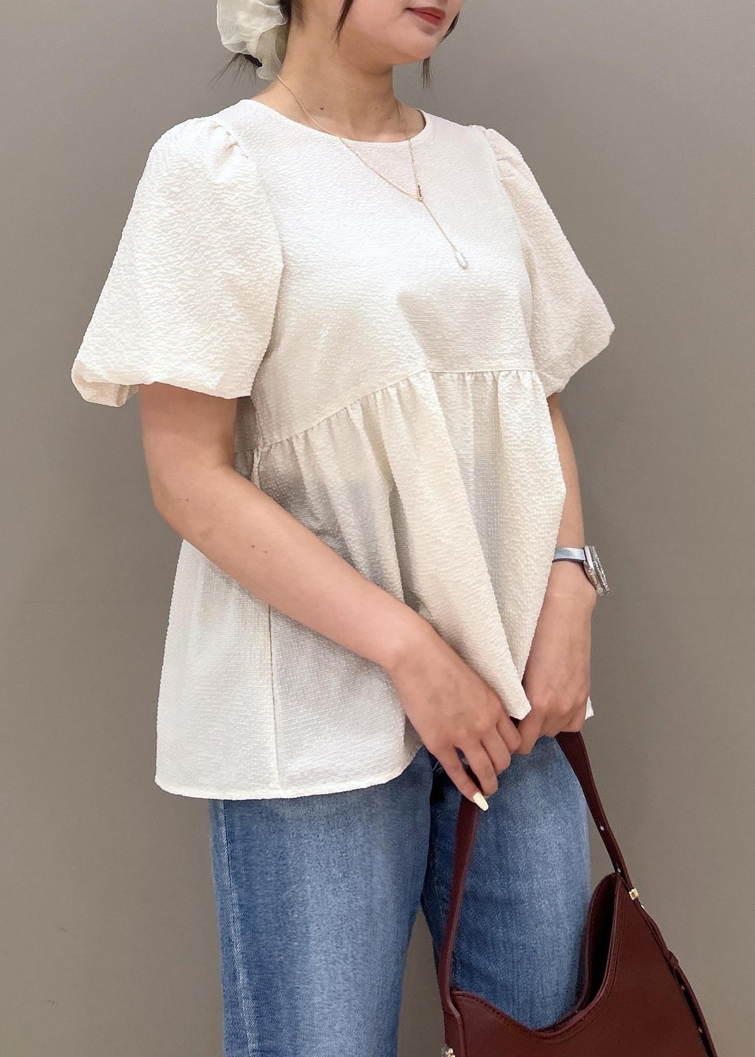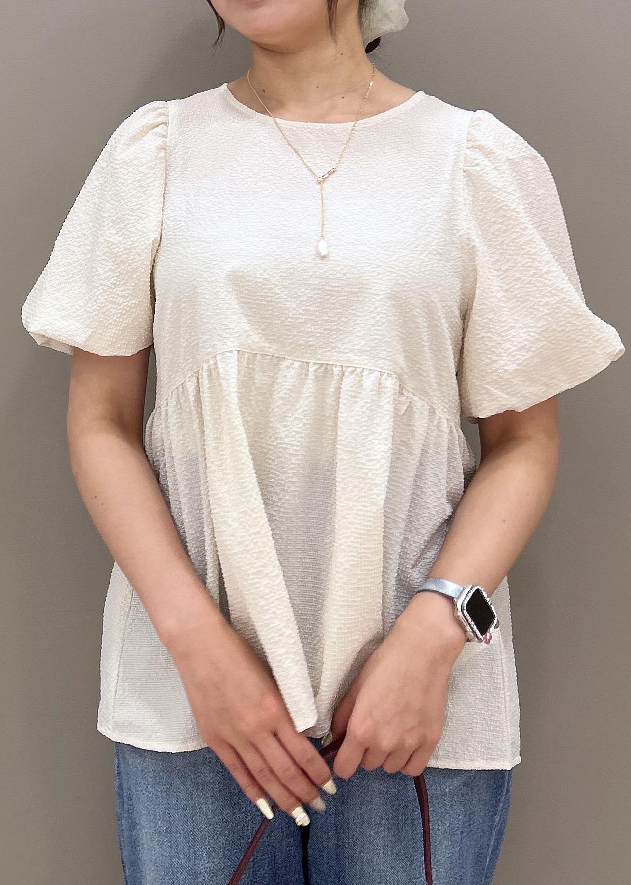 首元は少し余裕のあるデザインなのでふんわりしたシルエットでも膨張を気にせず着ていただけます!