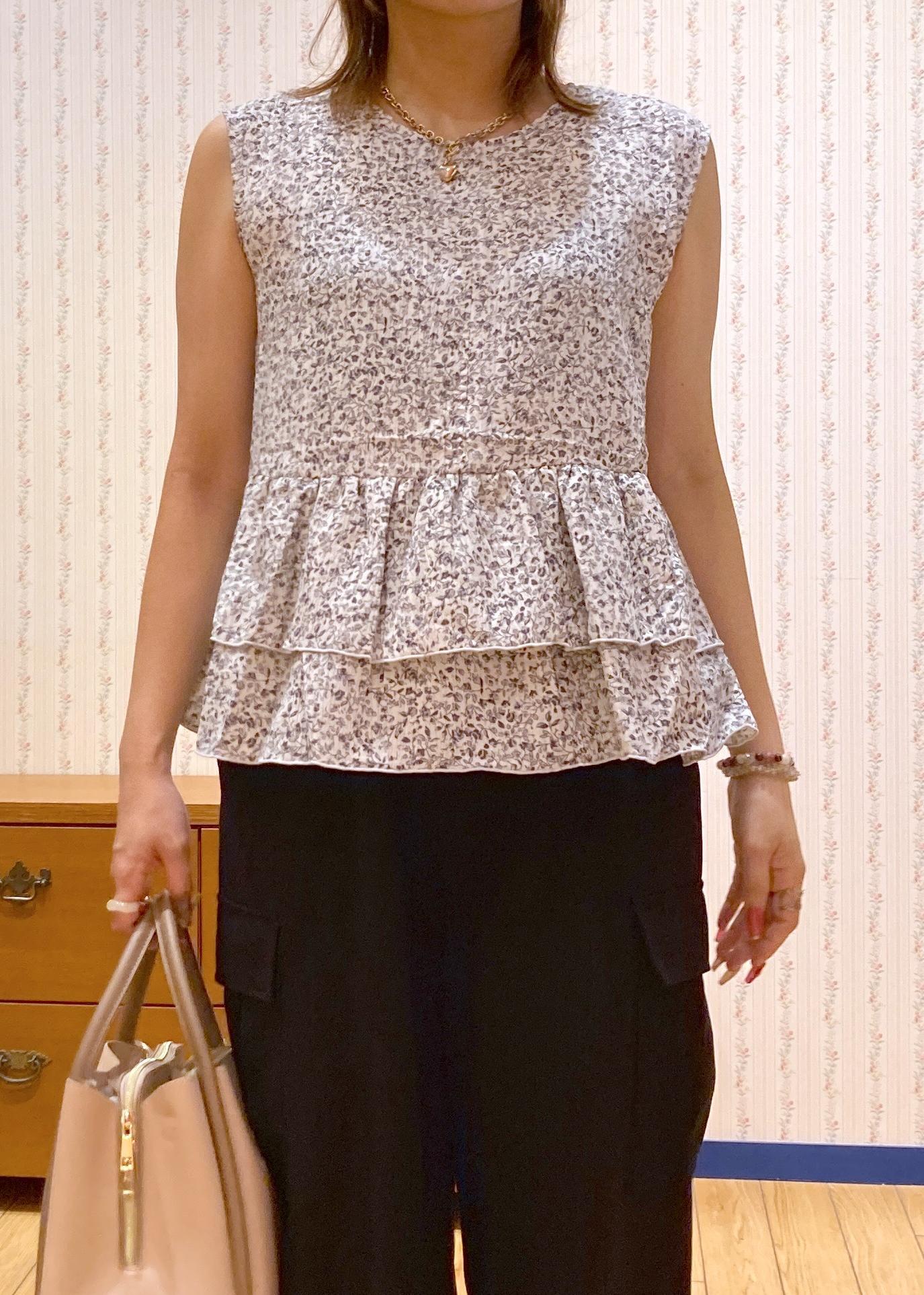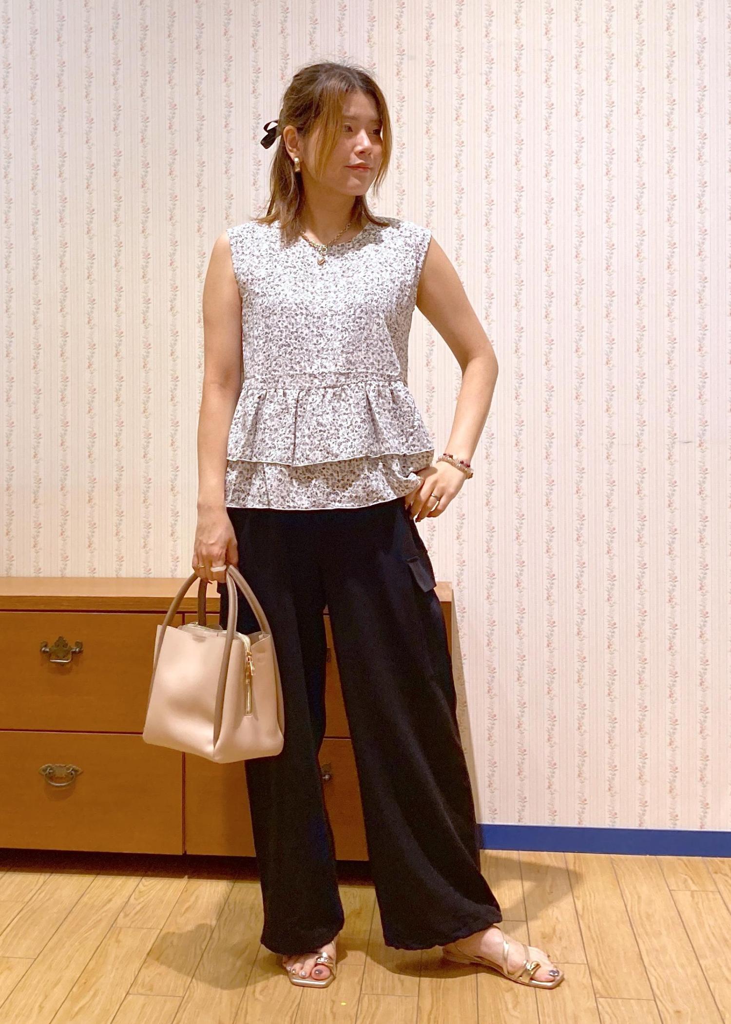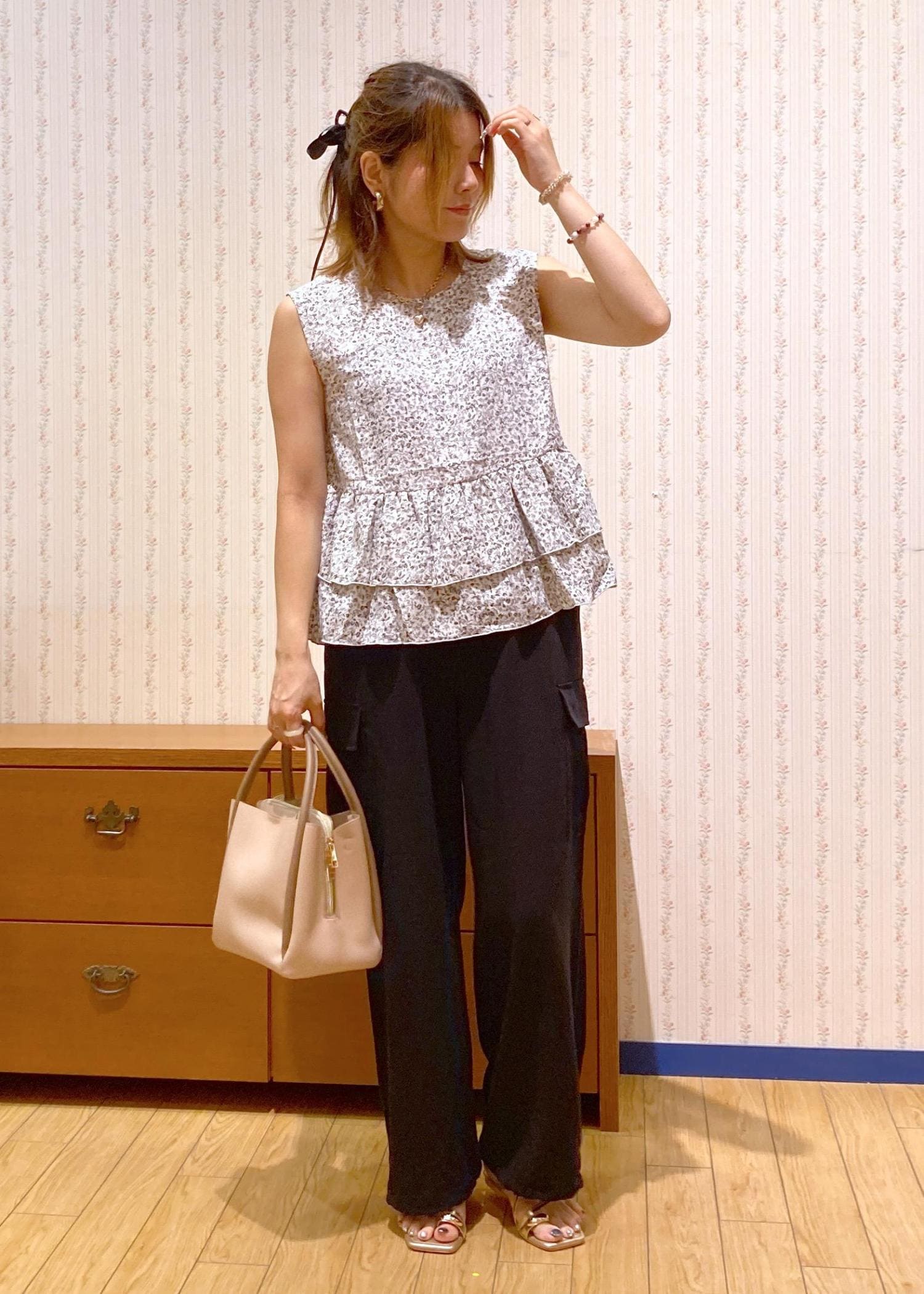 小花柄のノースリーブブラウスにカーゴパンツを合わせたキレイめカジュアルなミックスコーディネートです。