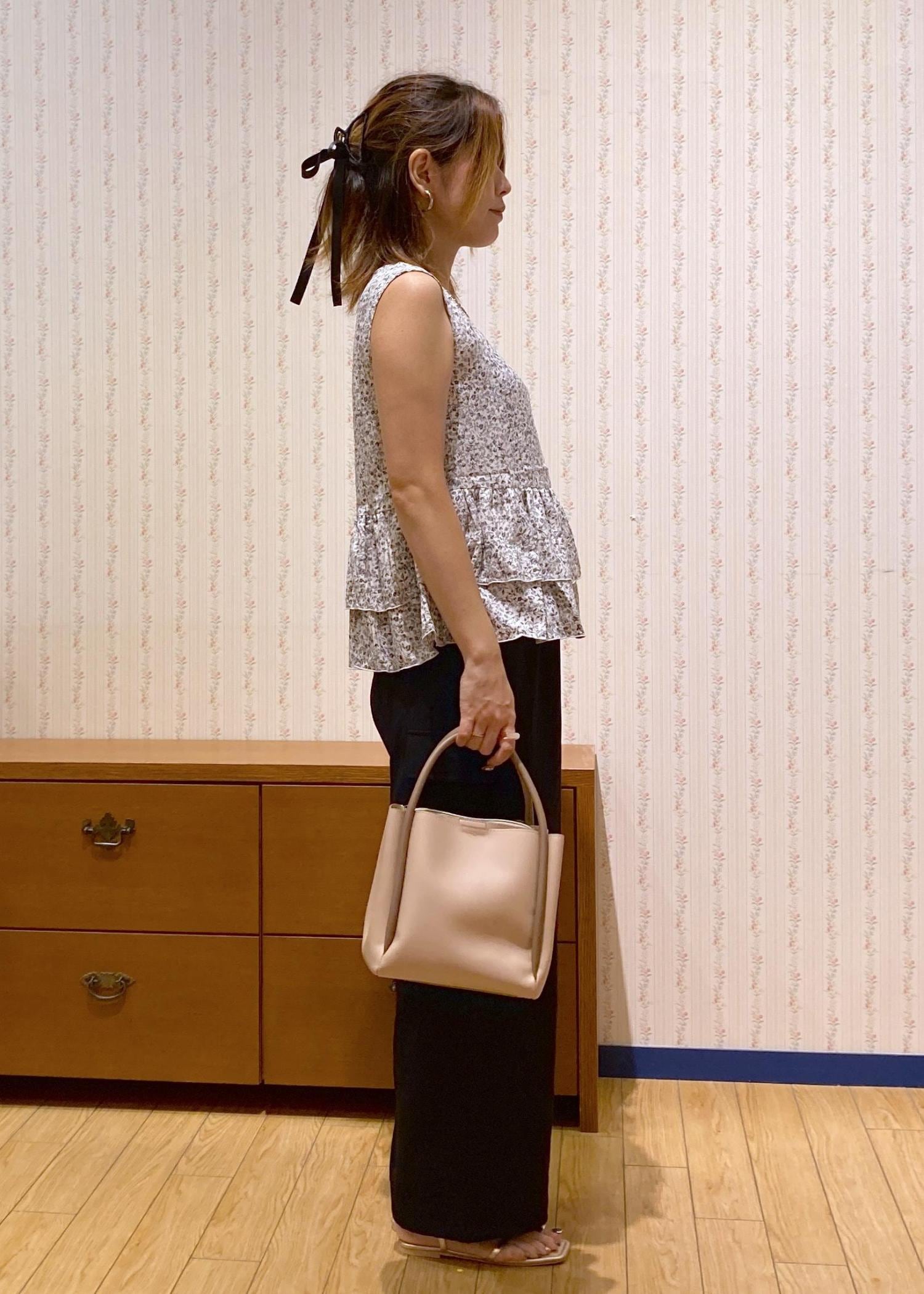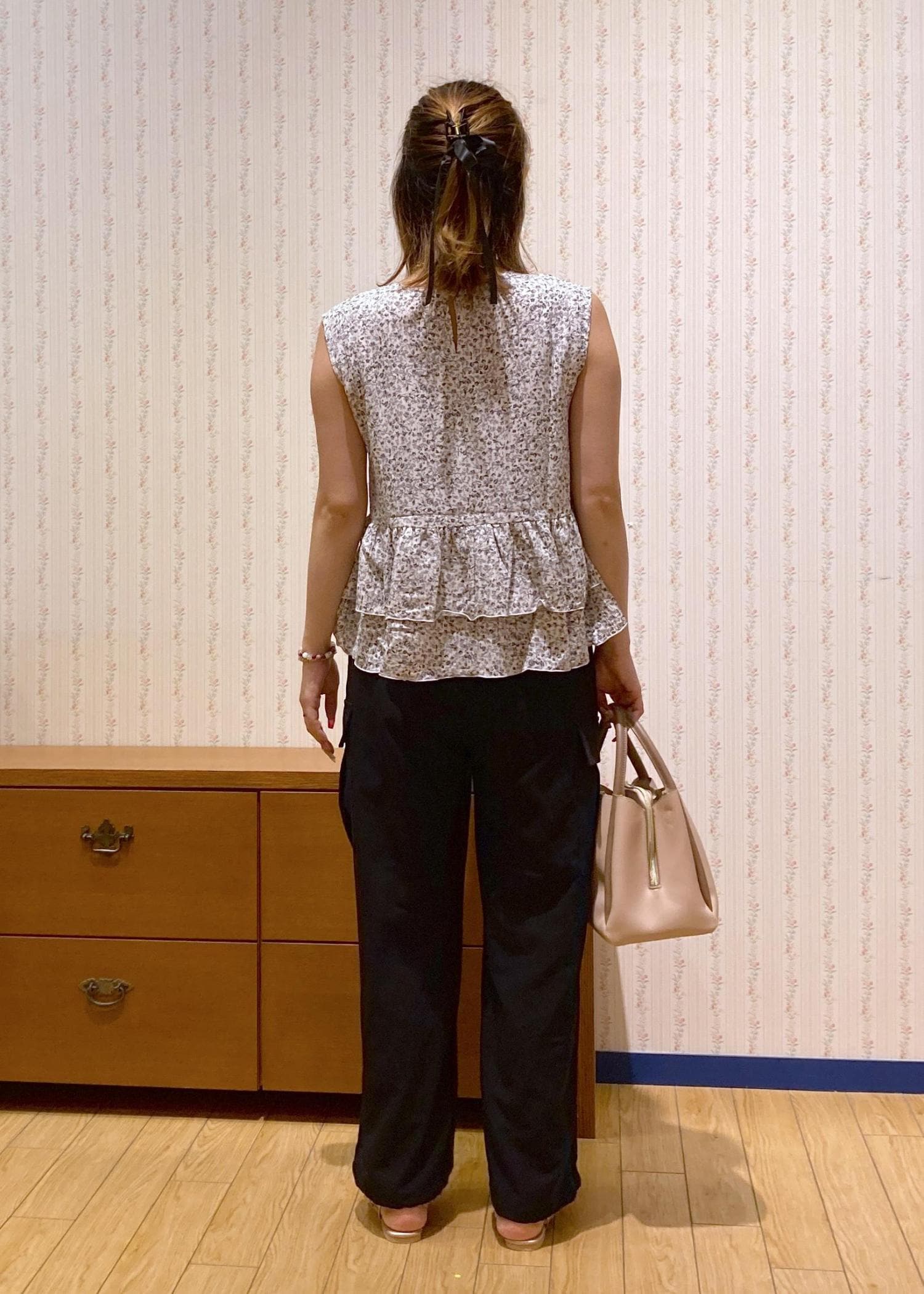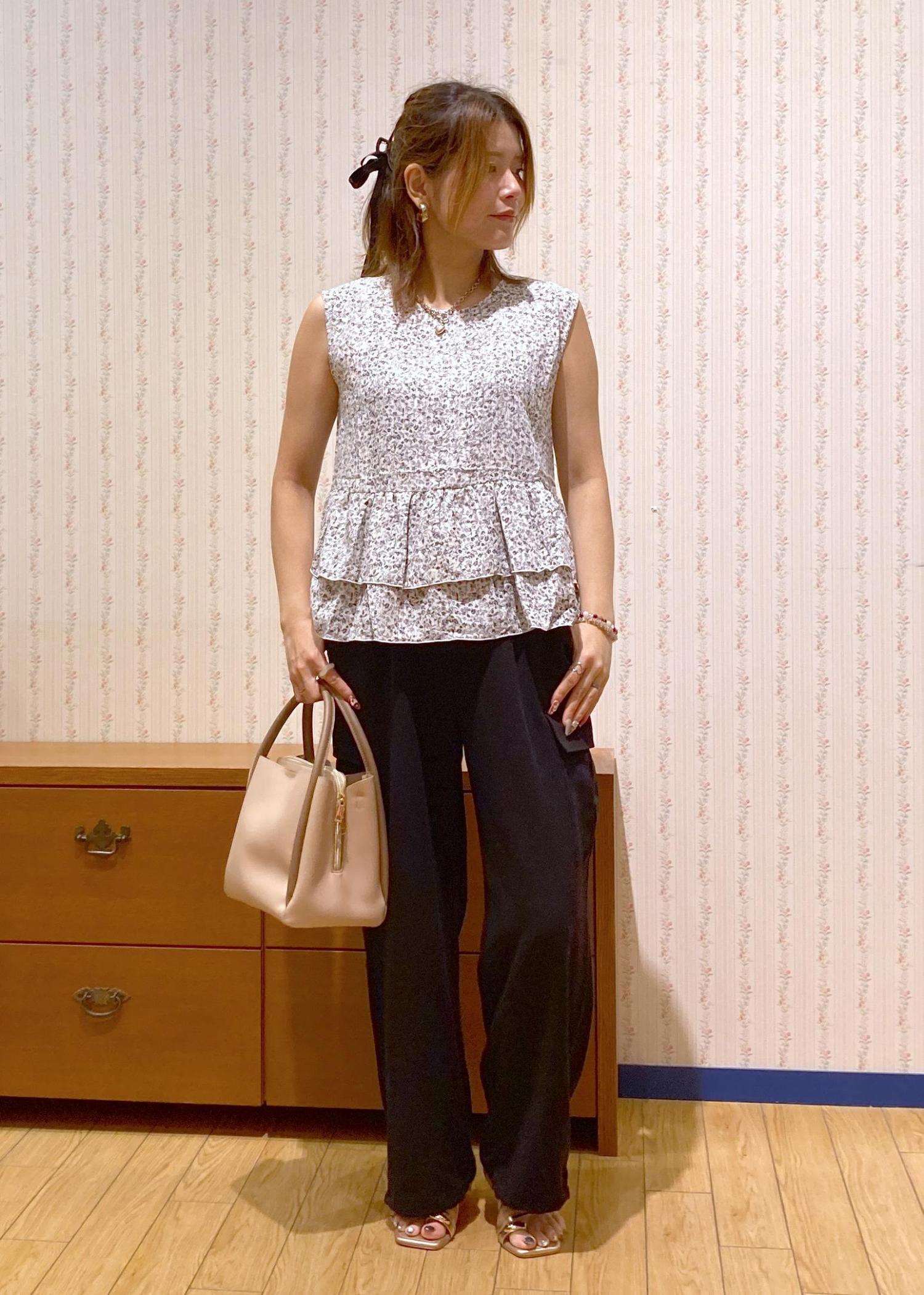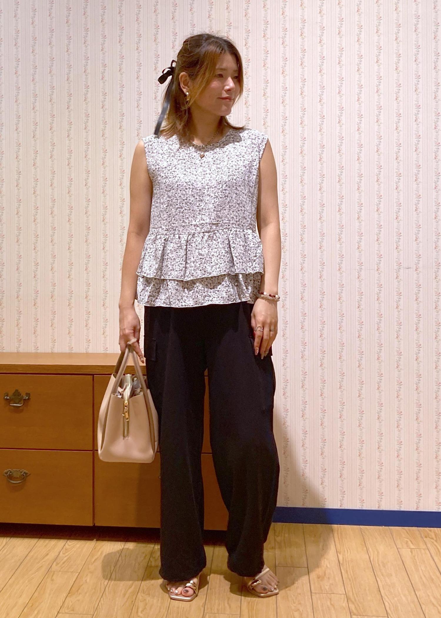 小花柄のノースリーブブラウスにカーゴパンツを合わせたキレイめカジュアルなミックスコーディネートです。
