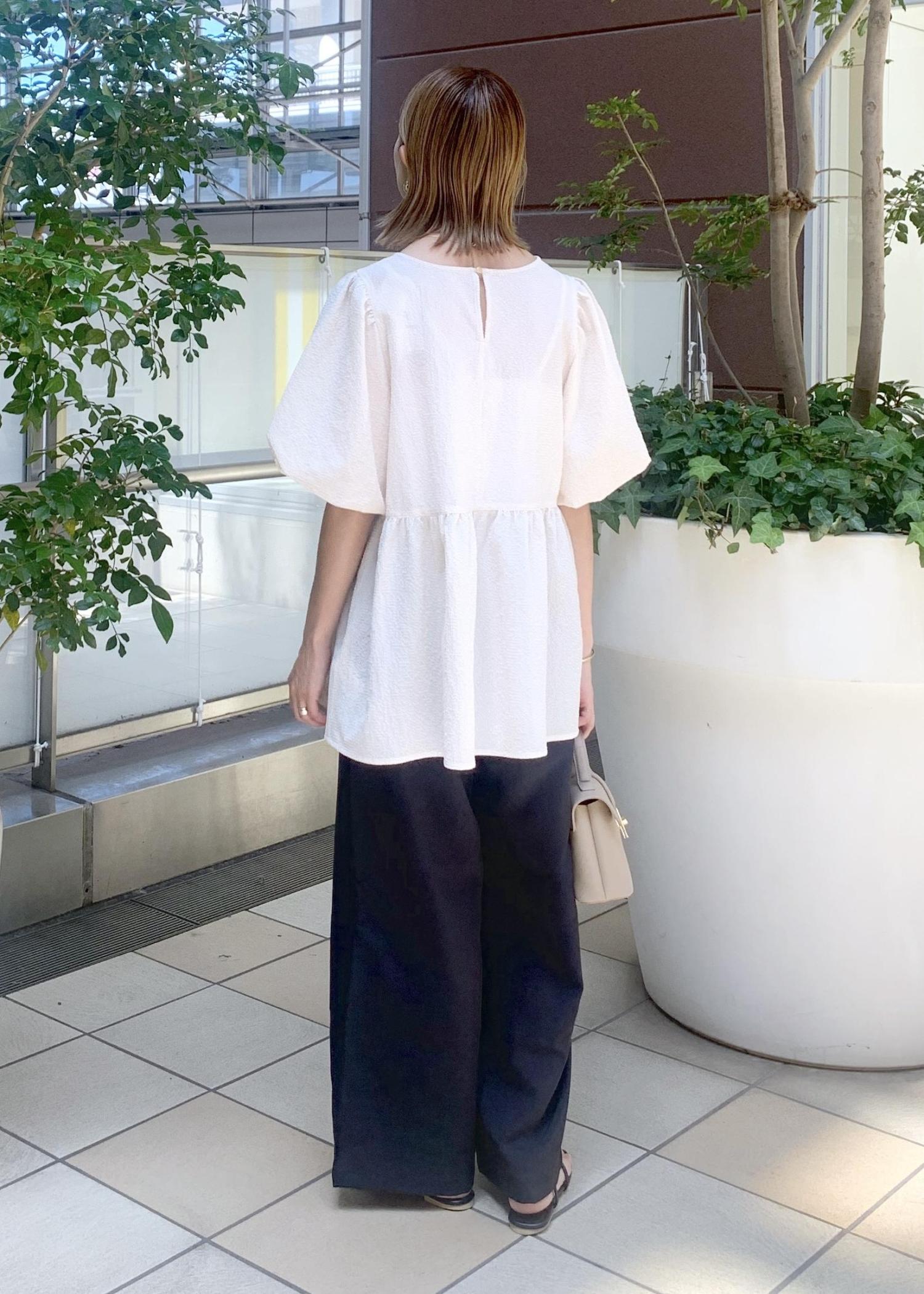 ハイウエスト切り替えのペプラムシルエットで体型カバーしやすい。 -