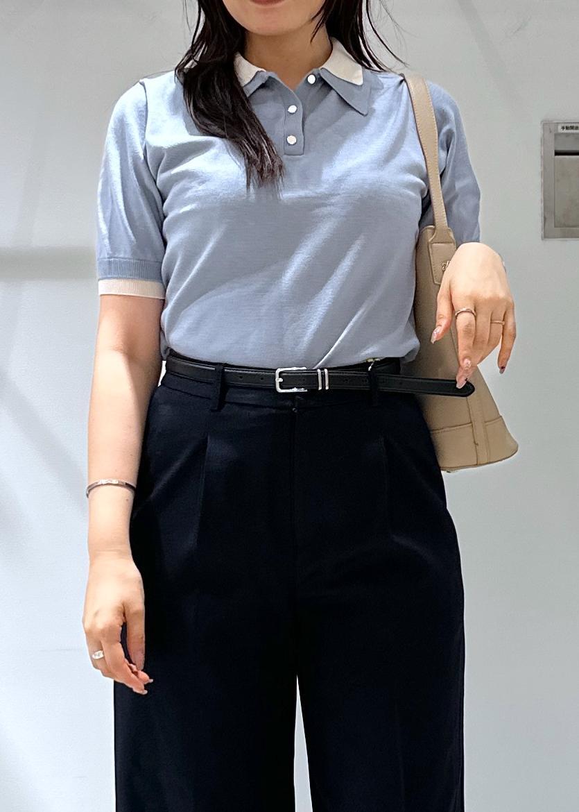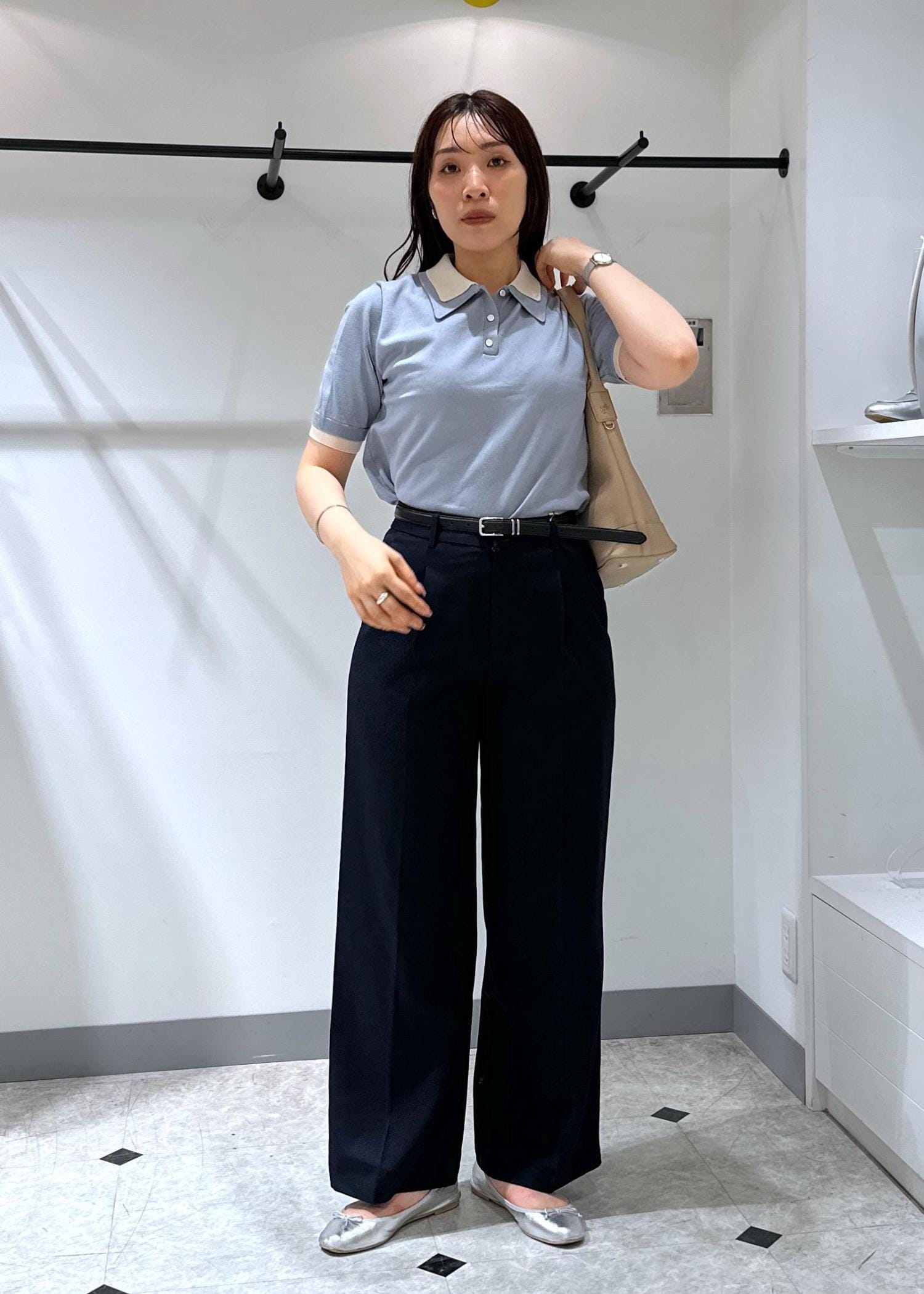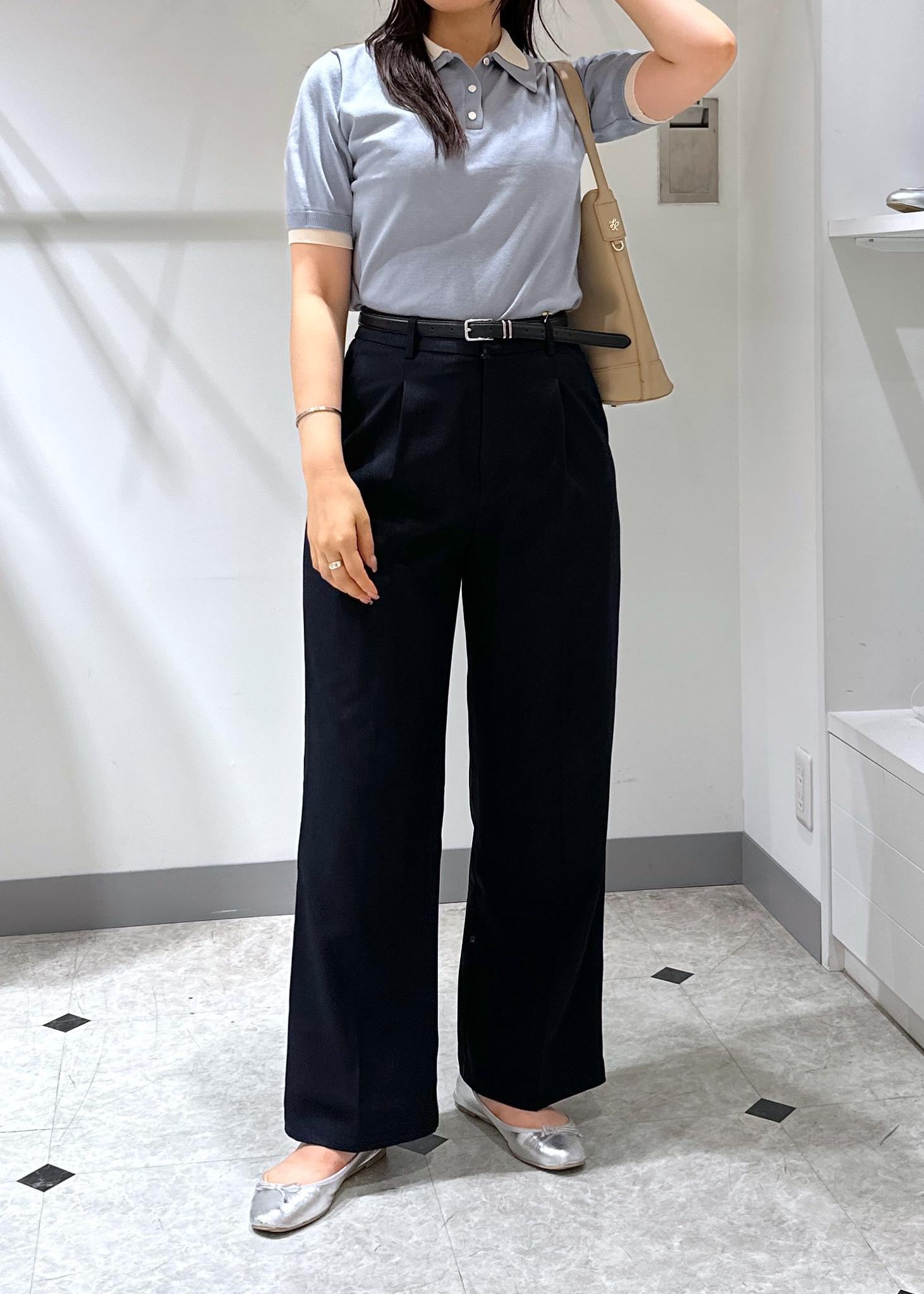人気のレイヤード風ポロニットをきれいめパンツと合わせたコーデ。
