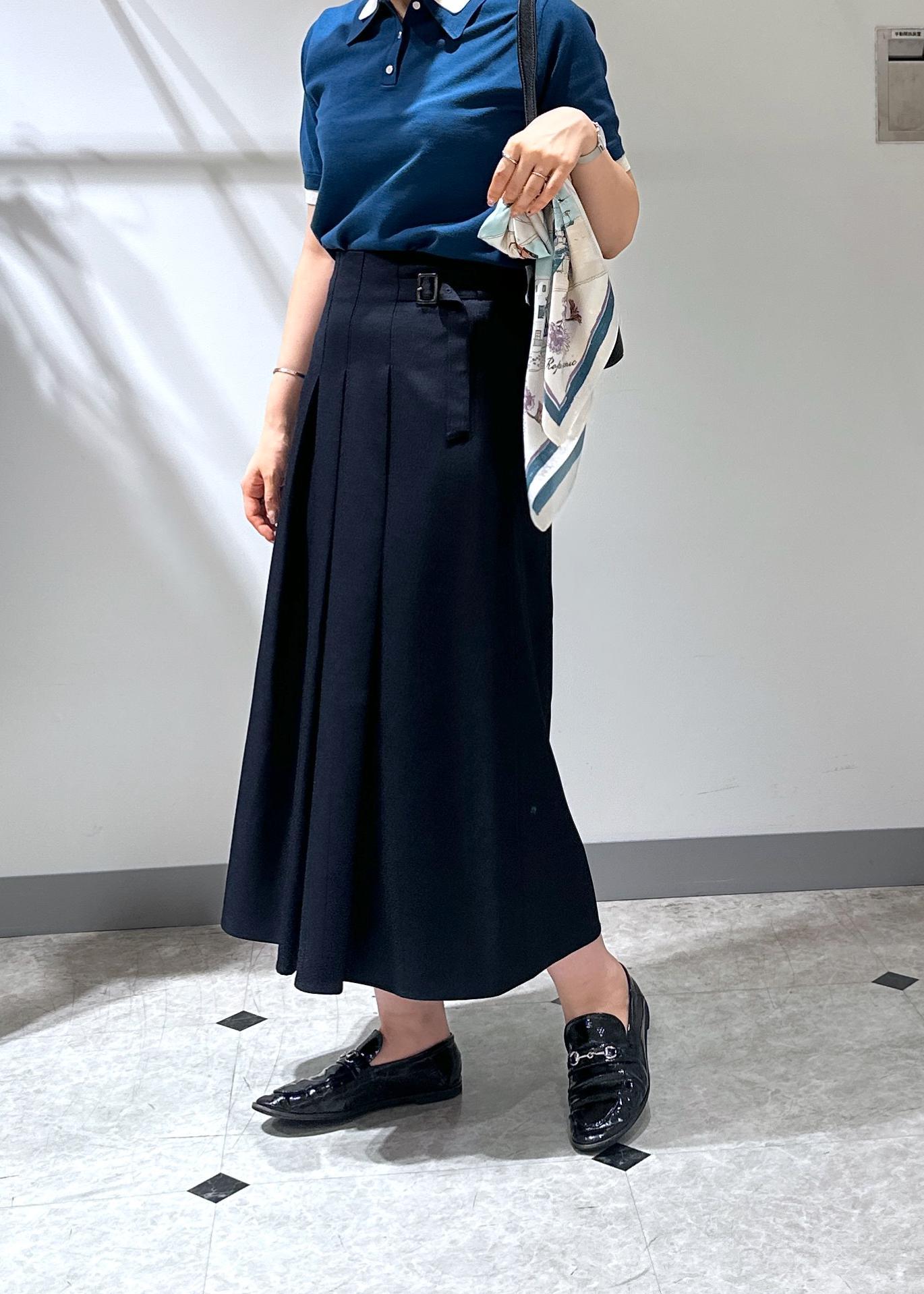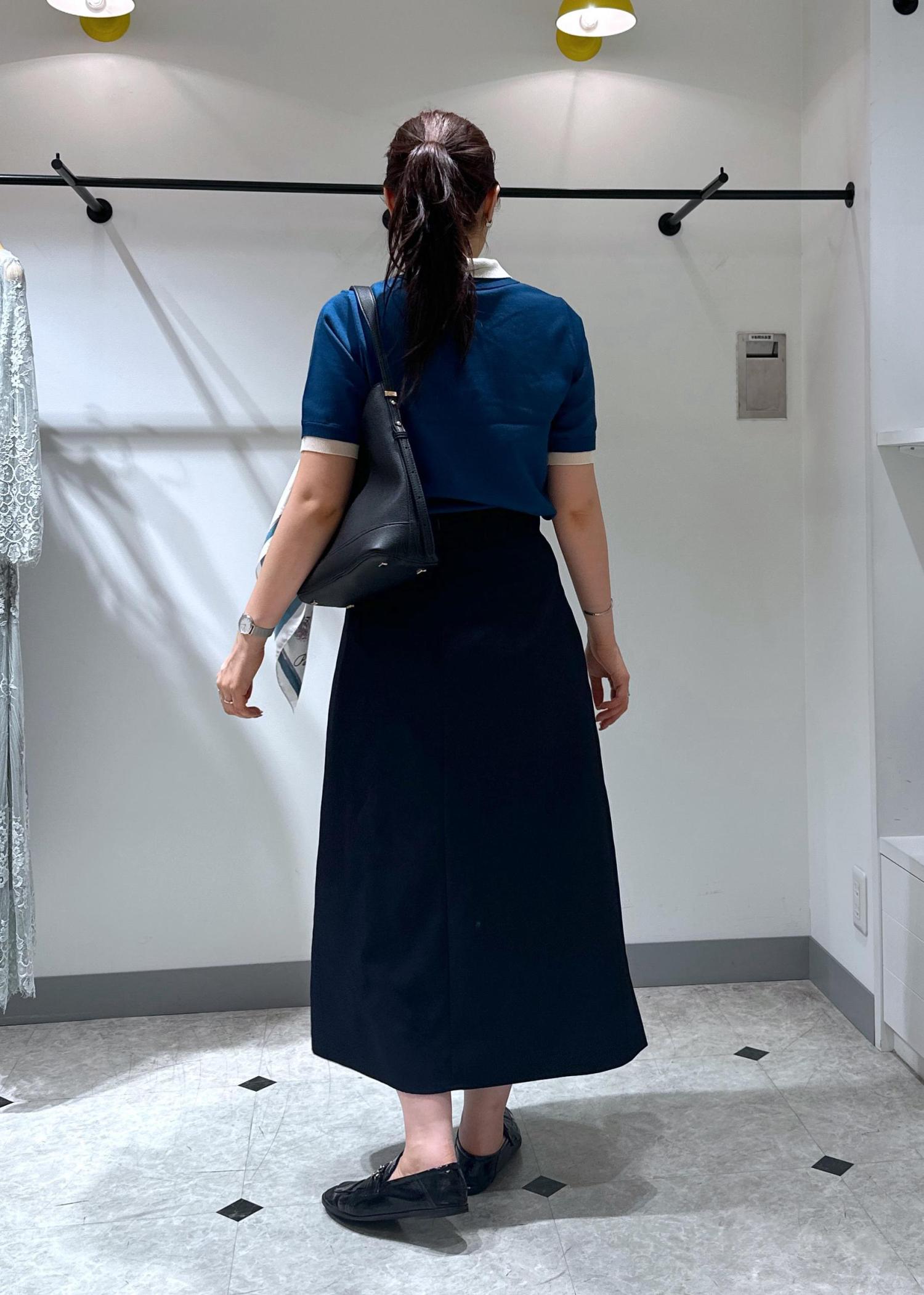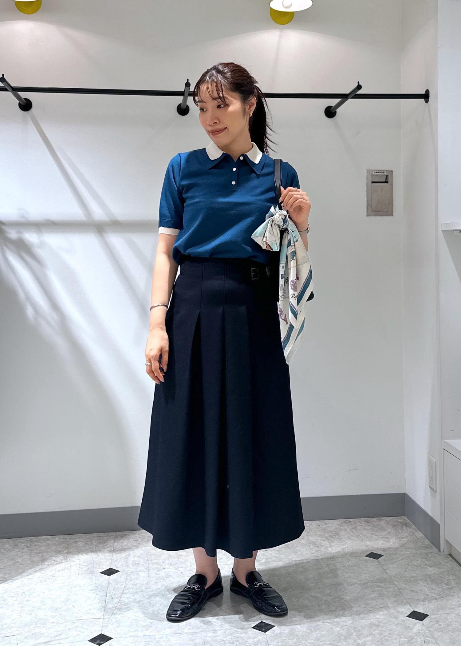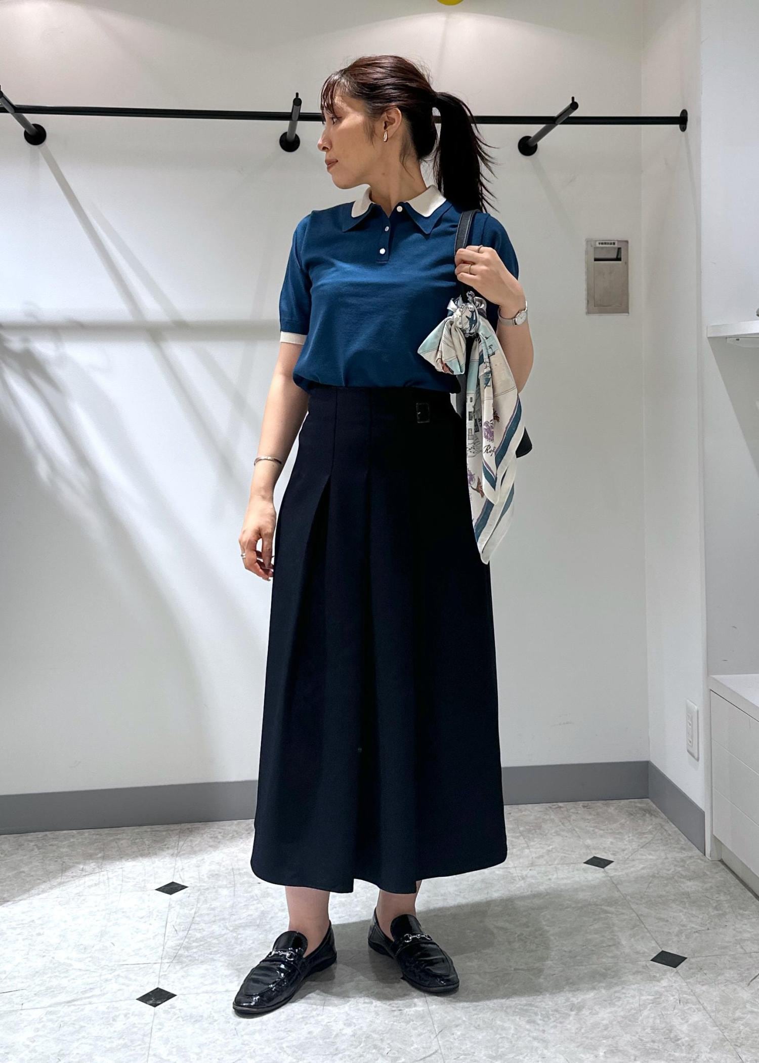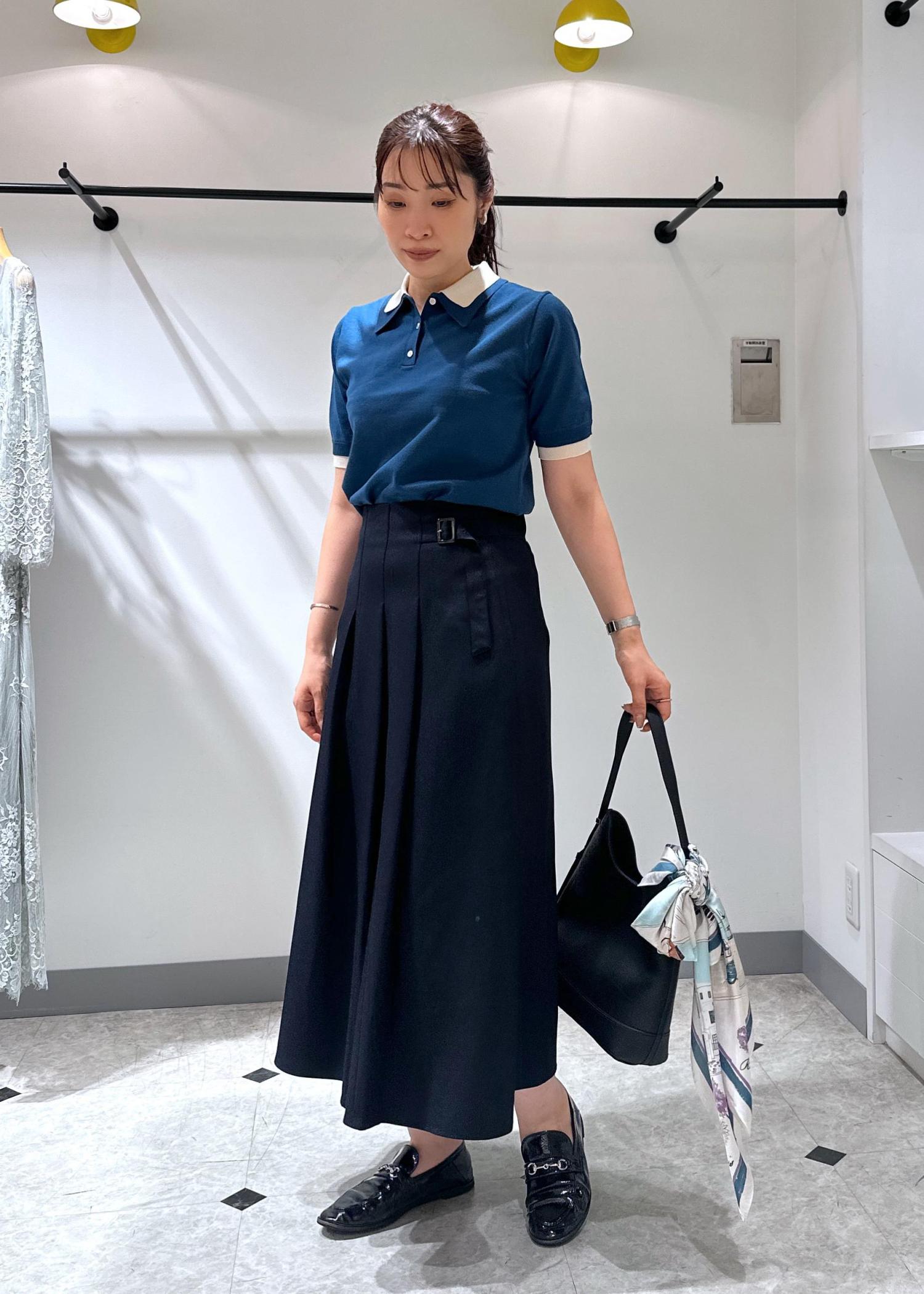 人気のレイヤード風ポロニットとスカートを合わせ、大人も着やすいフェミニンスタイルにしました。