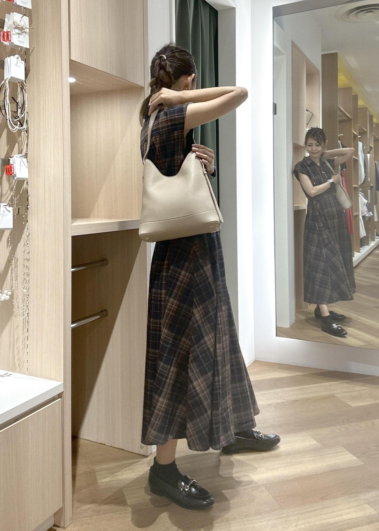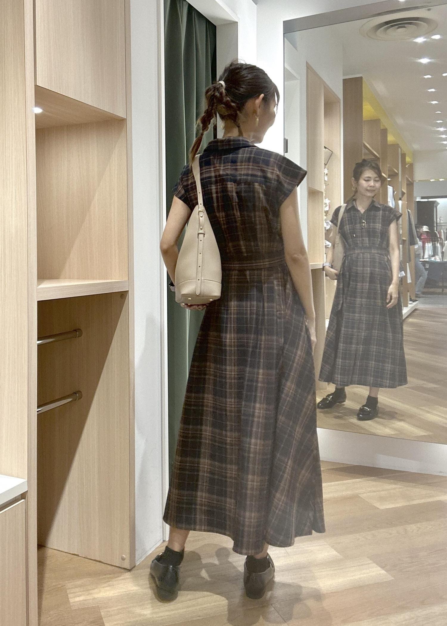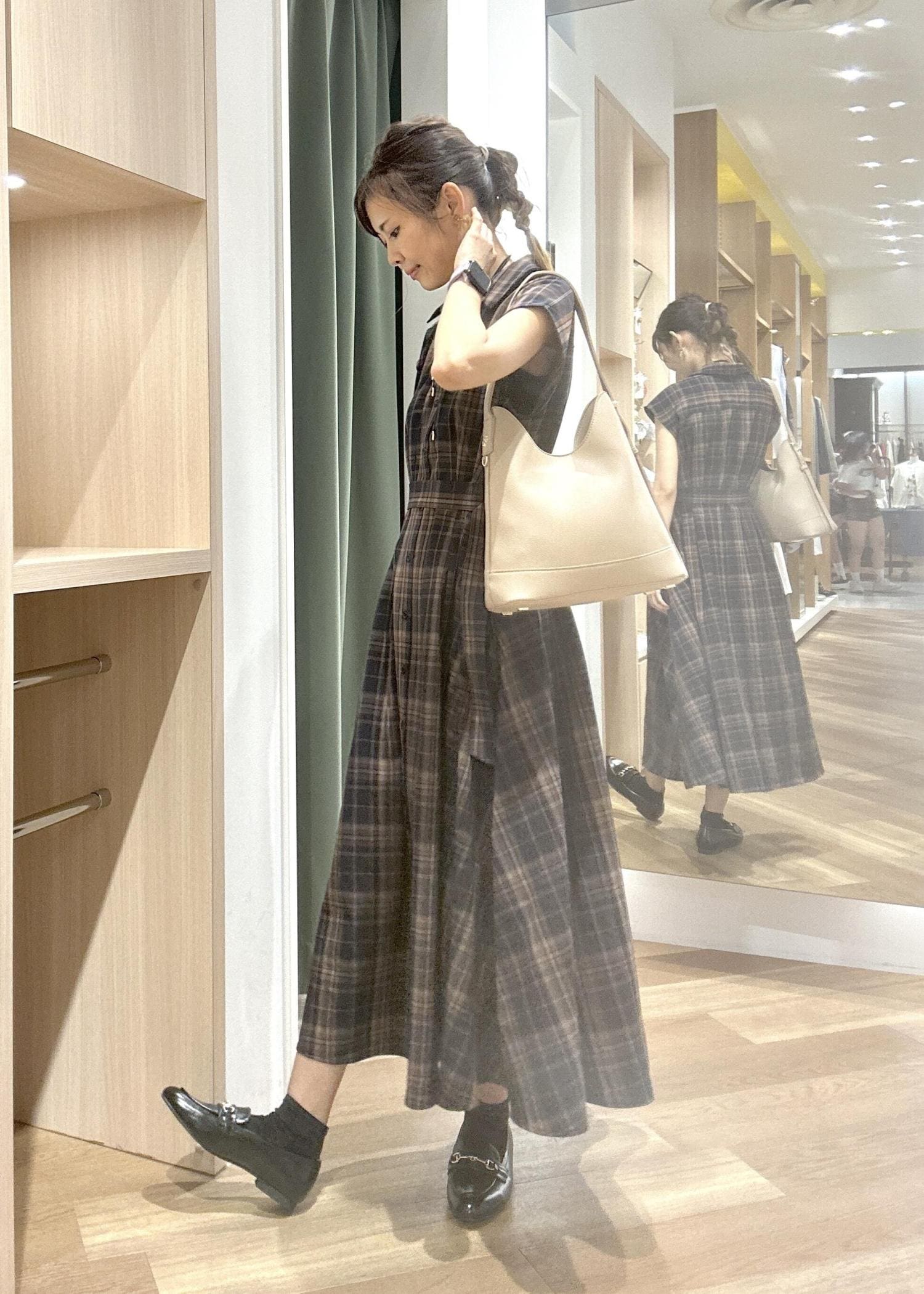 秋らしいチェックの柄を取り入れたワンピースコーデです。ウエストマークでメリハリの効いたシルエットを作り可愛さを演出。フラットローファーで歩きやすく、旅行コーデにもぴったりです!
