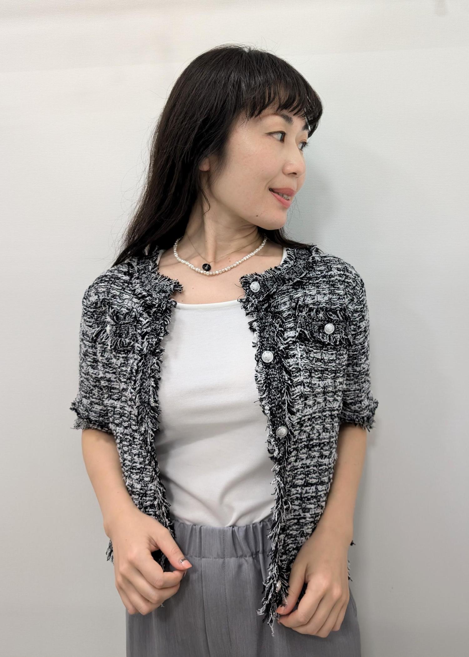 マンネリになりがちなオフィスコーデに華やかさ、お洒落感を出してくれるツイードカーディガン、おすすめです!