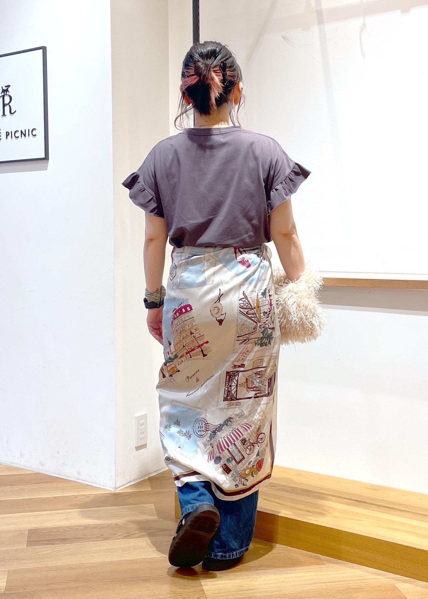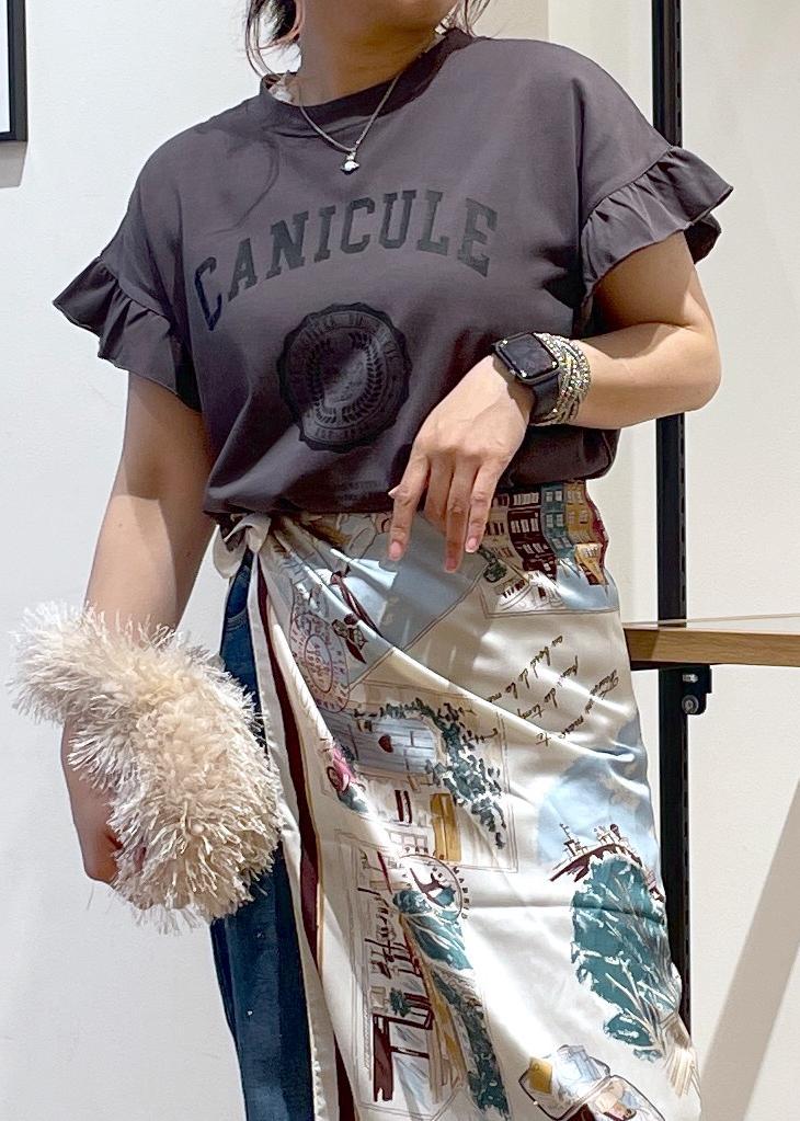 ゆったりとしたシルエットでカレッジロゴが可愛いTシャツです。お袖のフリルも印象的です○スカーフ合わせで大人カジュアルスタイルにしてみました。