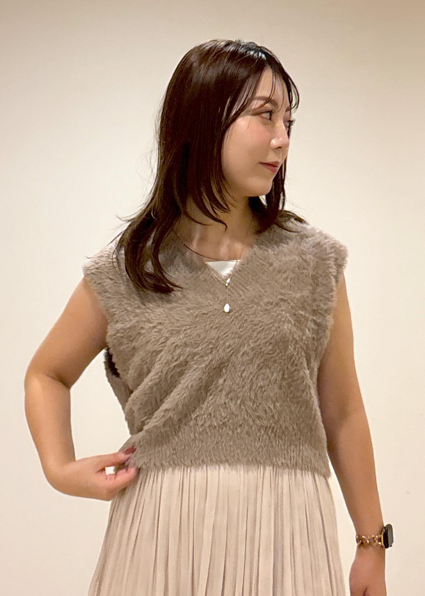 ROPÉ PICNICショートフェザーニットベストベージュ / F¥3,993レビューラメが入っていますが柔らかな素材でチクチク感はなかったです。程よくコンパクトでハイウエストボトムやワンピースと相性いいです。