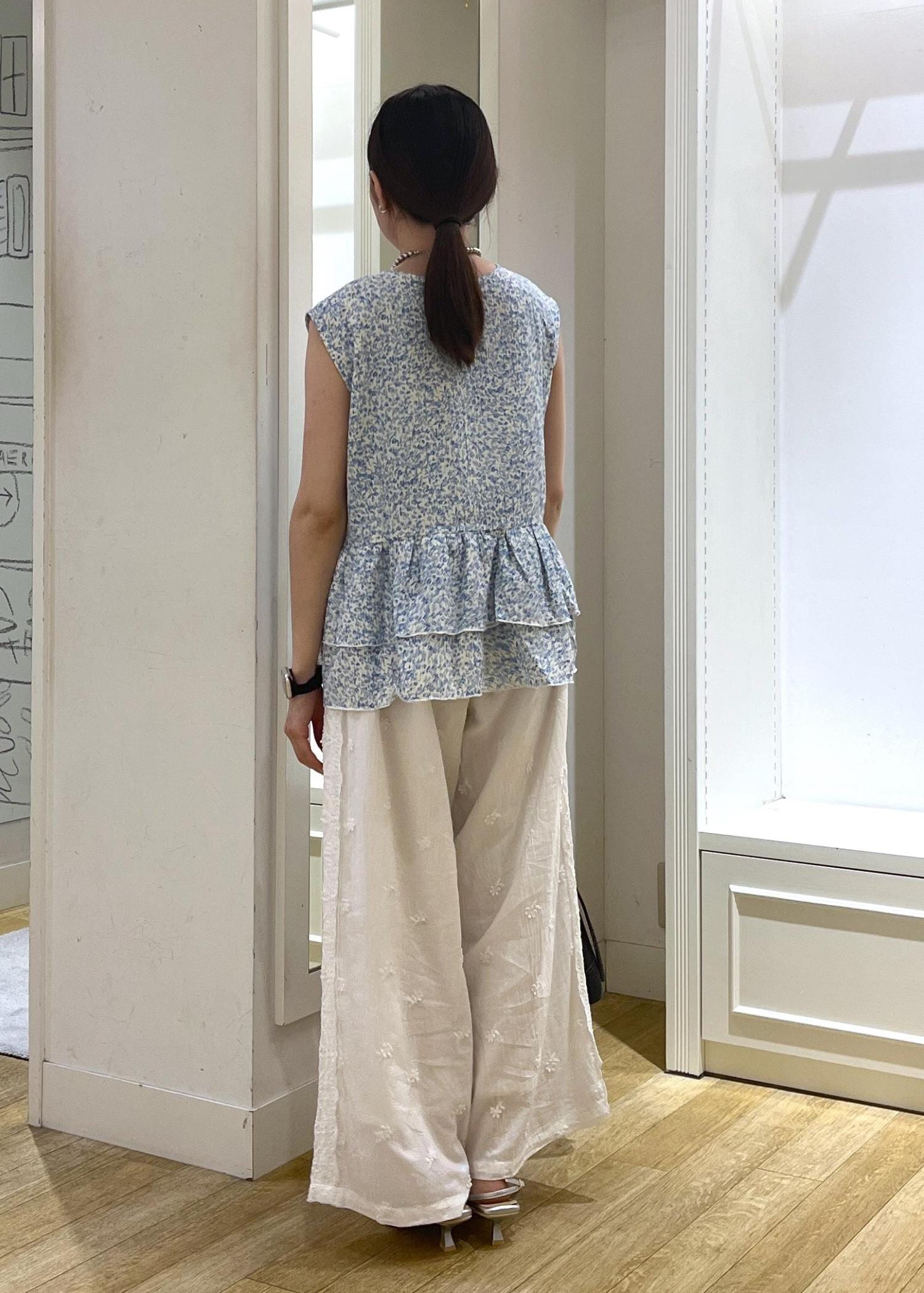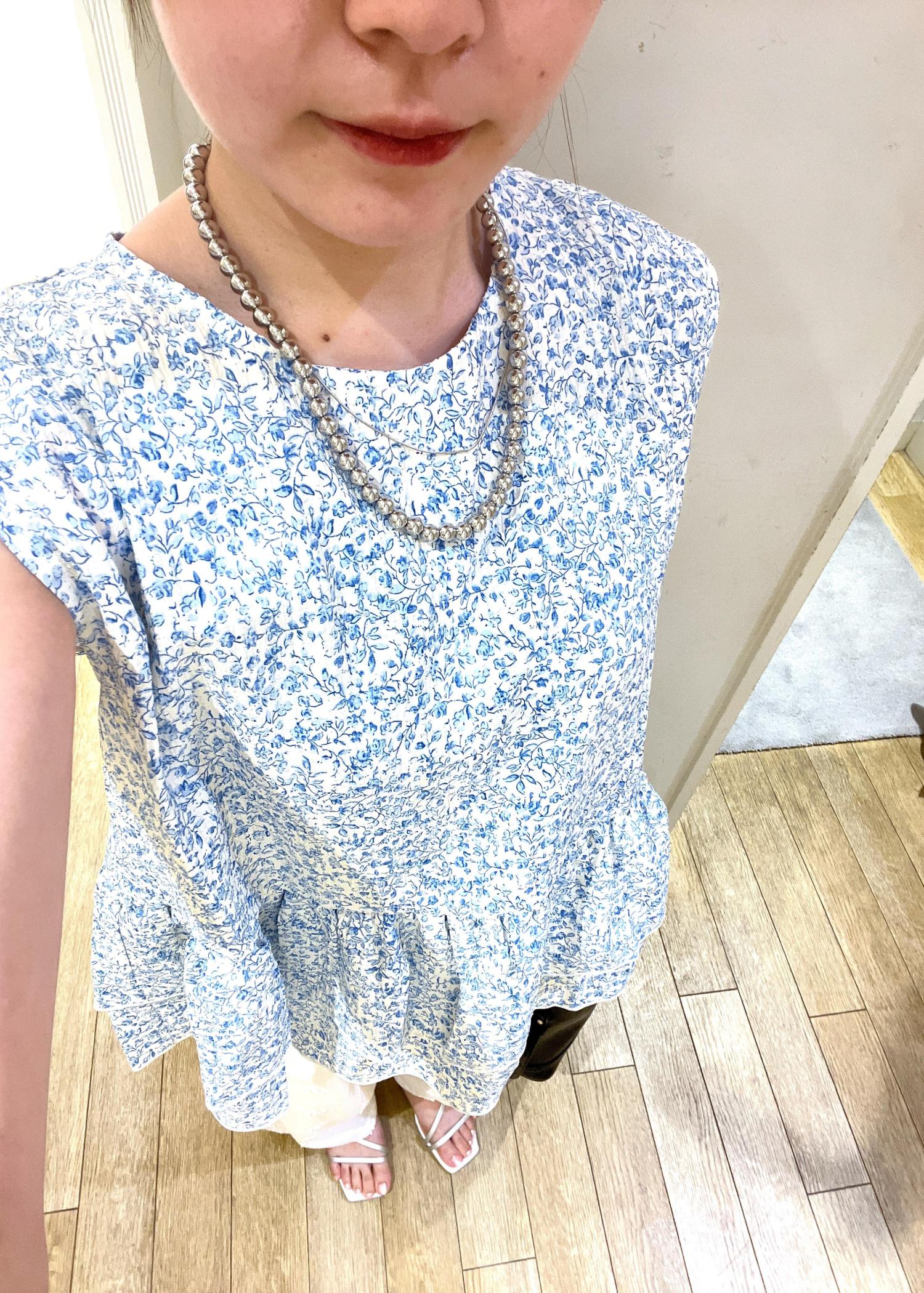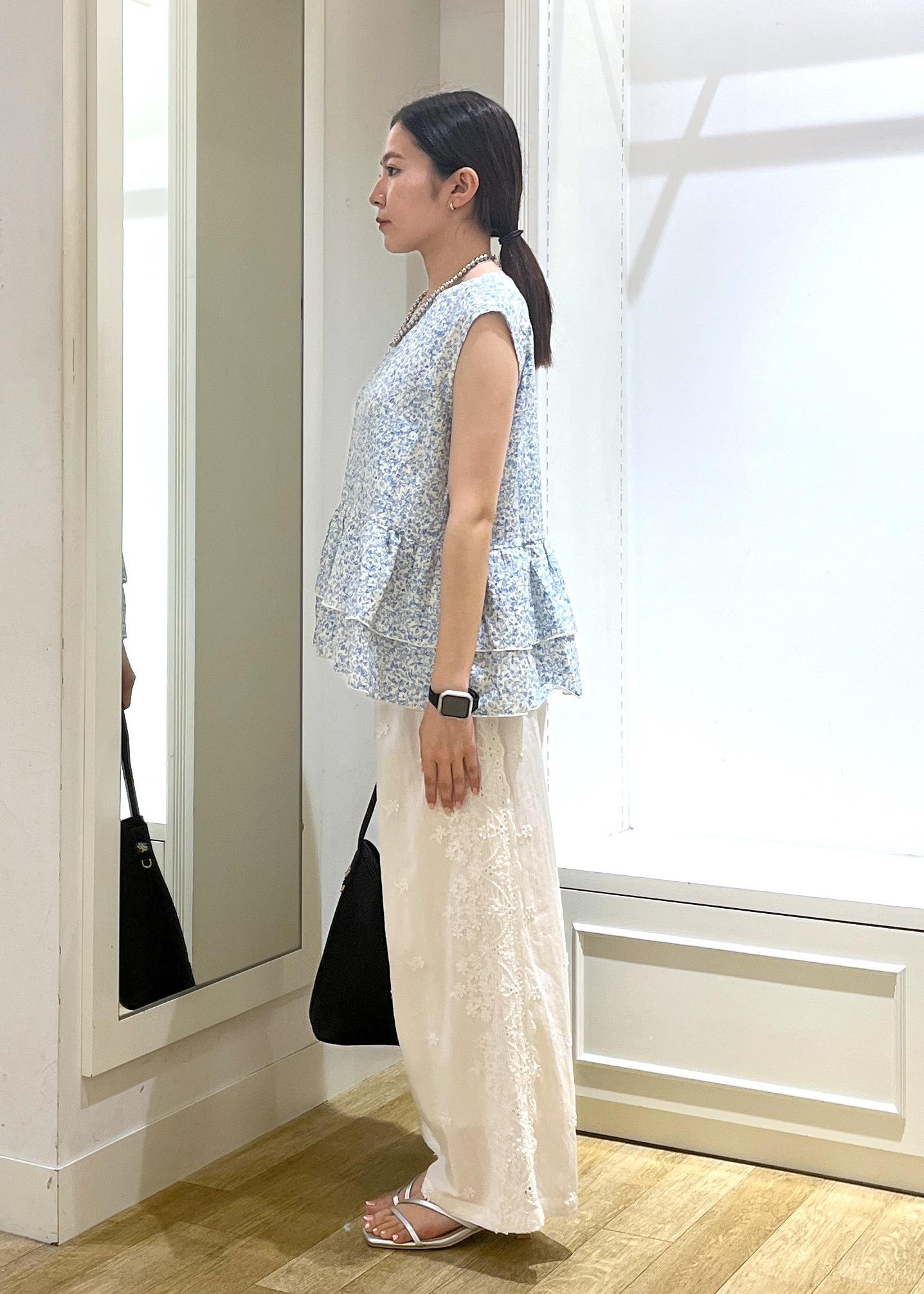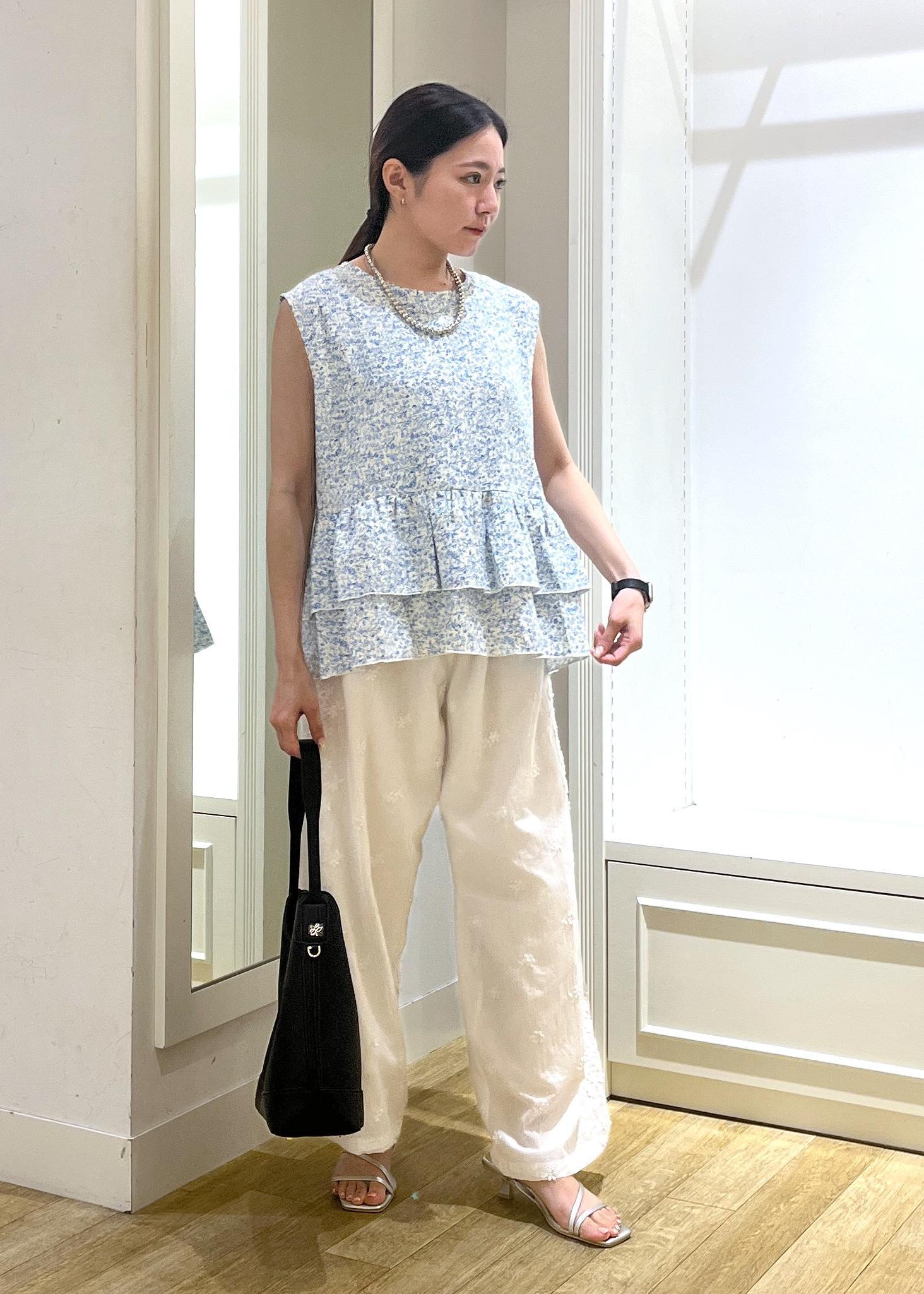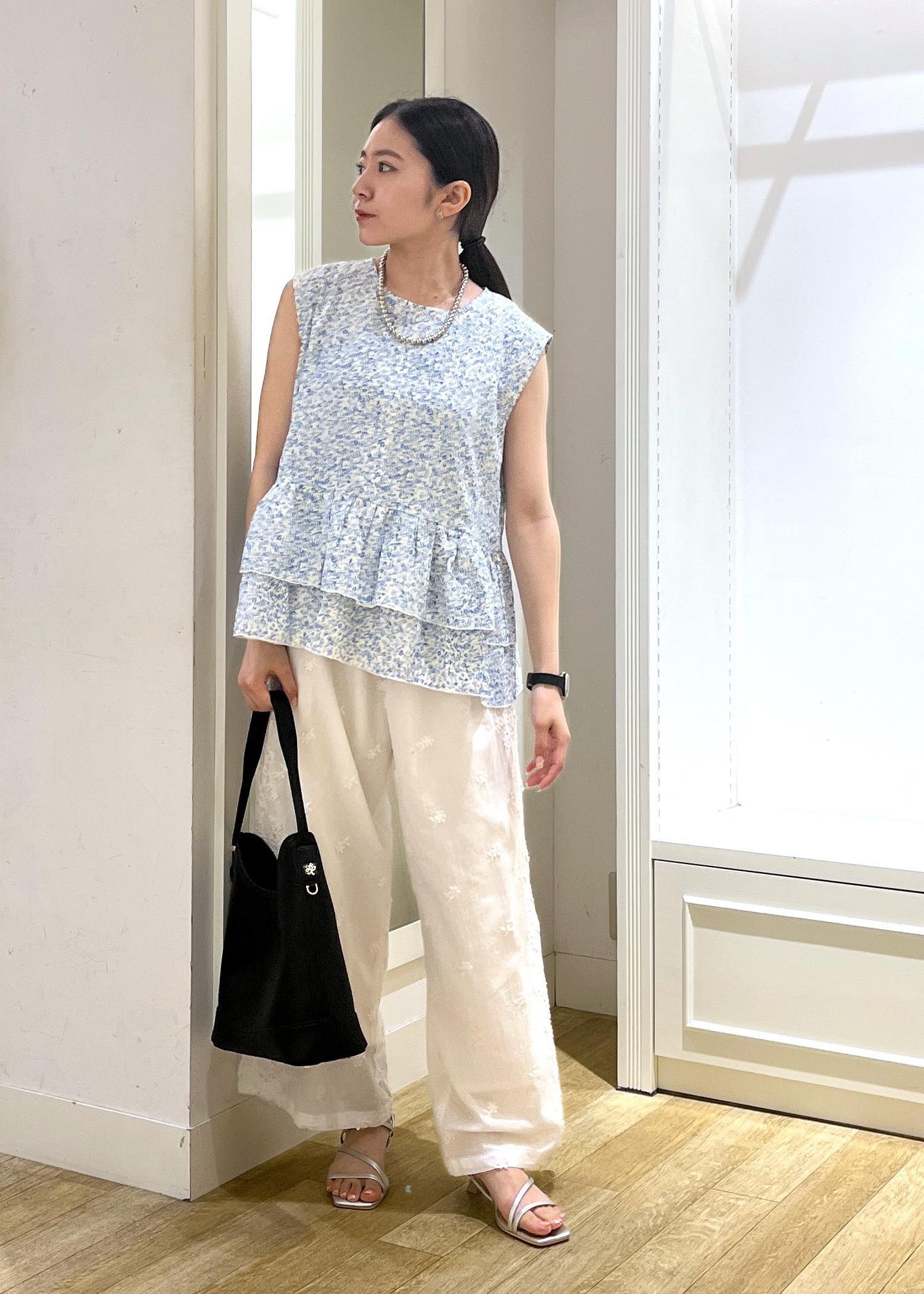 ブルーの小花柄のトップスをメインにしたコーディネートです。