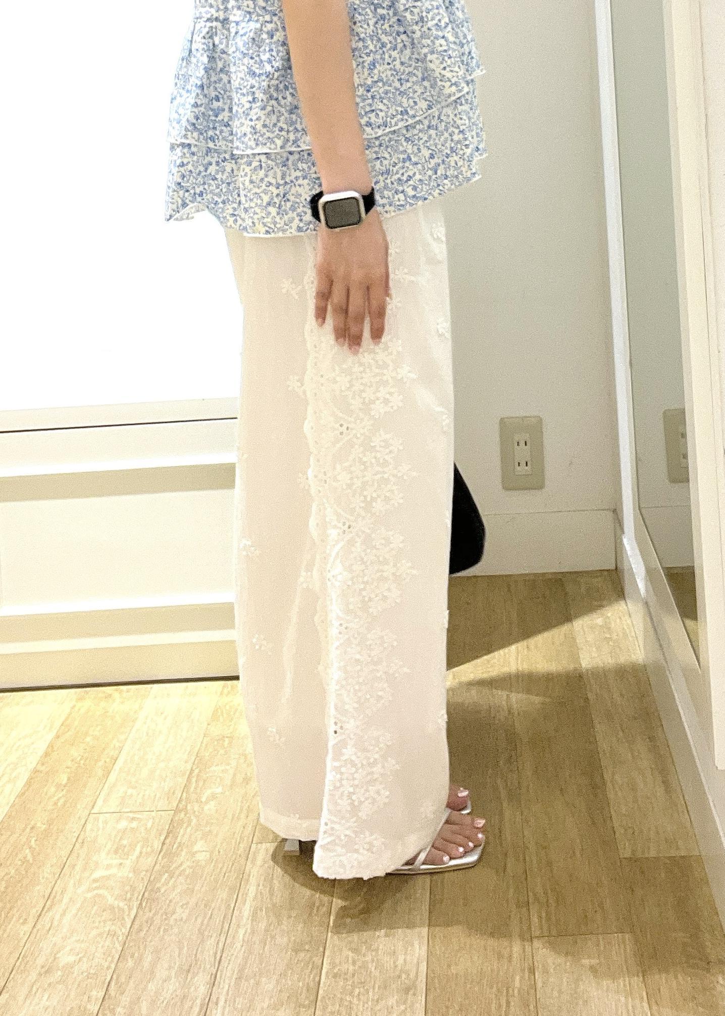 夏らしさをだす為に、ボトムスは白色のカラーにしました。ボトムスはそのままでも着用できますが、スッキリ見せたかったのでウエストを1回曲げています!